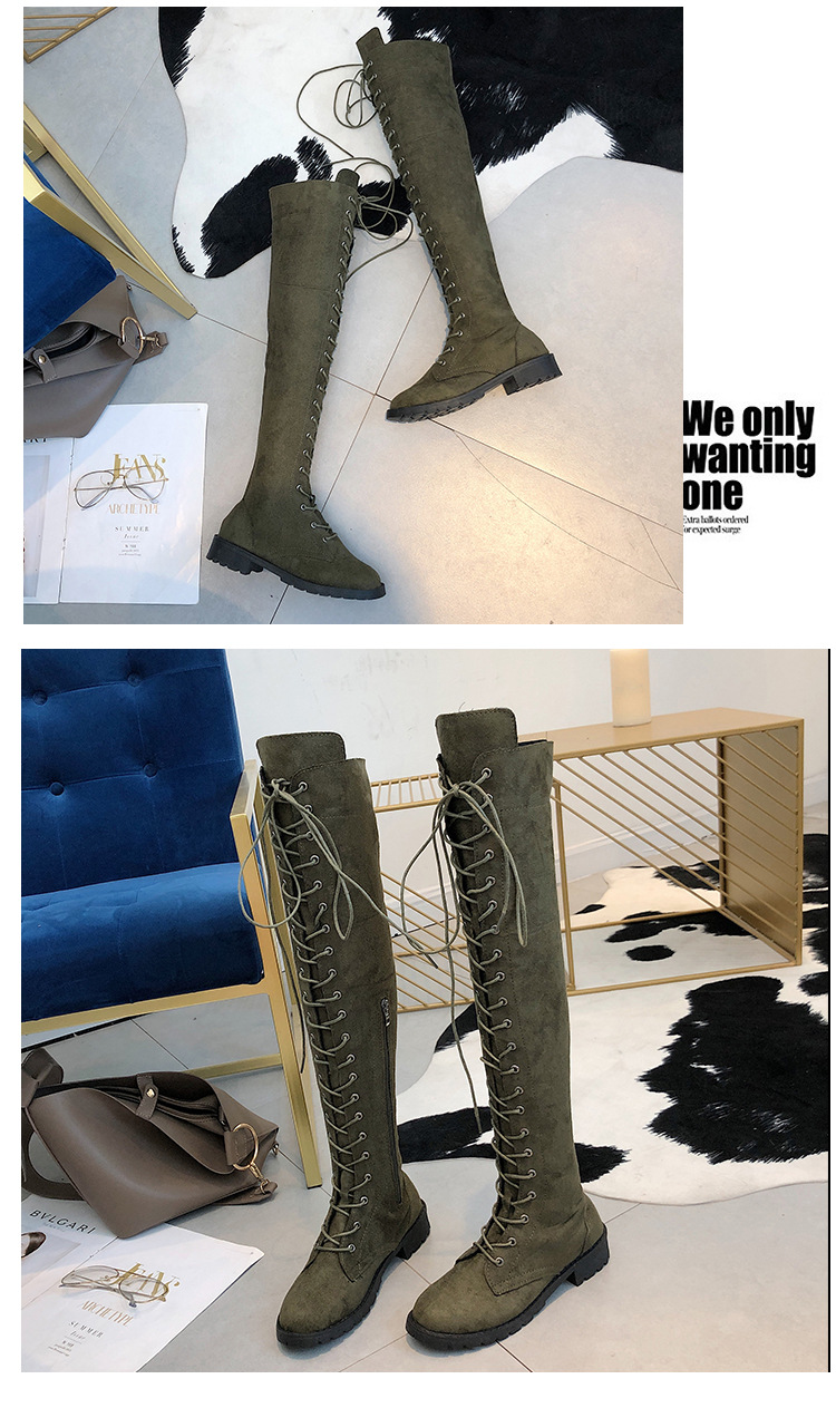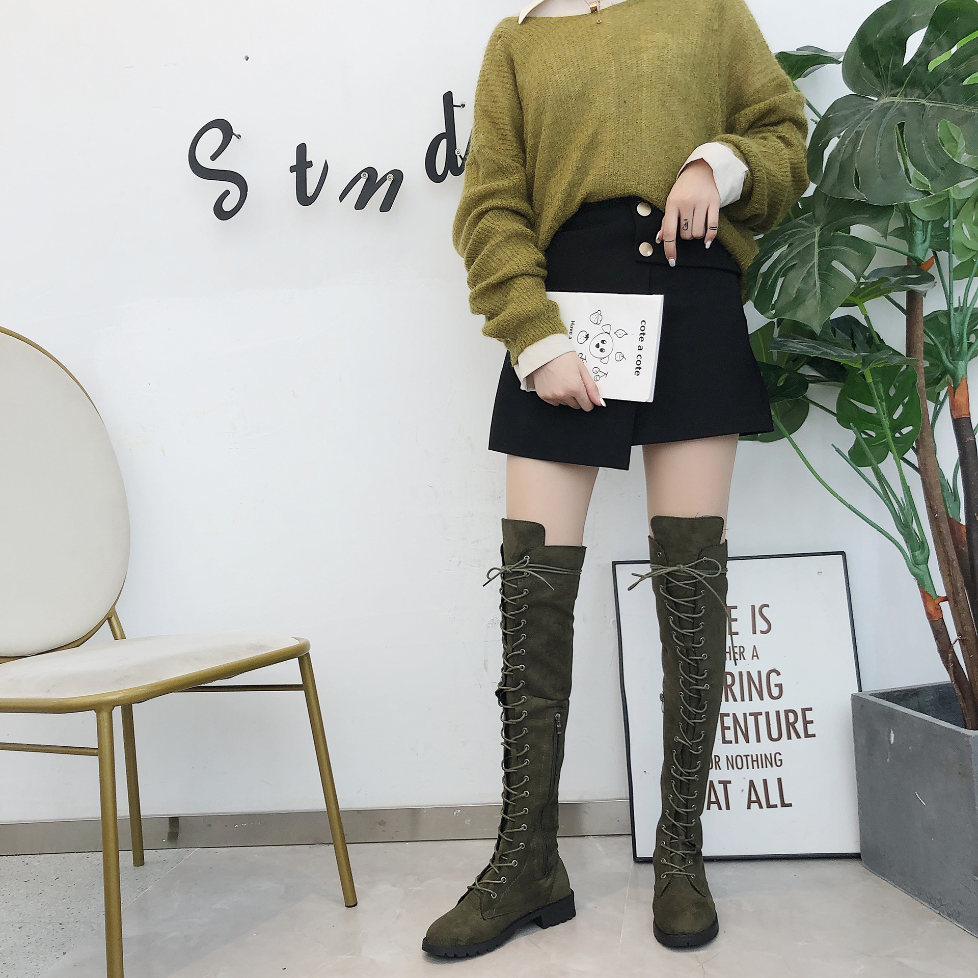 细带大码过膝长靴2019秋季新款大码欧美圆头平跟显瘦百搭女靴