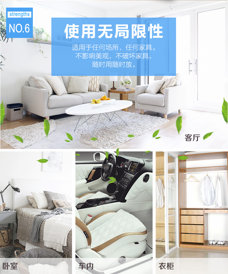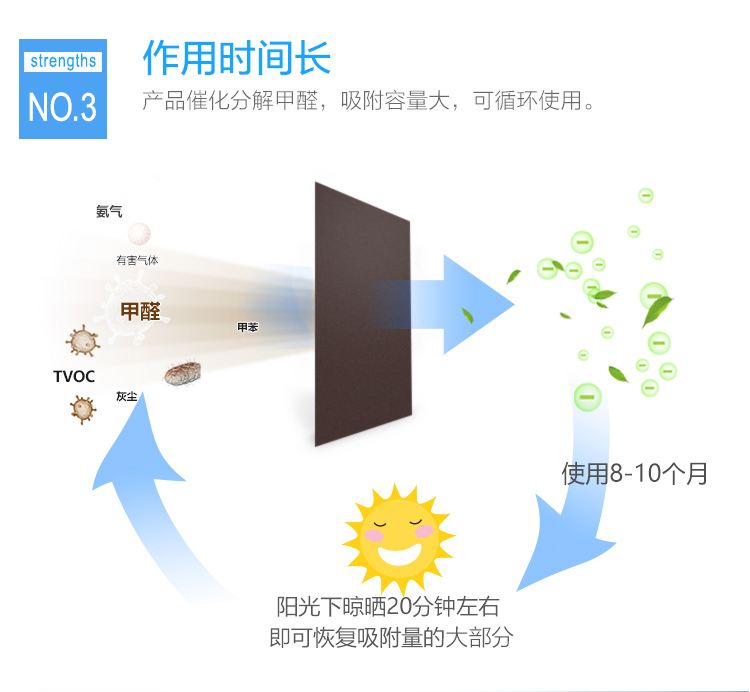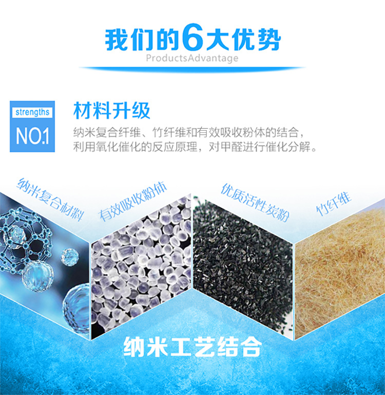 优质椰壳活性炭,纳米级高密度孔径,360°循环,超强主动吸附,快速处理,除甲醛,除味,抑菌,释放新鲜干净空气。3年免晒,循环使用,比普通的强百倍,适用急需新家入住的人群。