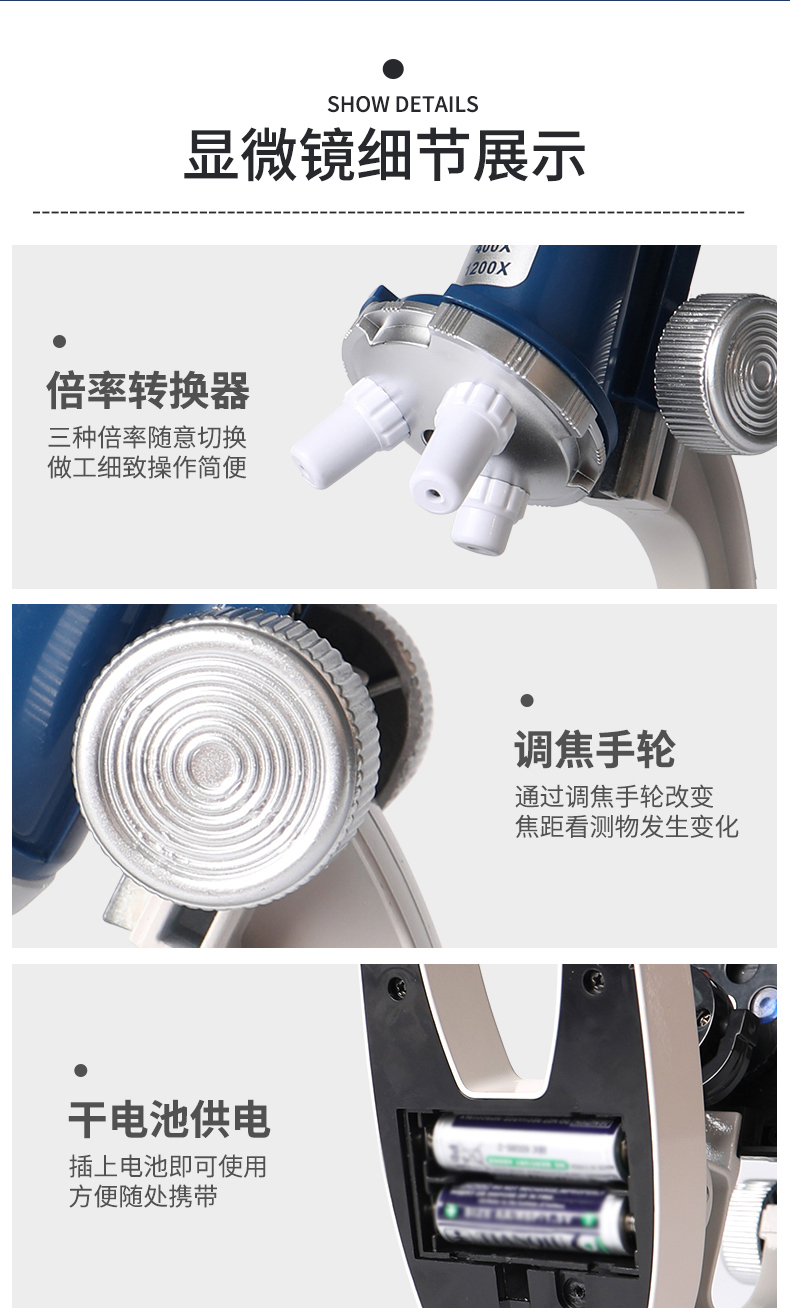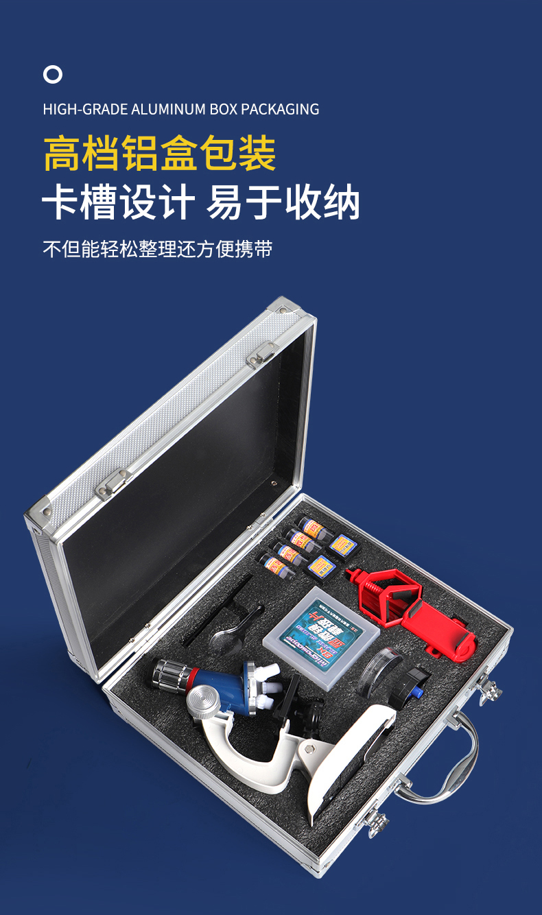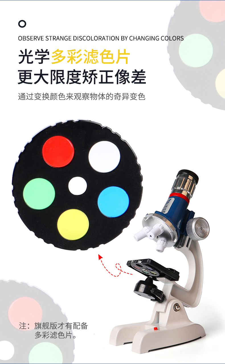 倍率转换器,调焦手轮,干电池供电,光学多彩滤色片,更大限度矫正像差!