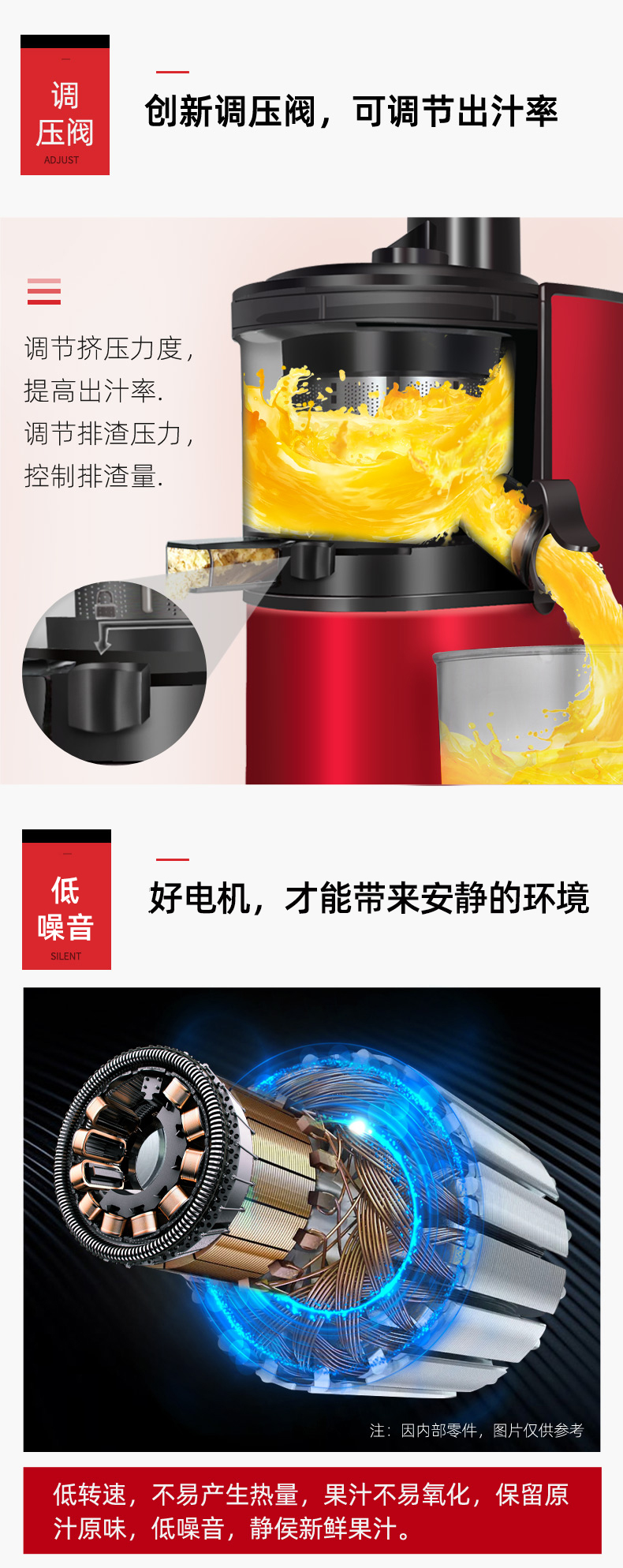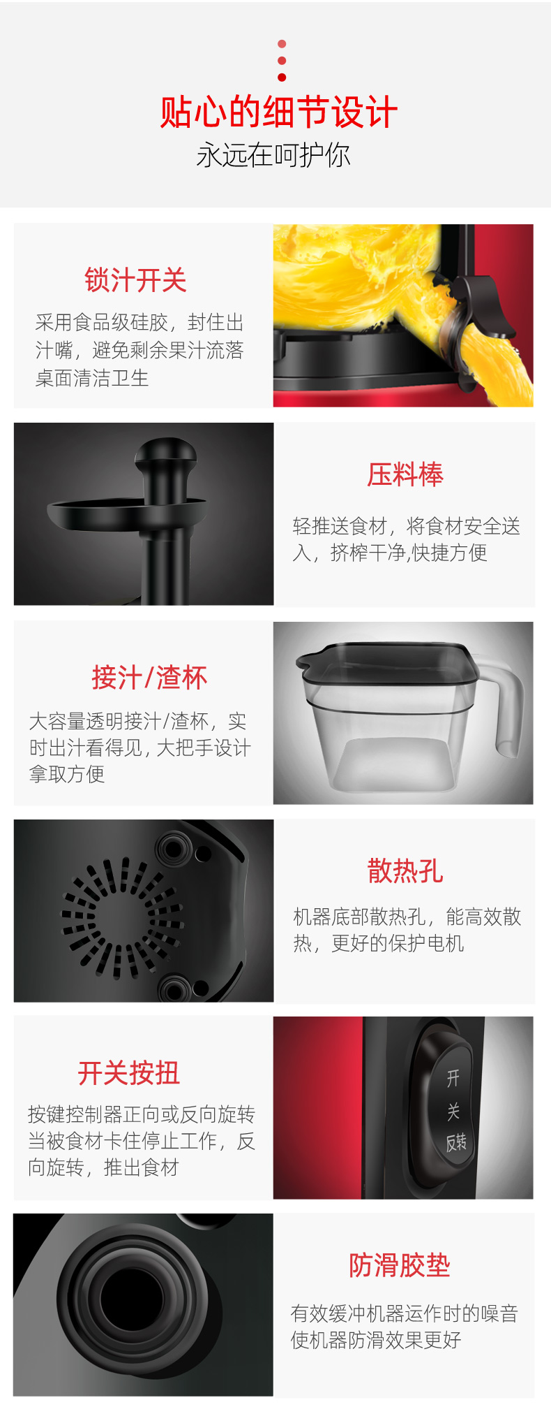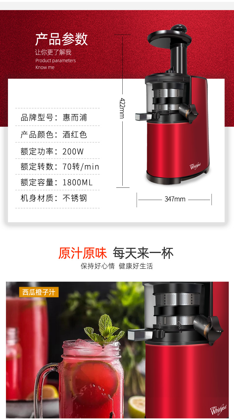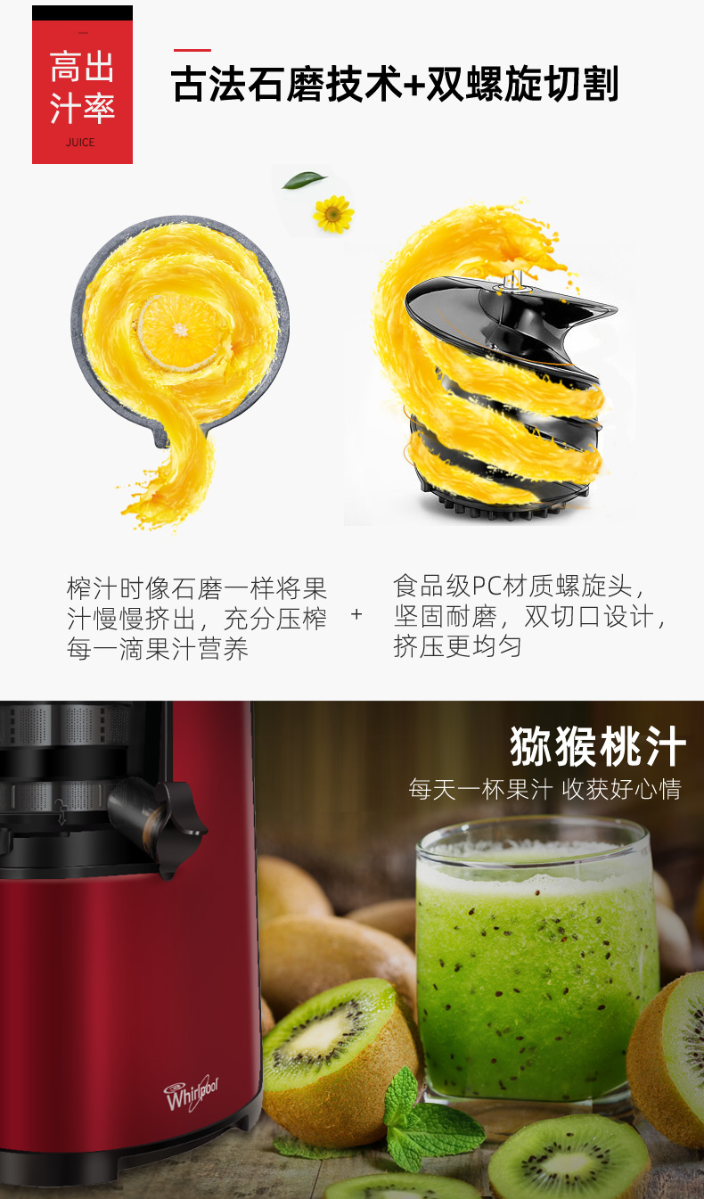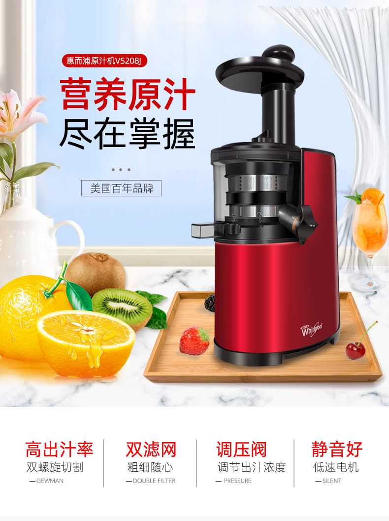 美国惠而浦VS208J原汁机。新一代原汁机,强大功能玩转水果,双进料口免刀切,90%出汁率,全程无需加水!自动分离果渣!减少果肉与空气接触,降低氧化,每天一杯鲜榨果汁,补充人体营养。