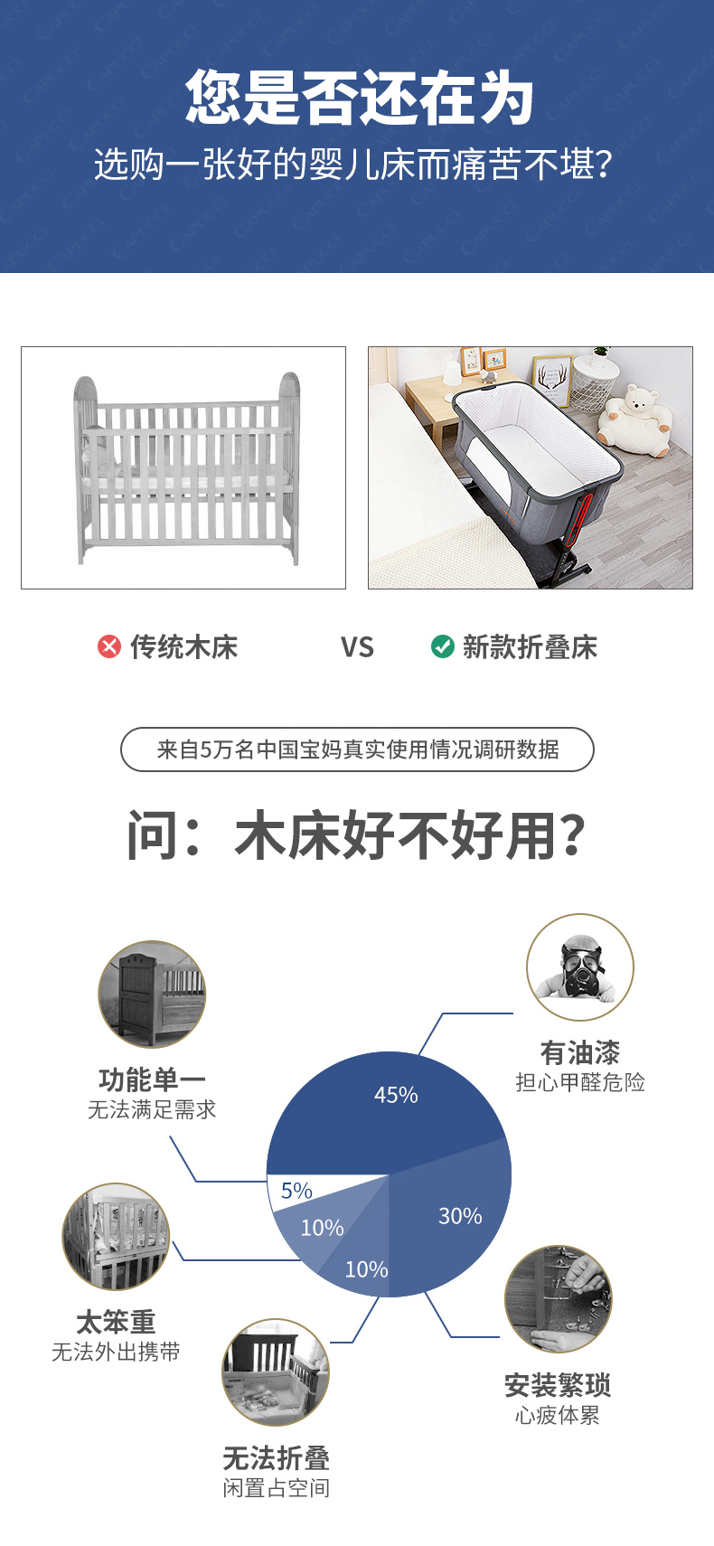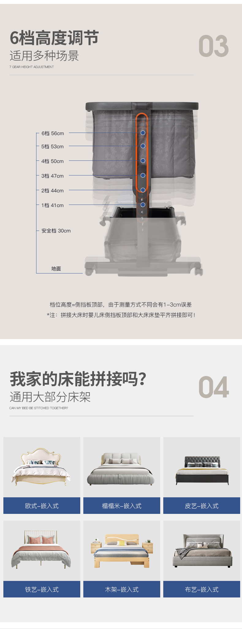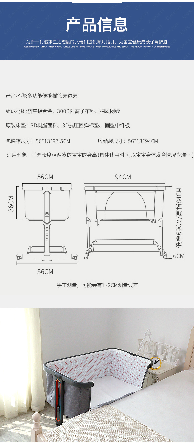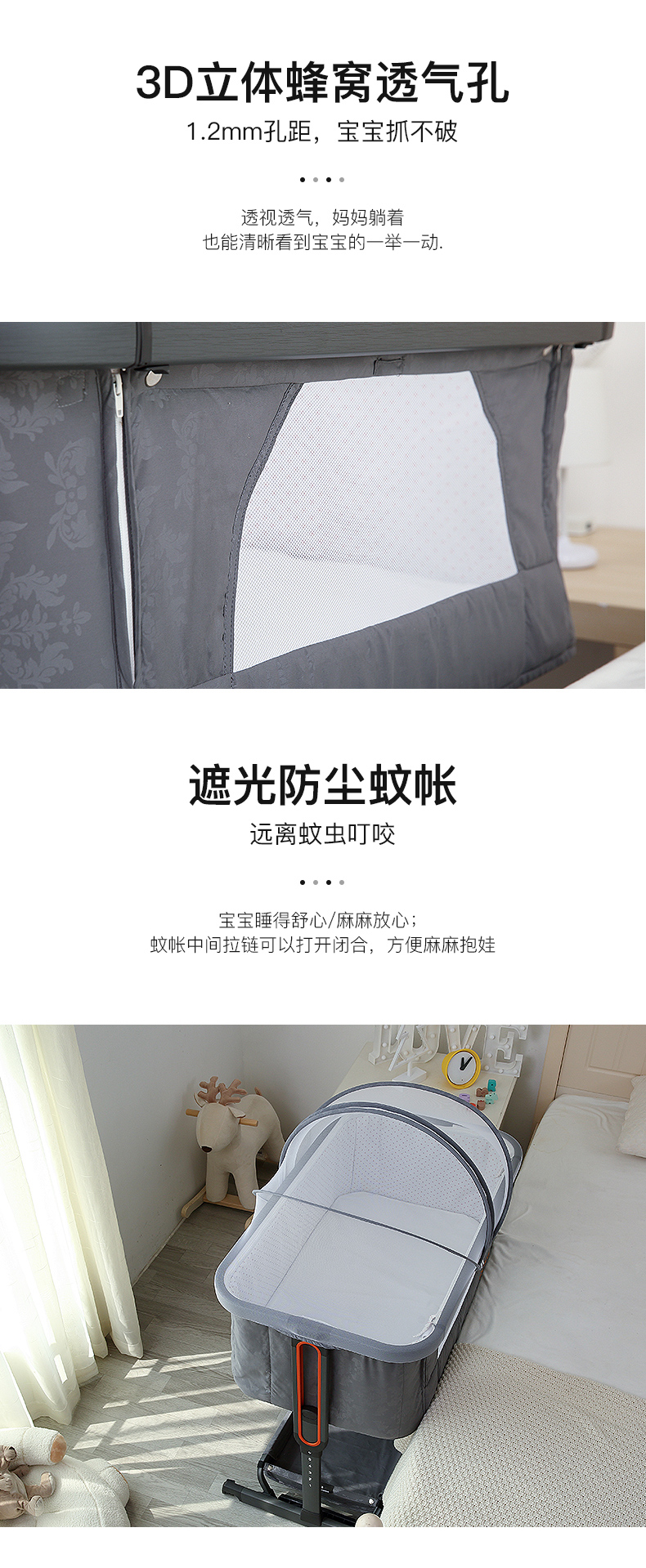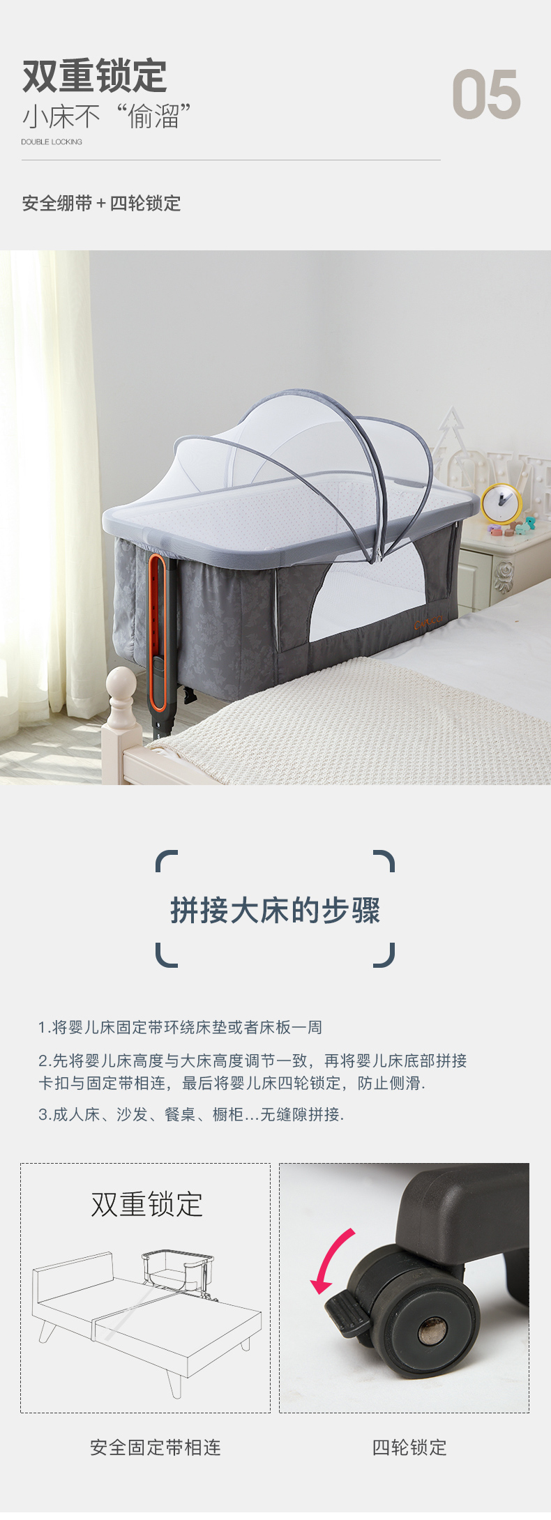 【美国潮牌,限量赠送蚊帐/床垫】木纹烤漆金属床沿,一擦即净;加大置物篮,宝宝用品一装到底,无油漆,远离甲醛,6档高度调节,适用多种场景,安全绷带+四重锁定,小床不再‘偷溜’,便携多功能一体,专