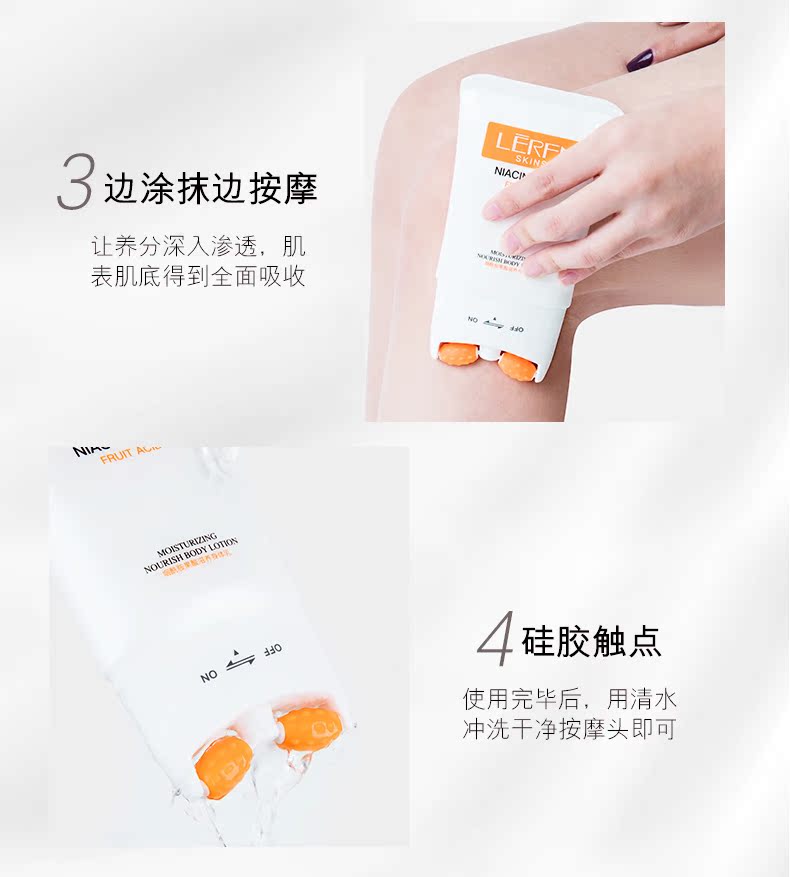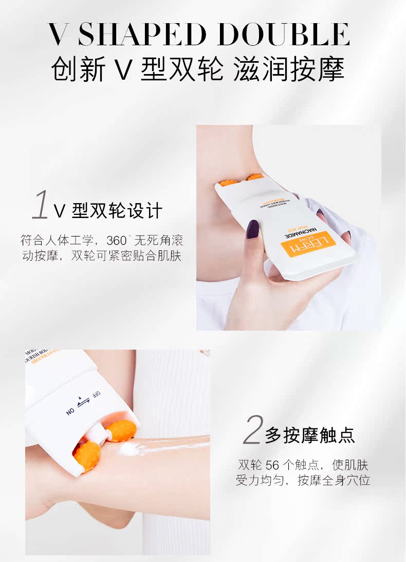 拍一发二送同款!一款可以按摩的身体乳,新升级360°V型双滚轮,滚动全身SPA级按摩,硅胶按摩触点,促进吸收!补水保湿,改善鸡皮不伤肤!有效防止秋冬皮肤紧绷、起皮、干裂等问题,还持久留香哦!!!