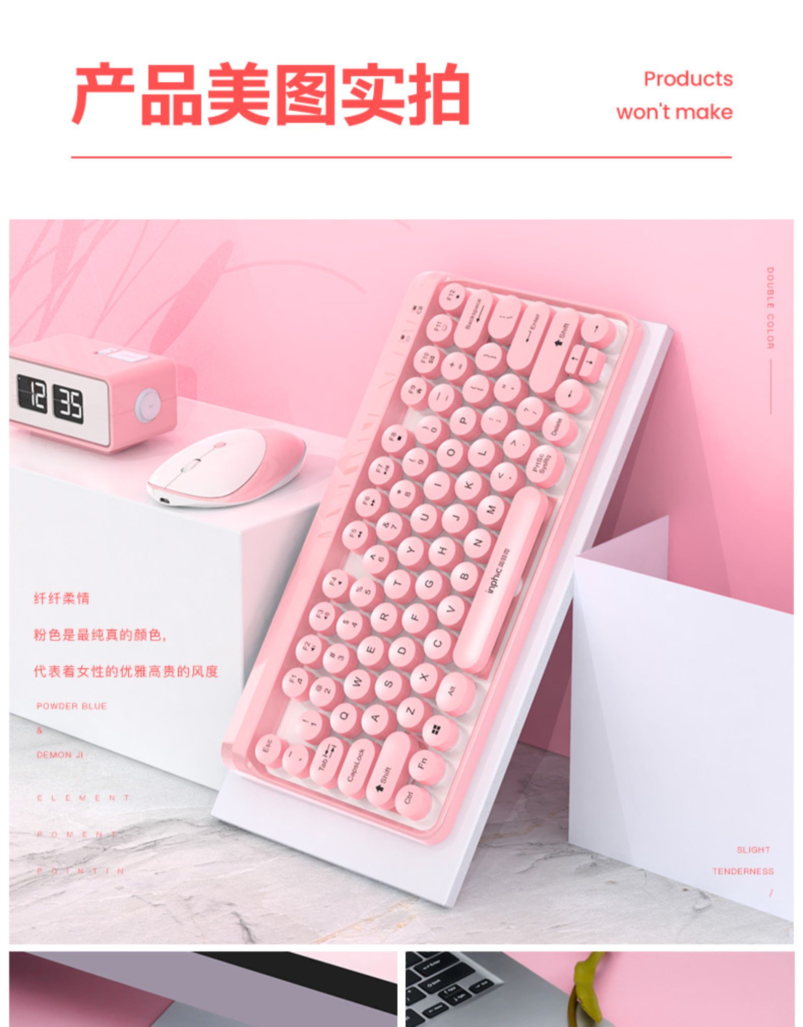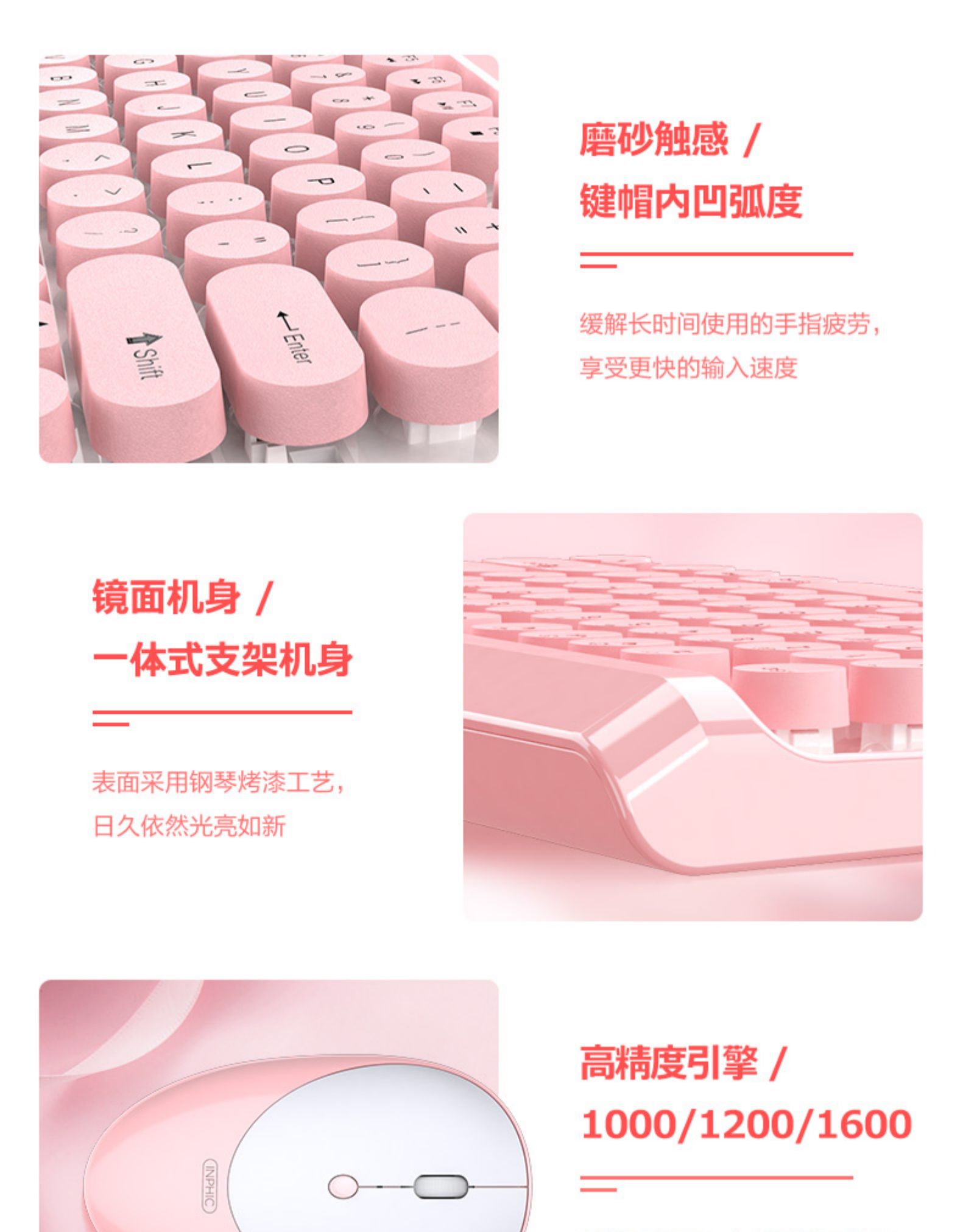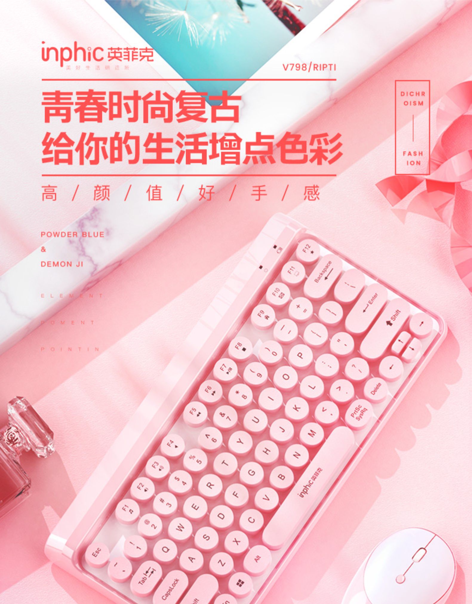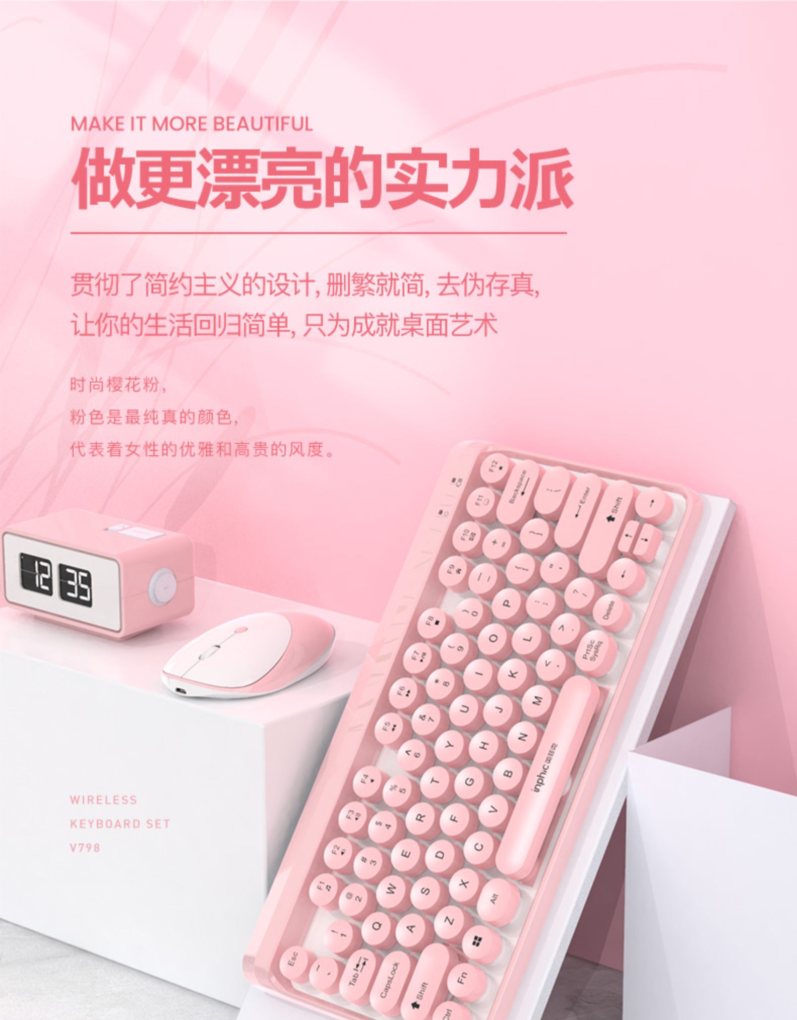 英菲克V798充电无线键盘鼠标套装电竞游戏无声台式电脑笔记本外接办公家用时尚朋克复古女生可爱粉色机械手感