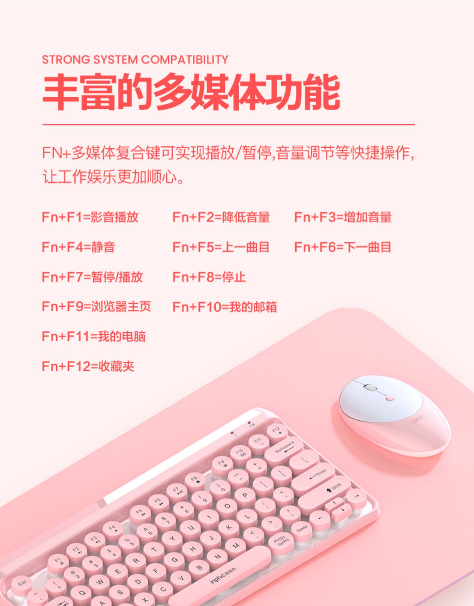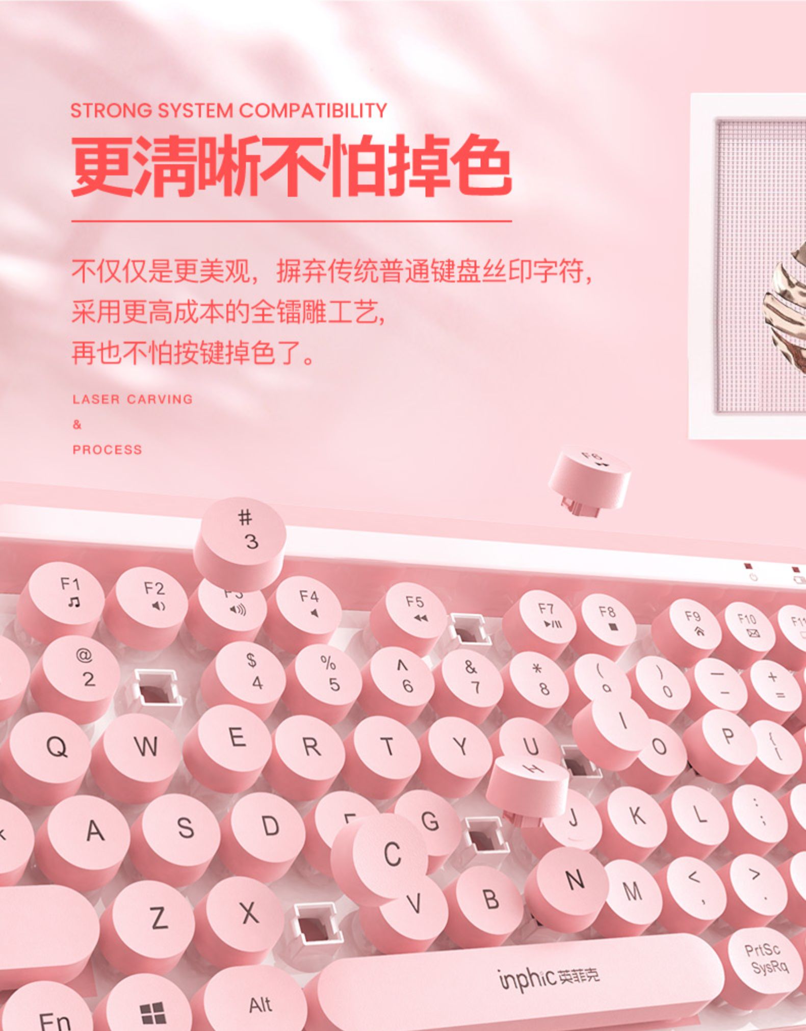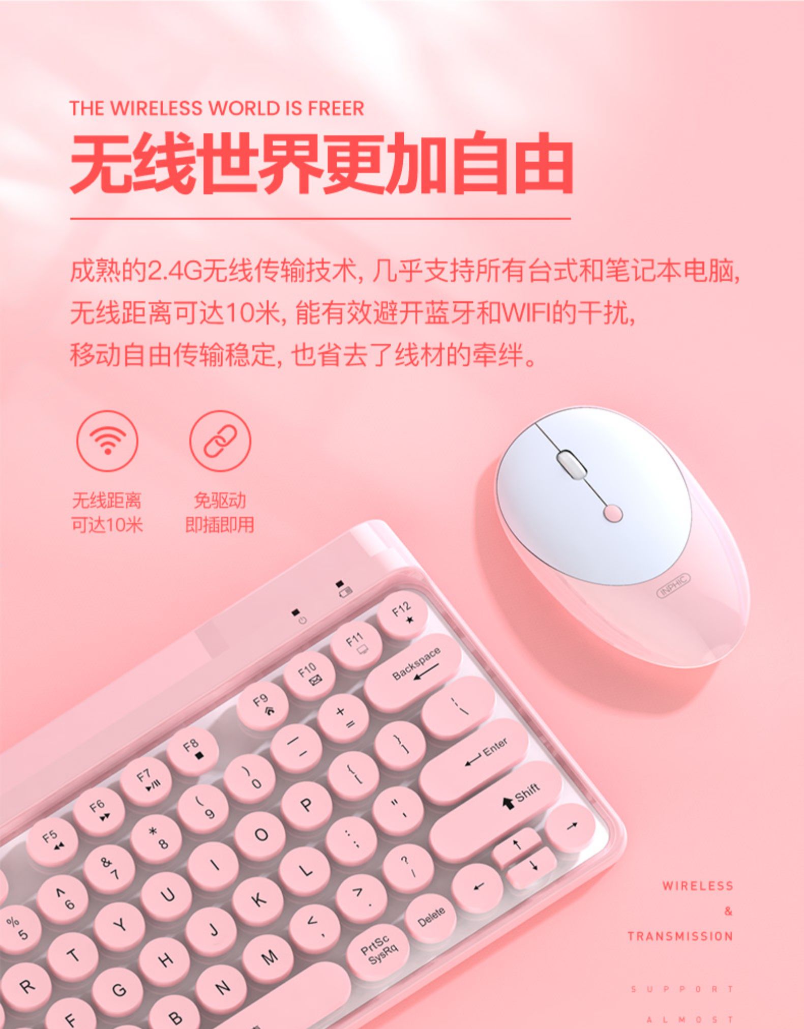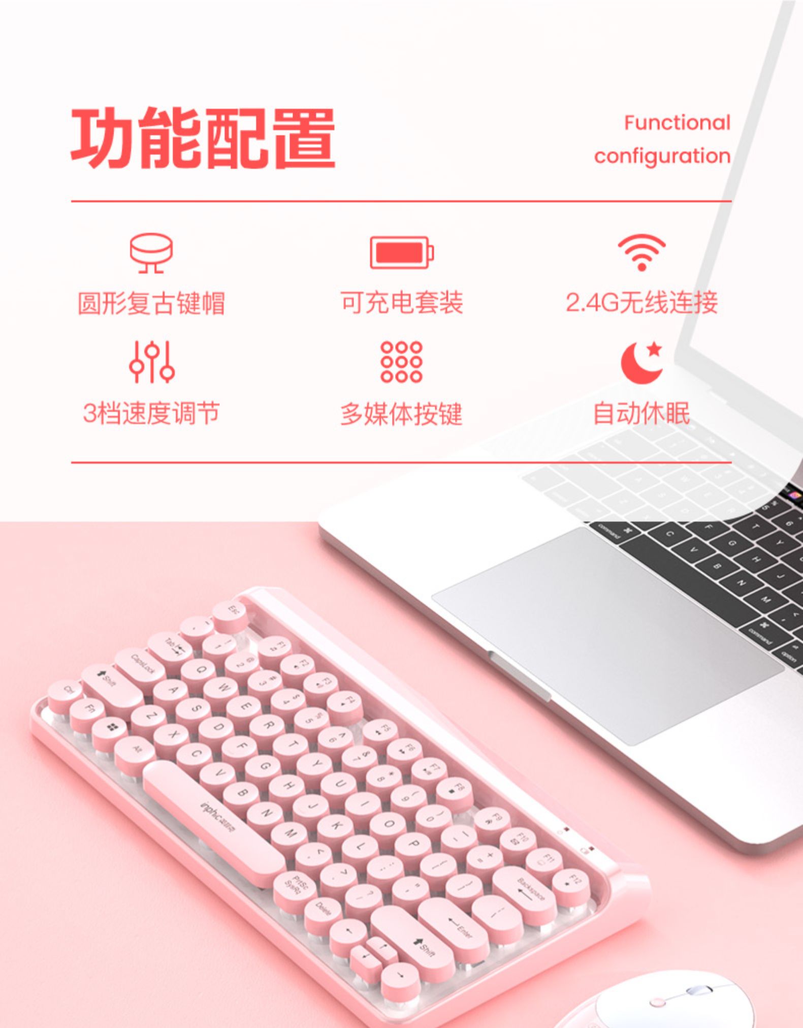 英菲克V798充电无线键盘鼠标套装电竞游戏无声台式电脑笔记本外接办公家用时尚朋克复古女生可爱粉色机械手感