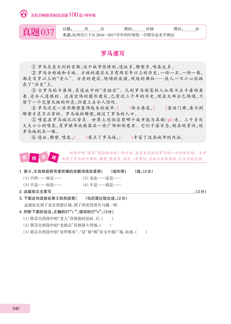 2019名校名师推荐小学生语文阅读真题100篇四年级4年级 新课标版小学语文阅读提升训练小学生课外书阅读理解课堂内外名校名师讲解