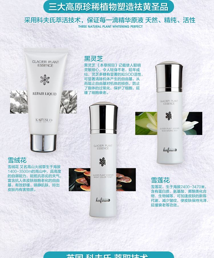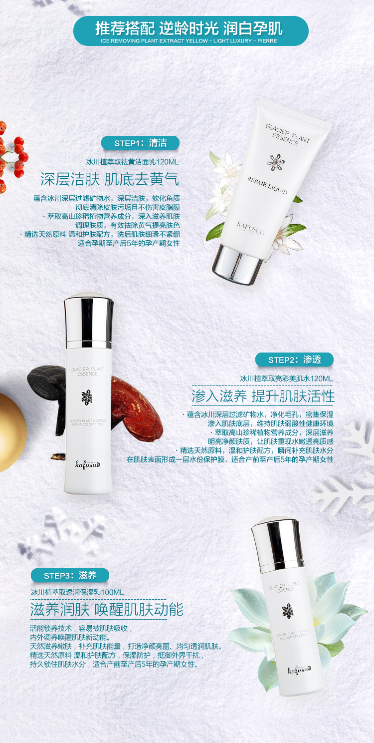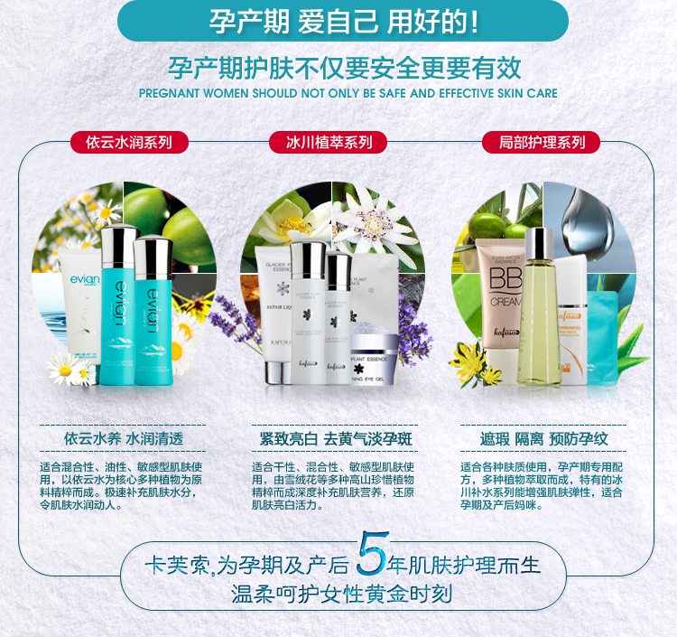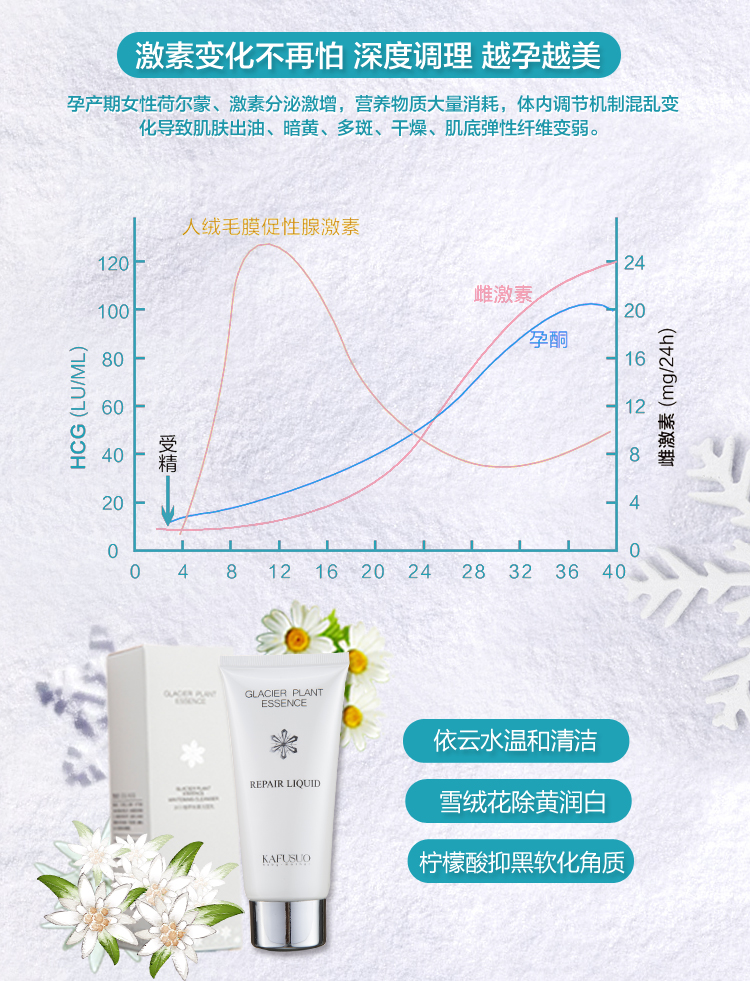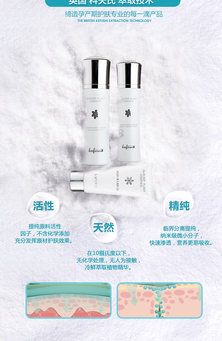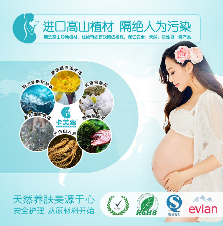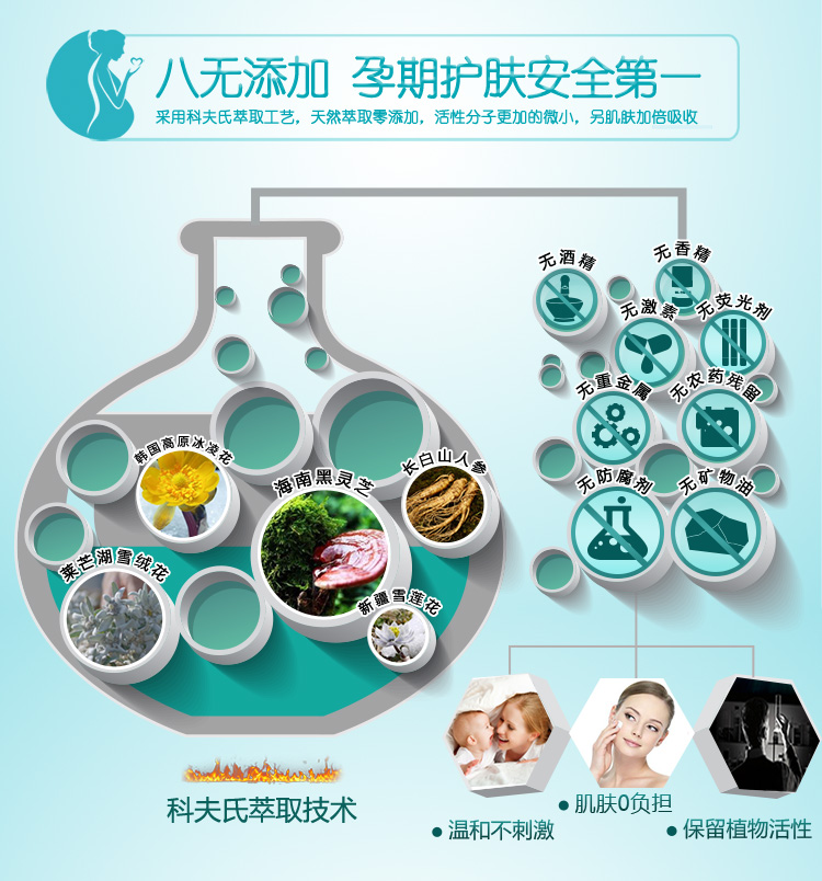进口高山植材,隔绝人为污染,采用英国科夫氏萃取技术,八无添加,孕期护肤安全,去黄补水保湿,激素变化不再怕,深度调理,越孕越美丽。