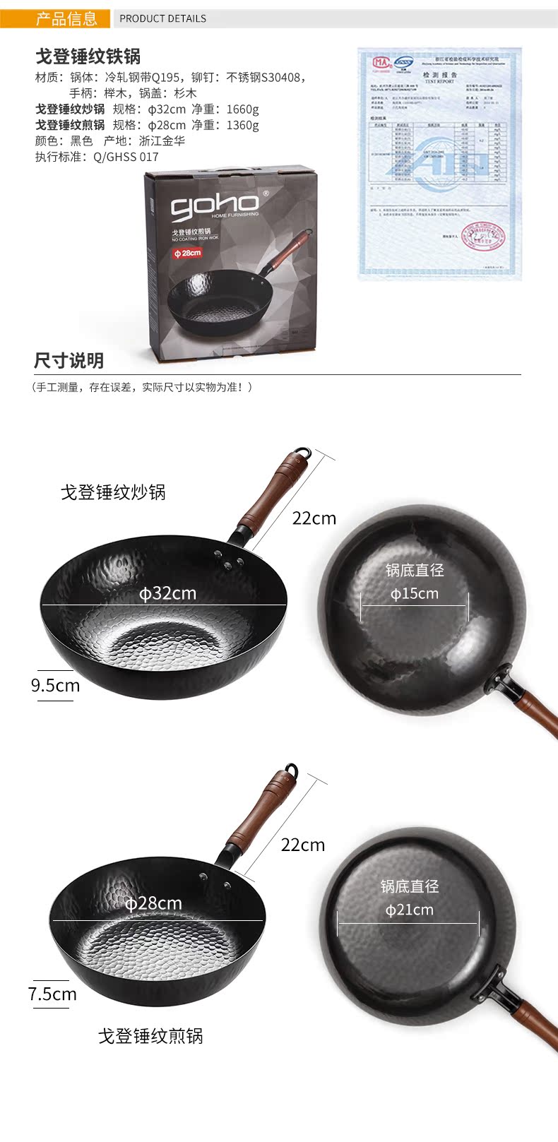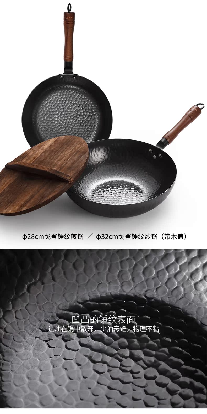 质量好,颜值又高,做饭的时候心情也能美美哒,锤纹表面,聚热少油,物理不沾,!煎炸闷炒烙煮样样行。