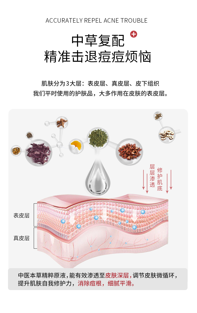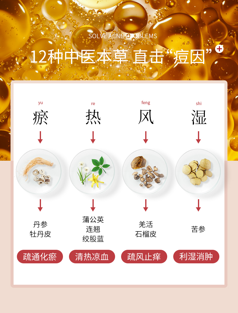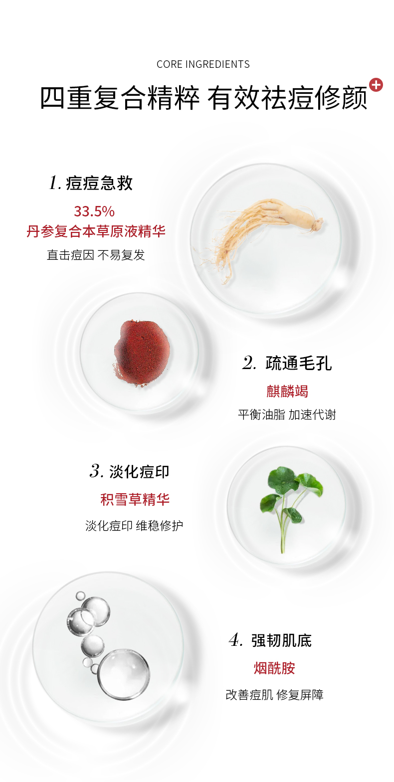 清肌退痘、平衡油脂、淡印消痕、焕亮肌肤,4重功效出击,根源改善油痘肌,内含君臣佐使、烟酰胺、积雪草,全方位对抗痘痘