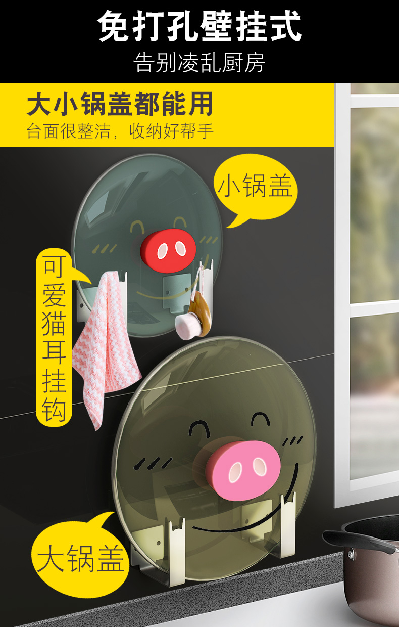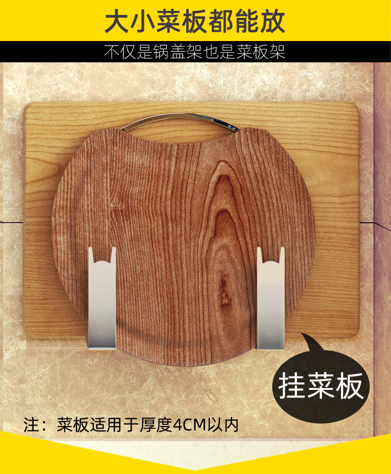 免打孔壁挂式告别凌乱厨房,功能强,免打孔,安装简单,不锈钢材质,大小锅盖都能用,不仅是锅盖架也是菜板架,承重强,不会掉,台面很整洁,收纳好帮手!!