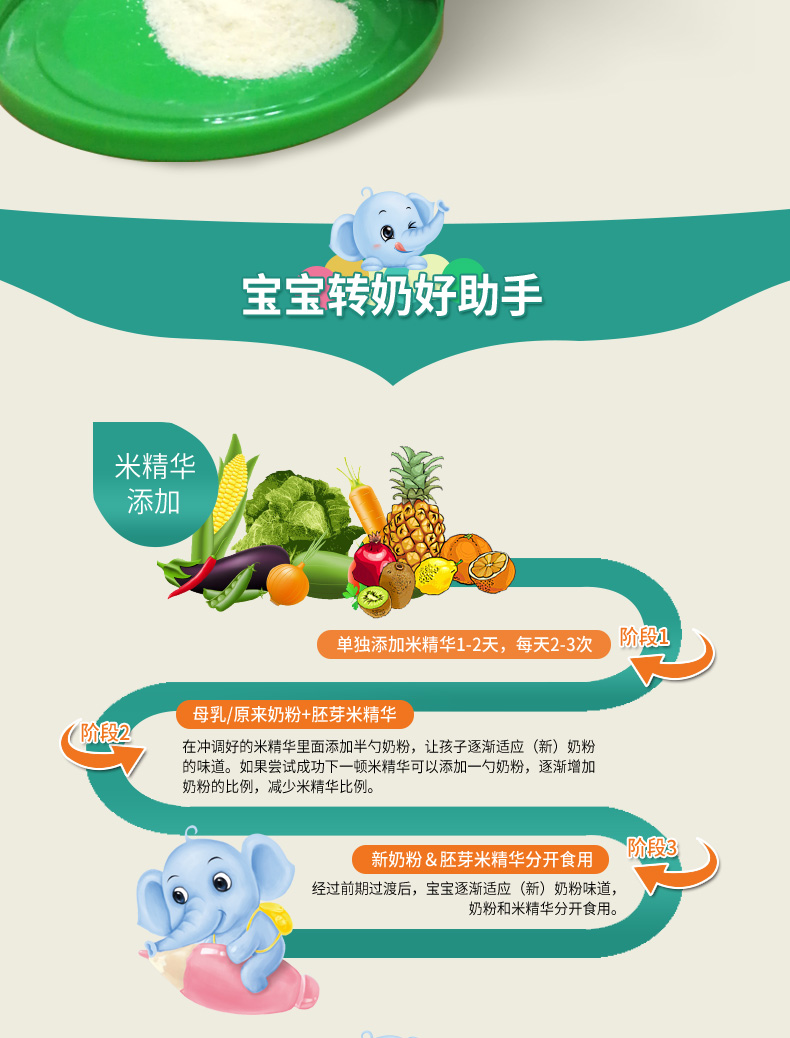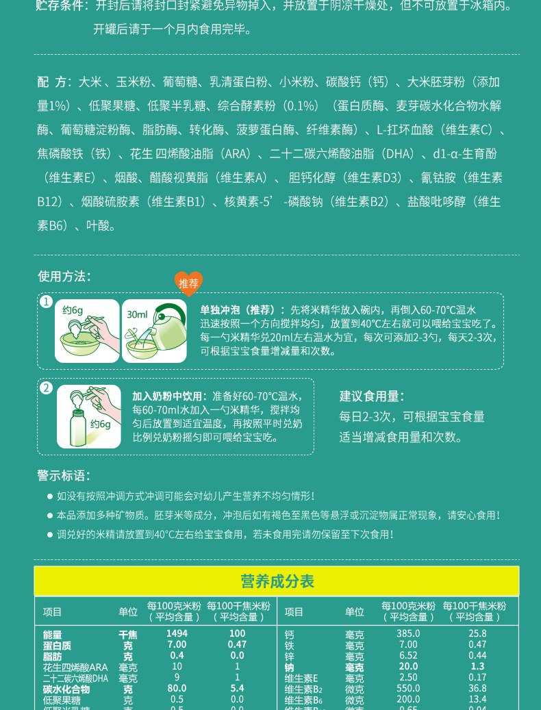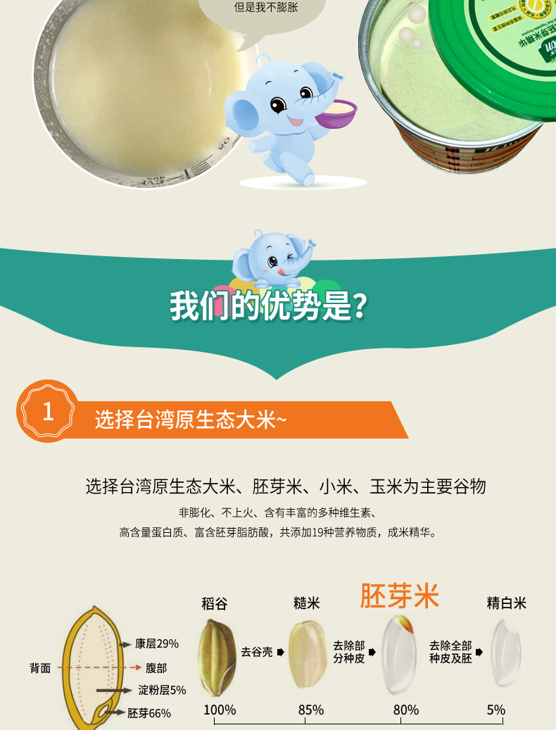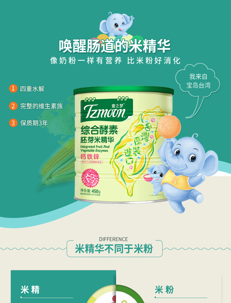 不同于传统米粉,台湾原装进口,精选多种原料,水磨成浆,非膨化不上火,四重水解,特别添加配方,顺利帮助宝宝过渡辅食期,综合酵素有营养!