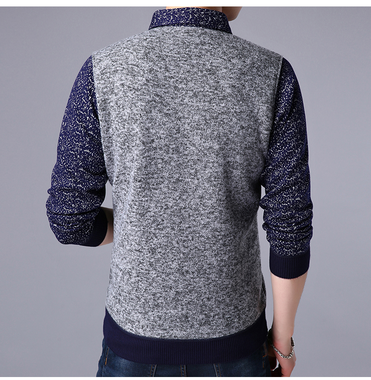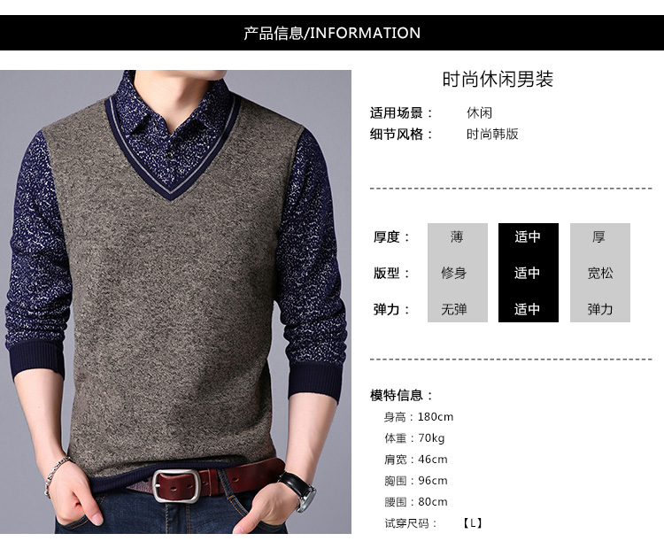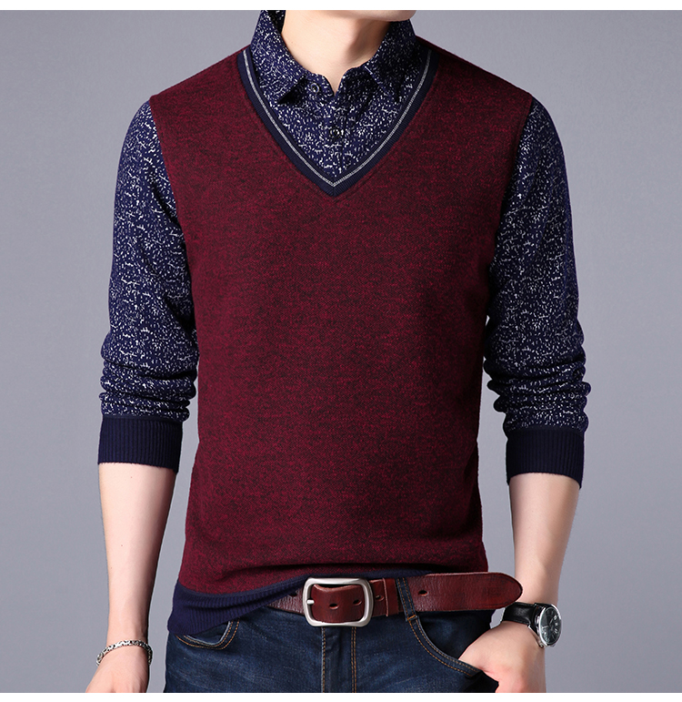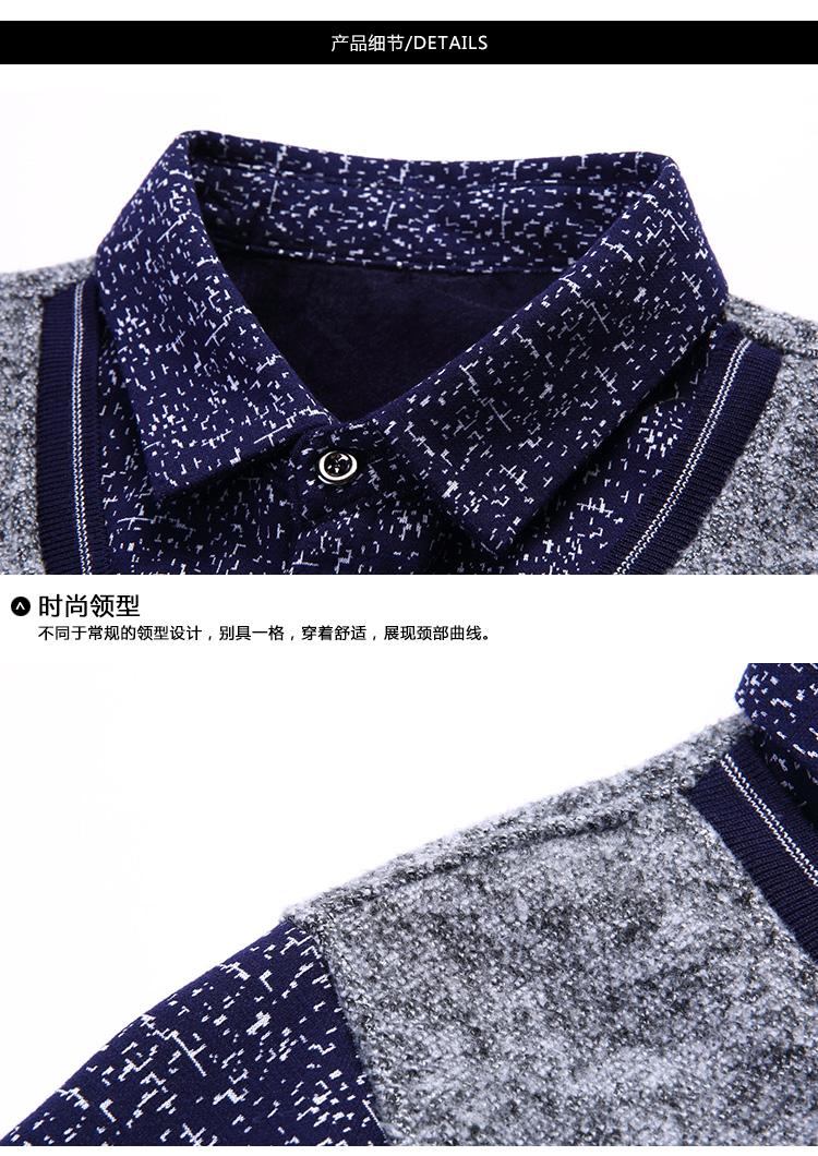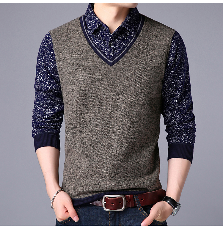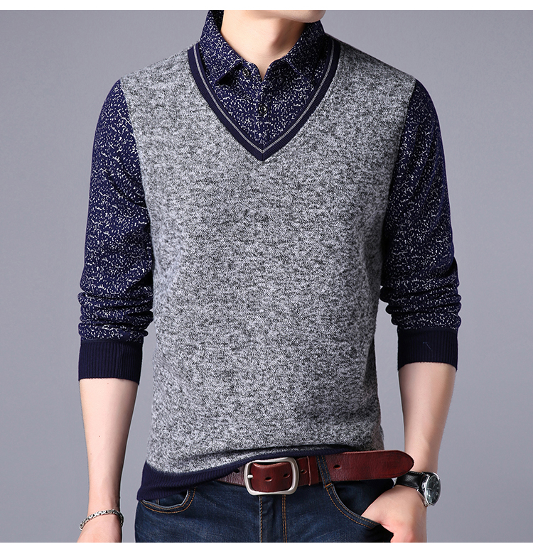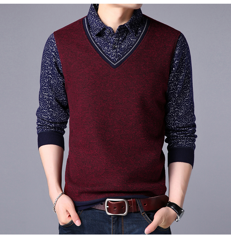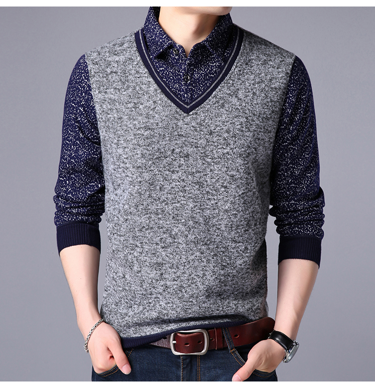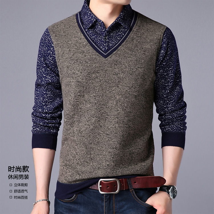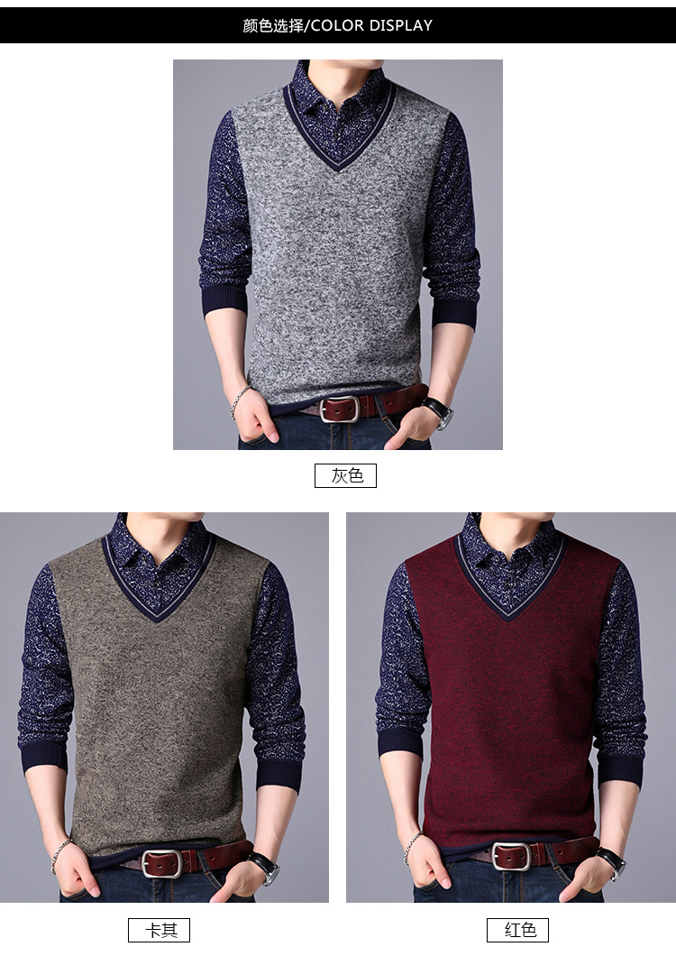 衬衫领加绒保暖衬衫男士假两件套头针织衫毛衣冬季加厚衬衣