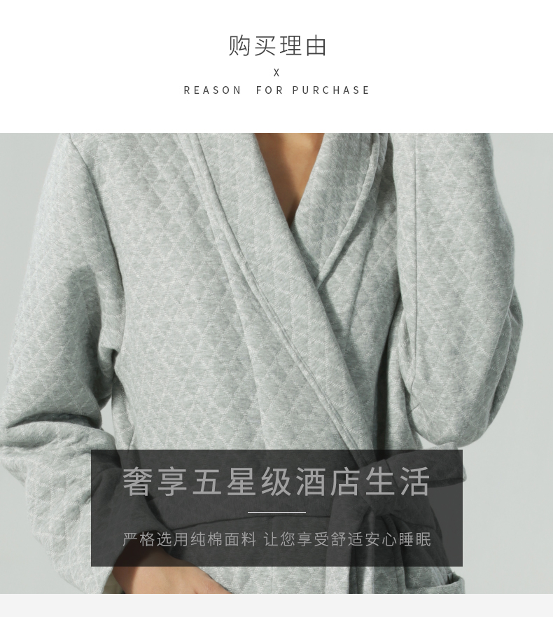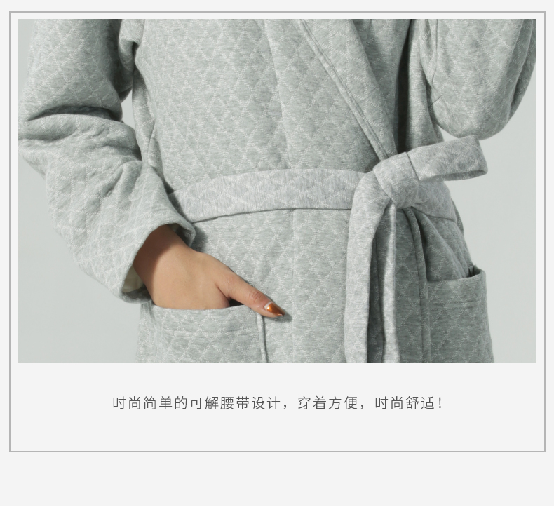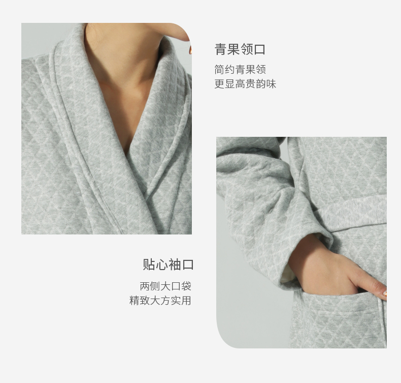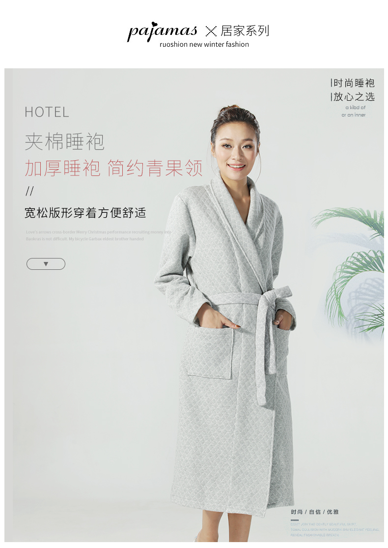 加厚睡袍简约青果领宽松版型穿着方便舒适,安全舒适又保暖,柔软抗静电,简约青果领更显韵味,让居家简约舒适更显优雅大气韵味。