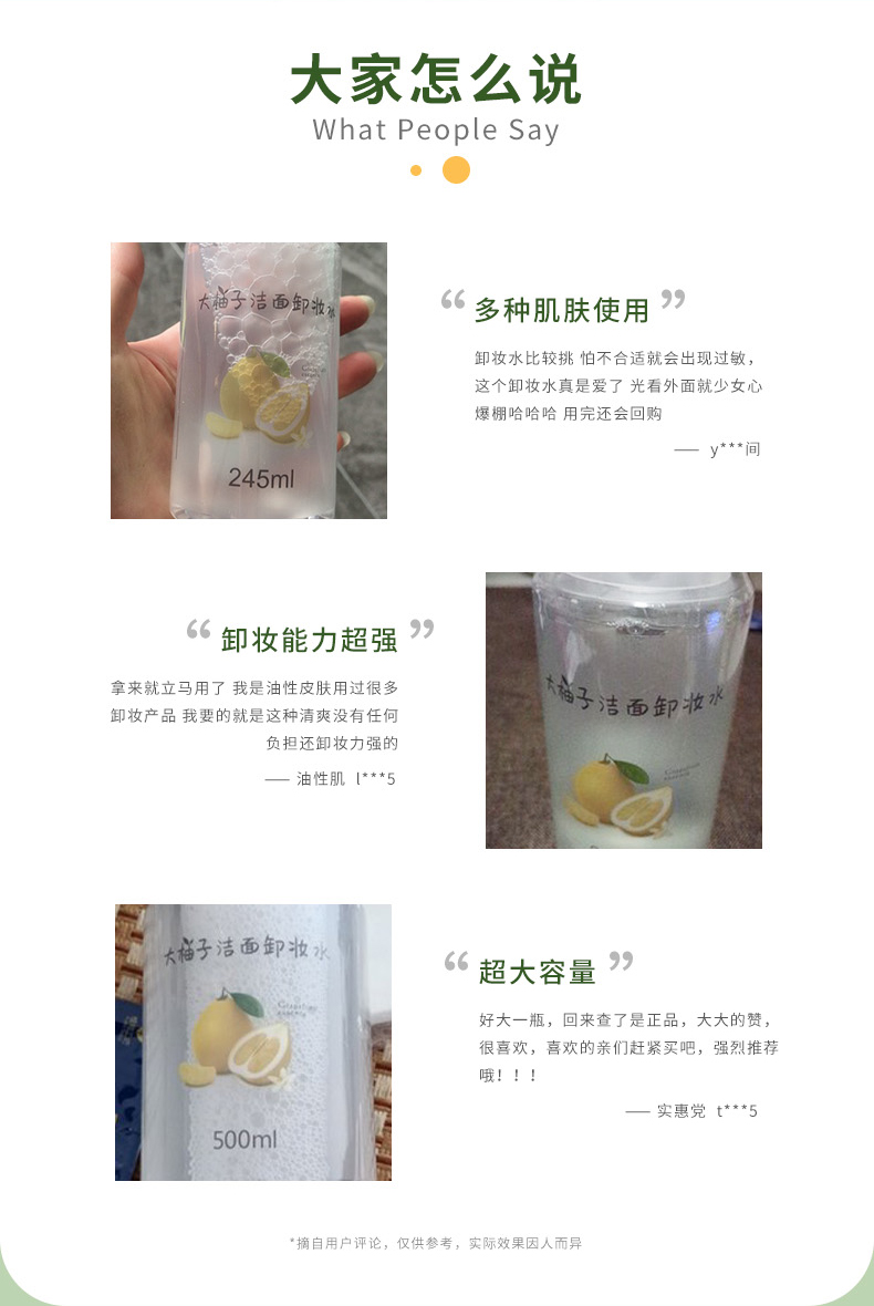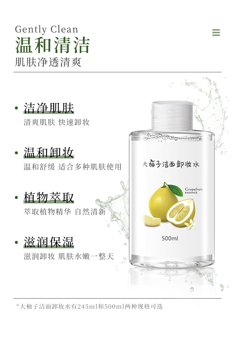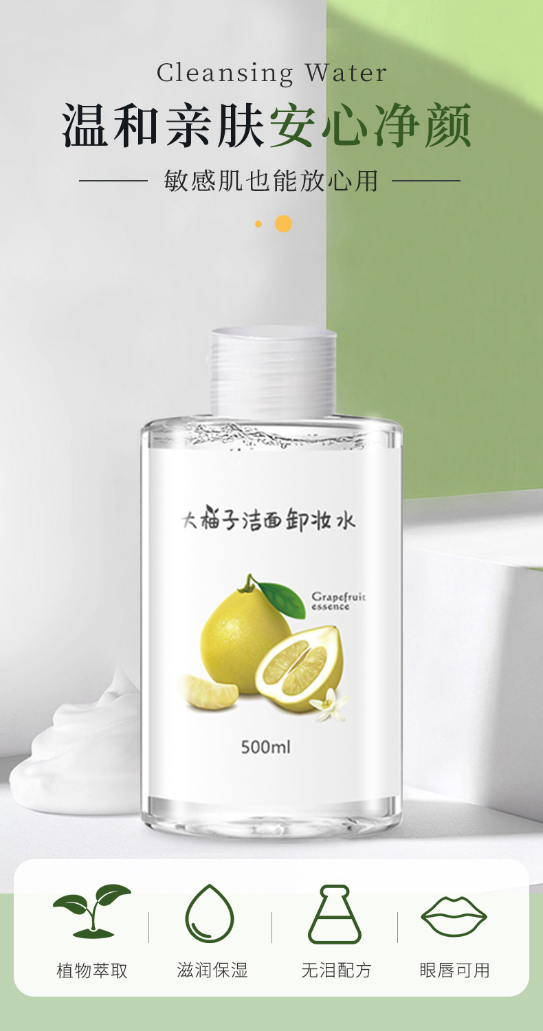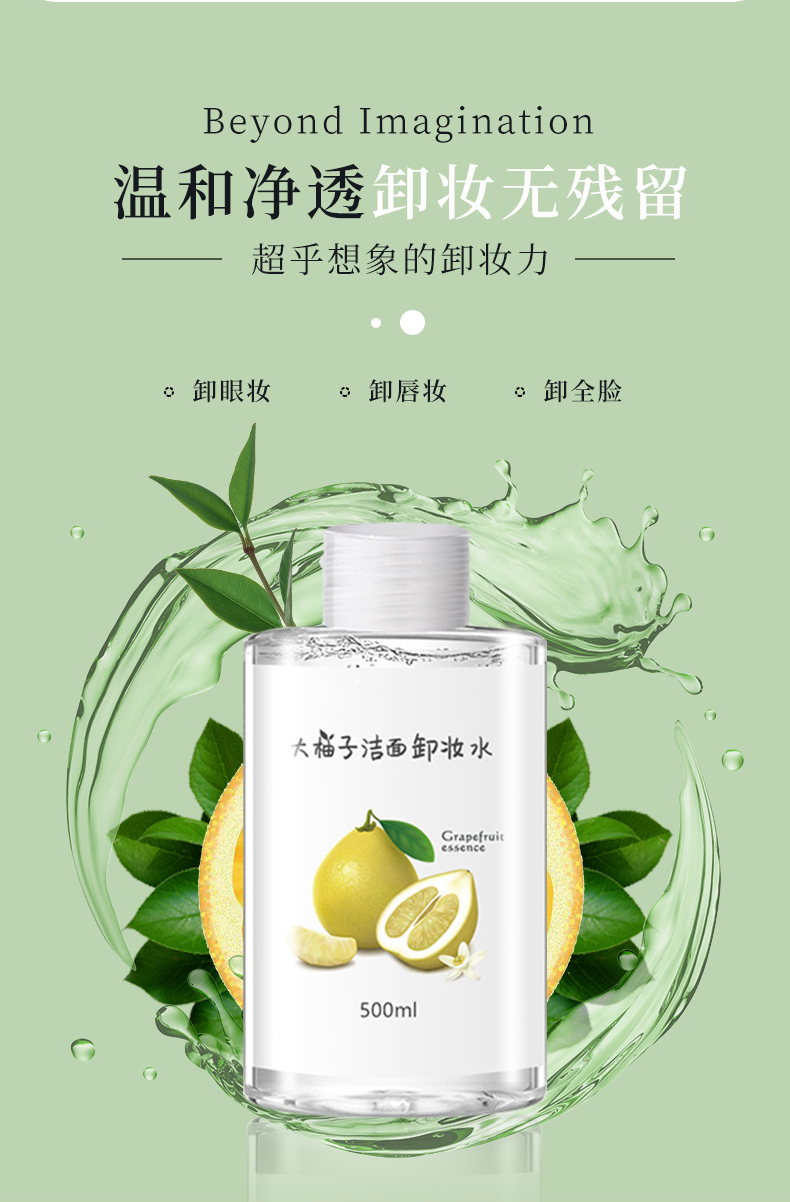 500ML卸妆水+送1包卸妆棉,柚子精华清爽免洗,保湿滋润,温和不辣眼,挑战4大妆容,一抹洁净,淡淡清香,给予肌肤柔软呵护的清新享受!【赠运费险】
