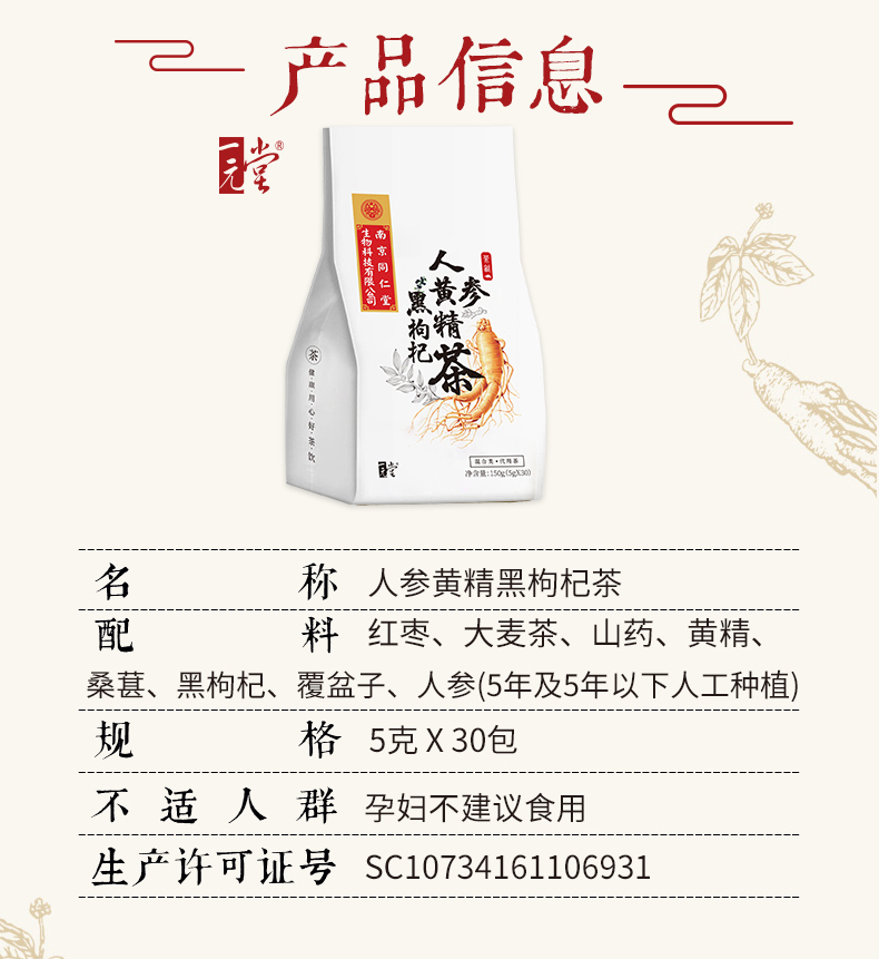 南京同仁堂五宝茶八宝茶人参黄精黑枸杞红枣桑葚覆盆子养生茶