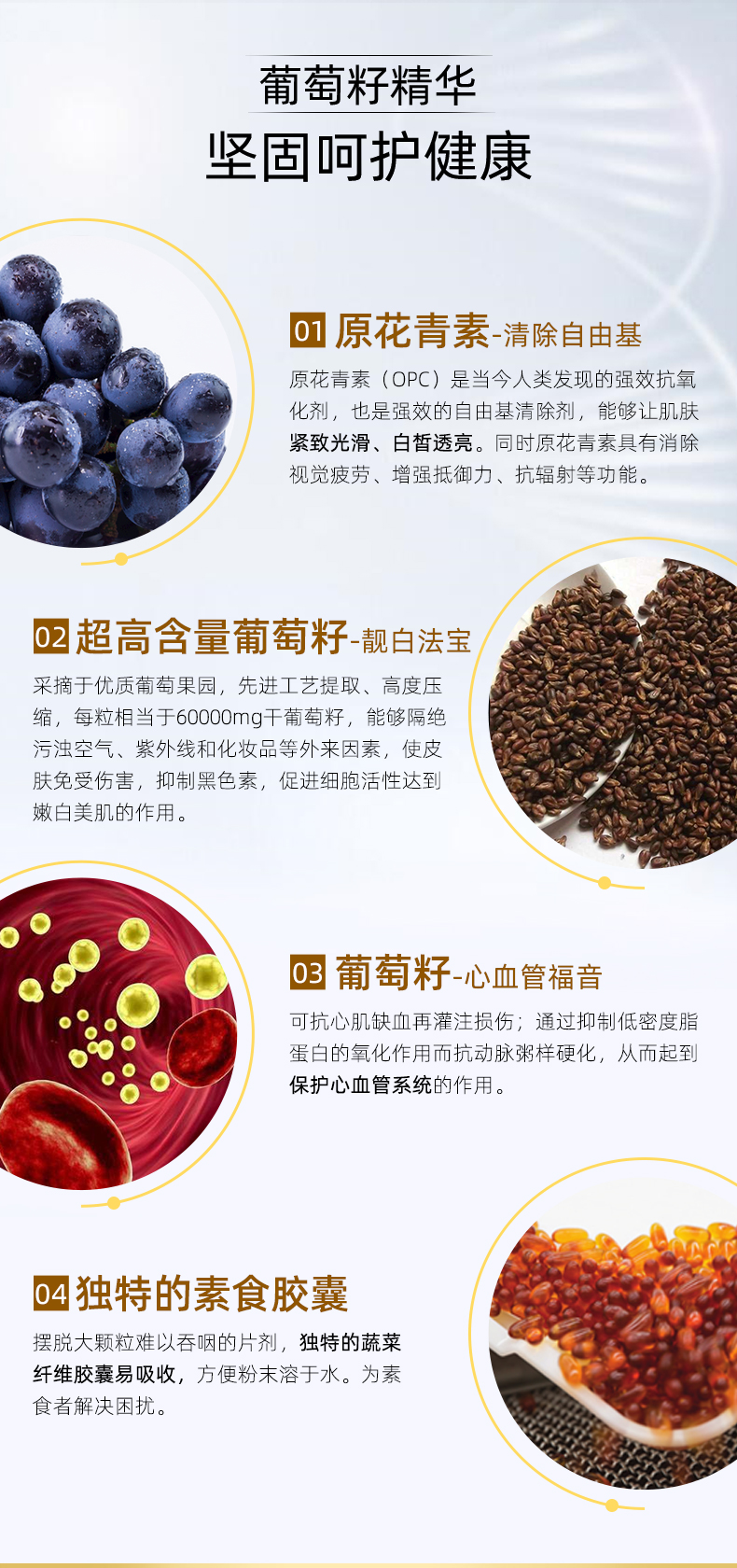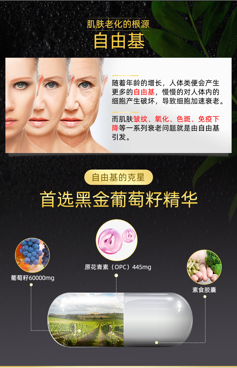 摆脱大颗粒难以吞咽的片剂,非转基因蔬菜纤维胶囊易吸收,方便粉末溶于水服用,采摘于优质葡萄果园,先进工艺提取,高度压缩,方便的一天一粒产品形式,定量随餐服用