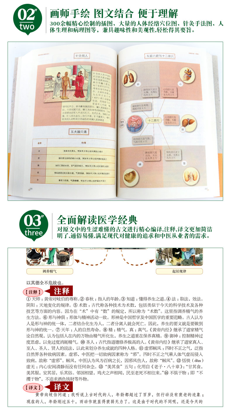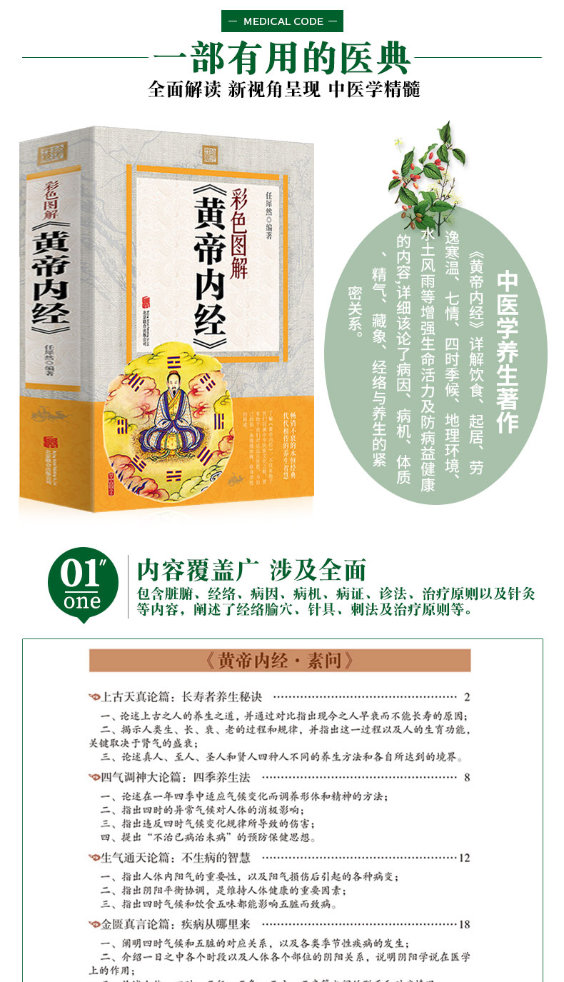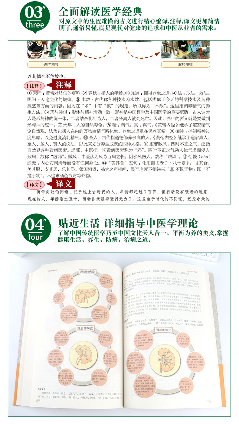 经典医学名著,彩图完整版《黄帝内经》,全彩印刷,讲解详细。详解经络穴位,中医养生大全。DI一次系统地阐述了养生理论与方法,不仅讲了怎样治病,还讲中老年爸妈必备养生宝典。【赠经络图】
