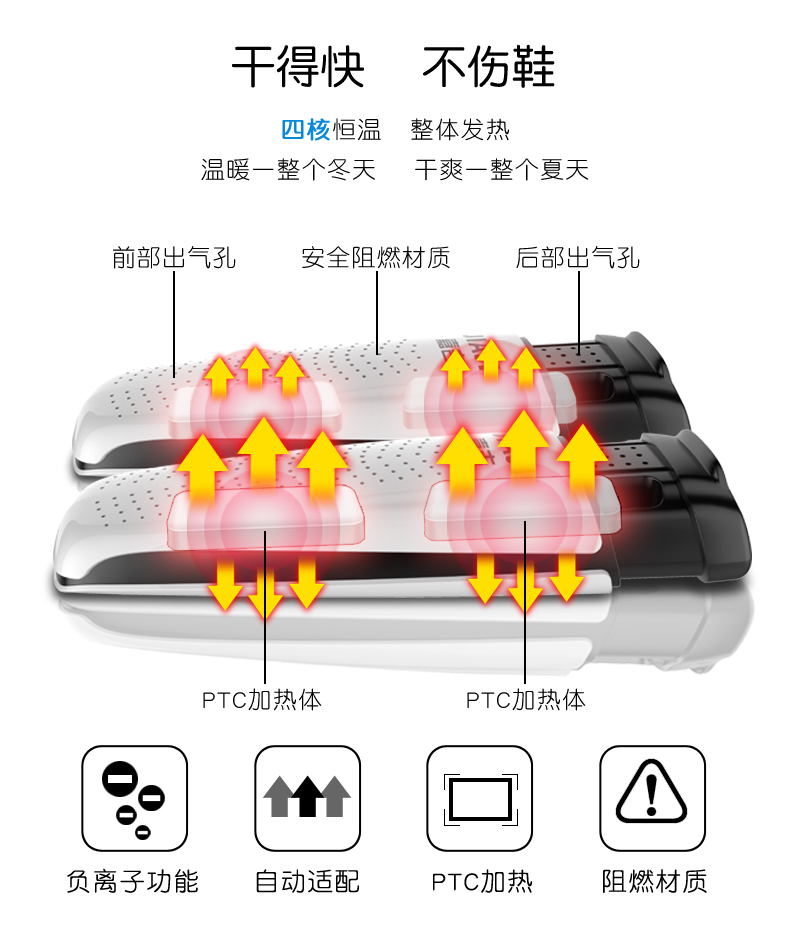【太平洋保险承保】抑菌除臭,循环加热,四核技术,定时功能,一款带着负离子给不同鞋型不同呵呵的烘鞋器,耐高温材质,无异味,干得快,不伤鞋,给你的脚带来一冬天的温暖。