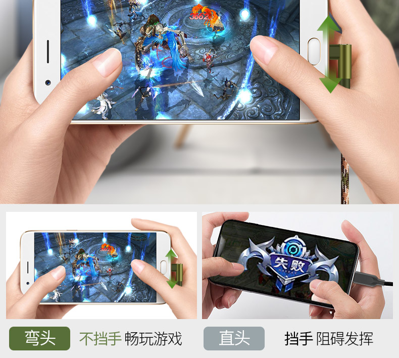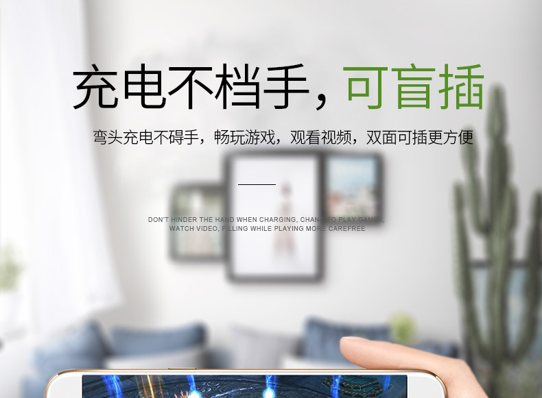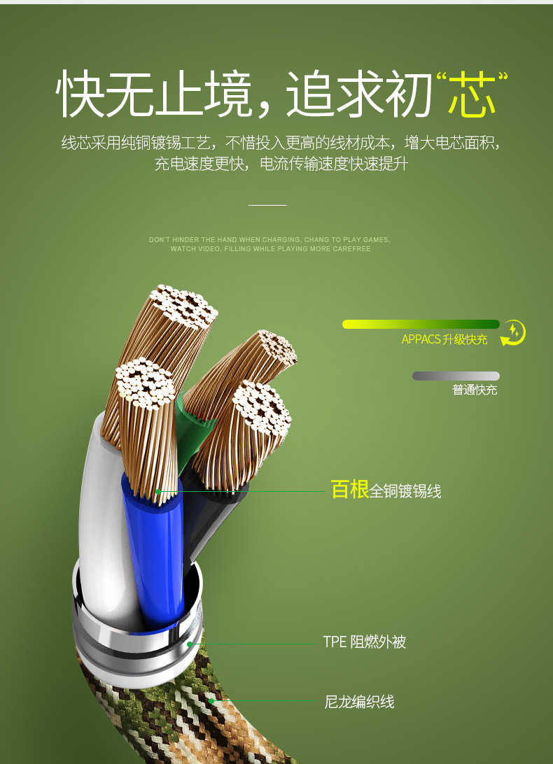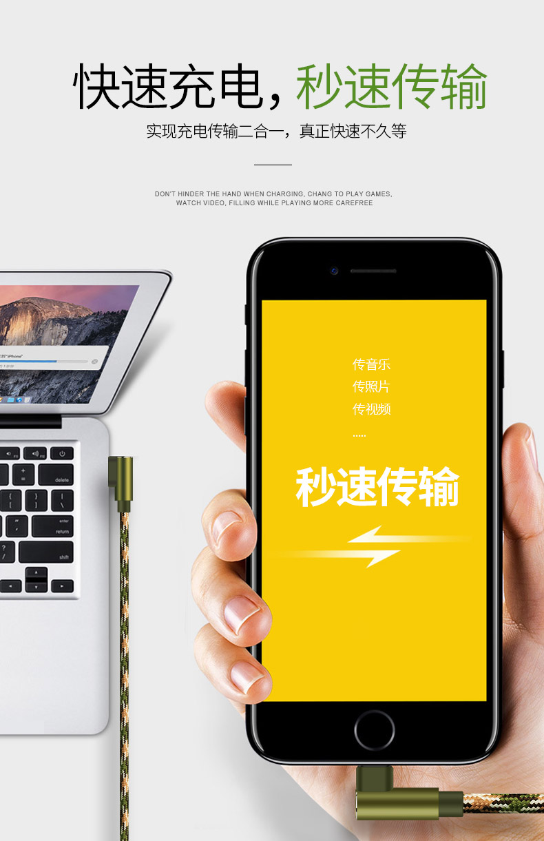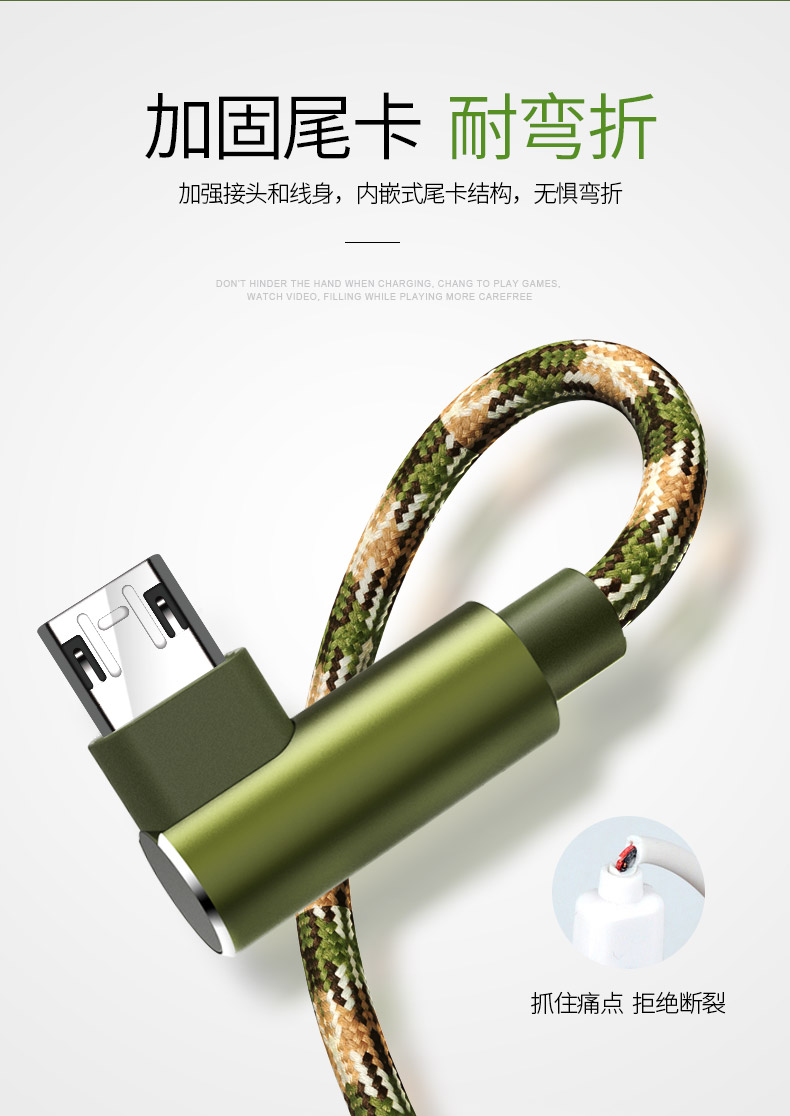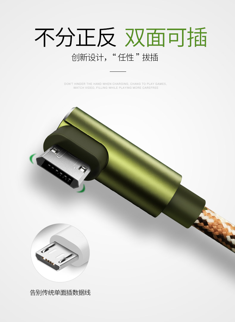 迷彩双弯头,快速闪充,纯铜线芯真提速,手游必备数据线,不分正反,双面可插,创新设计。