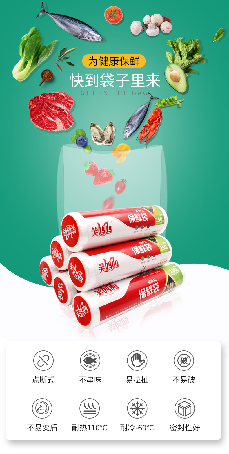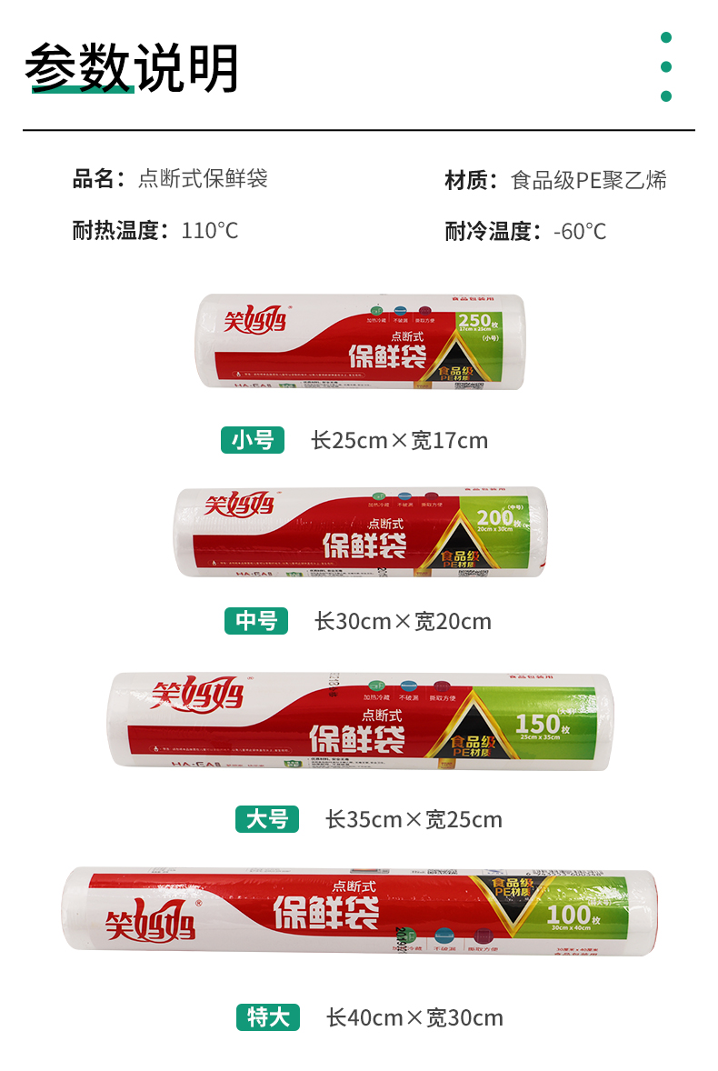 【笑妈妈】点断式食品保鲜袋,耐高低温,密封性良好,可有效延长保鲜时间,阻隔细菌不串味,食品级PE材料,质量好品质有保证,便捷好撕韧性足,现在买的话第二件9折,第三件8.5折,赶快抢购吧