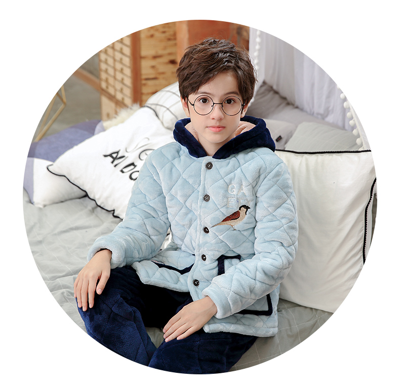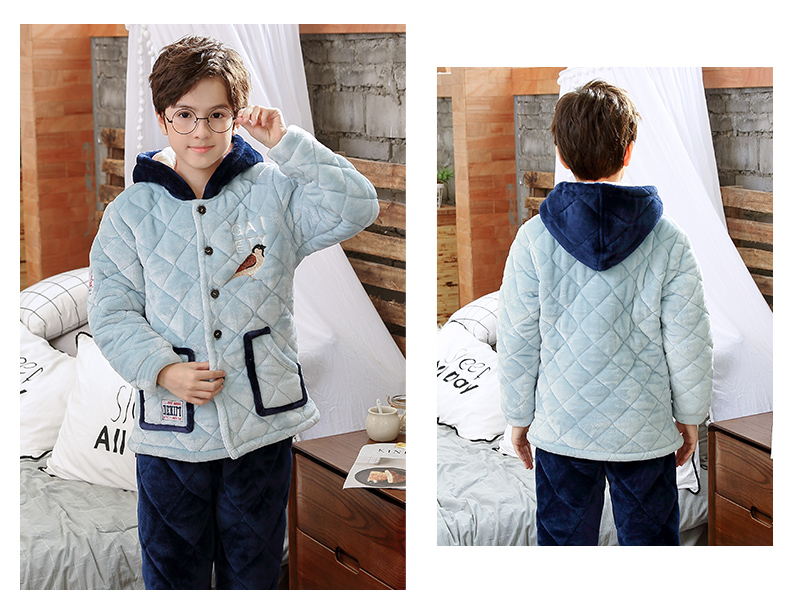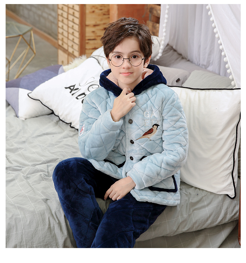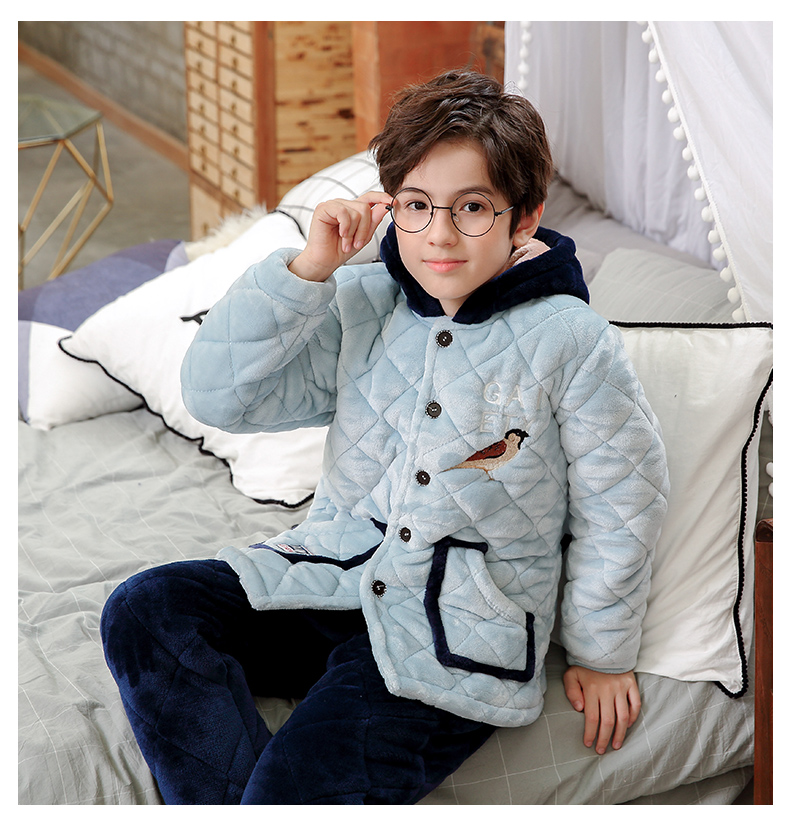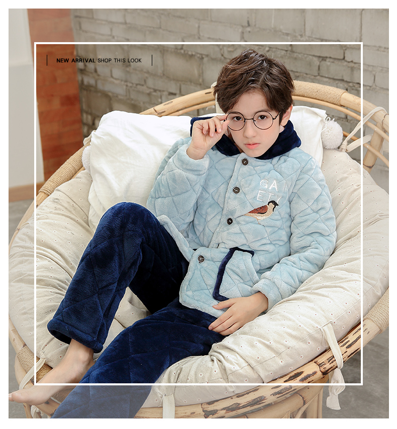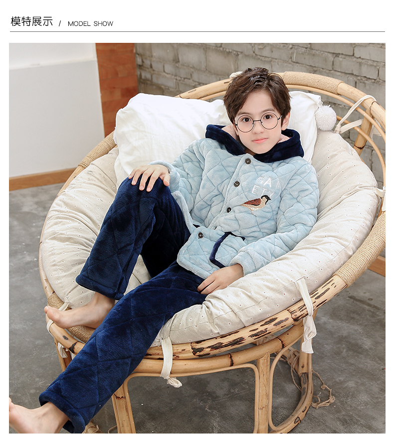 秋冬季加厚款法兰绒儿童睡衣三层夹棉男童装男孩珊瑚绒加绒家居服