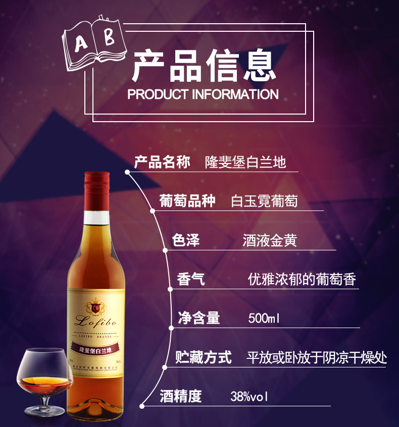 隆斐堡白兰地葡萄蒸馏酒干邑洋酒烈酒38度500ml*2瓶