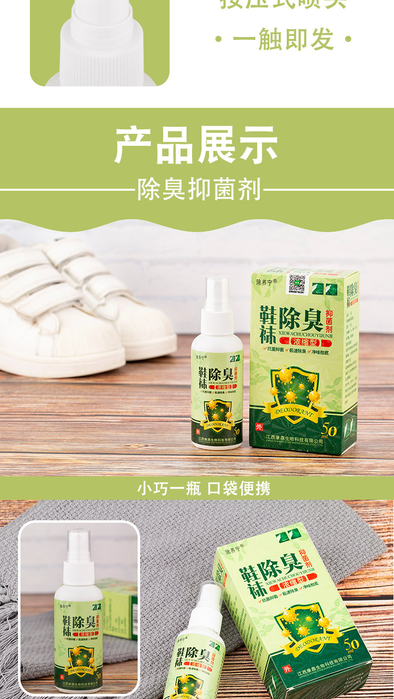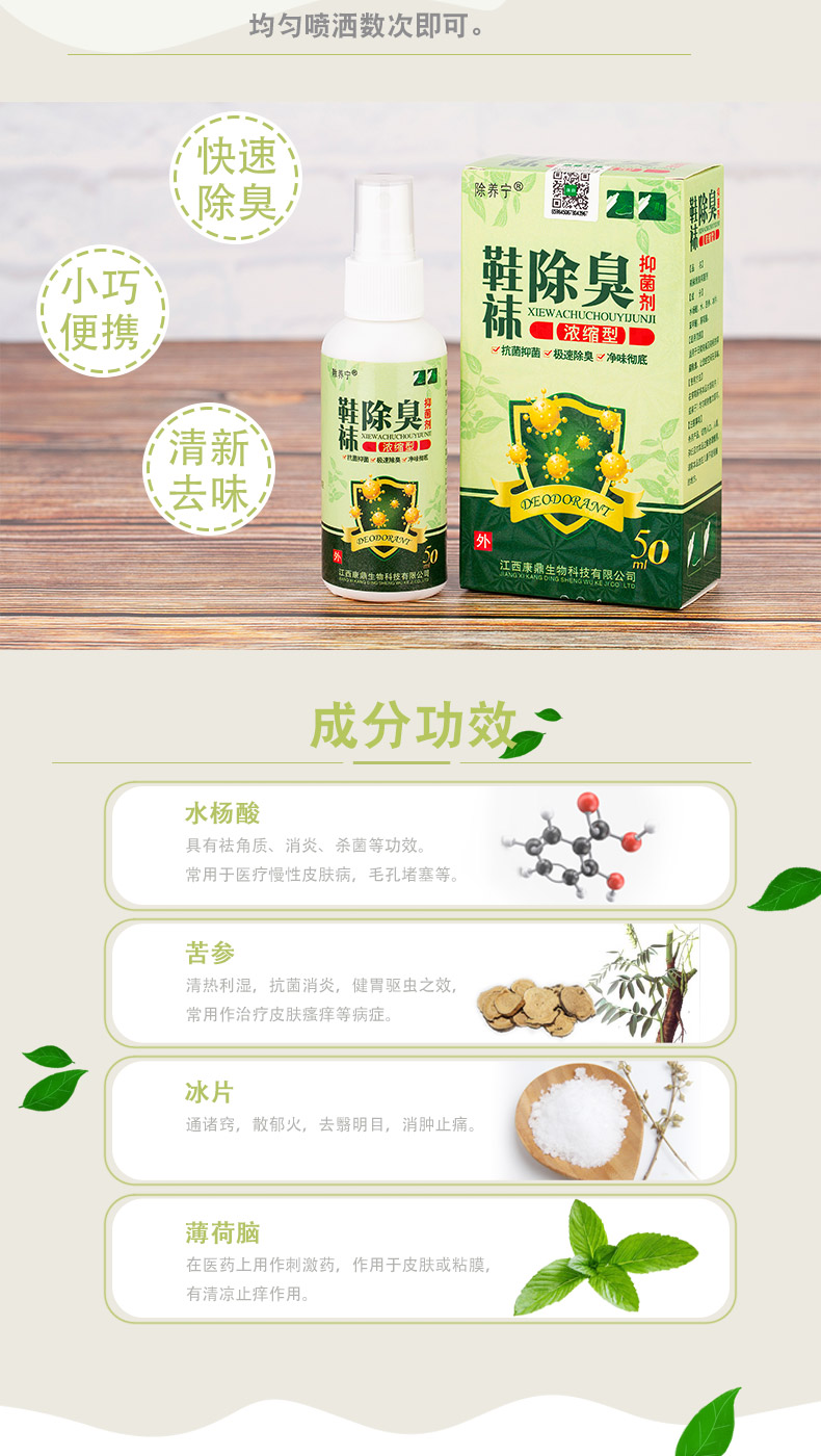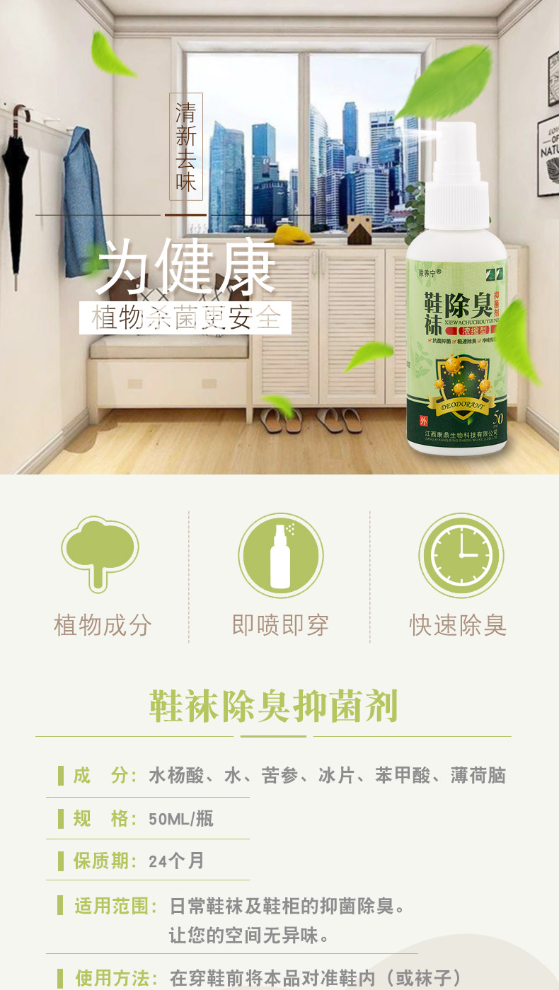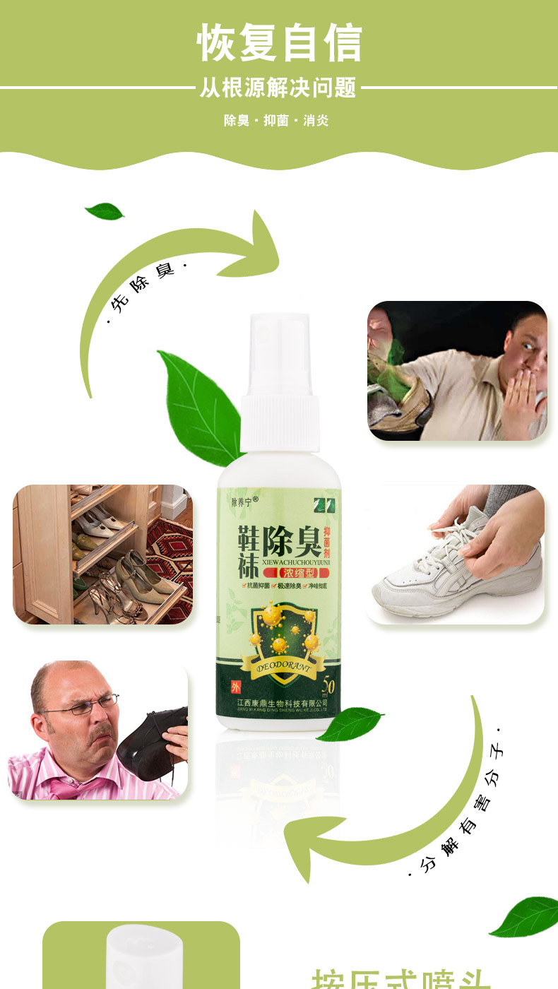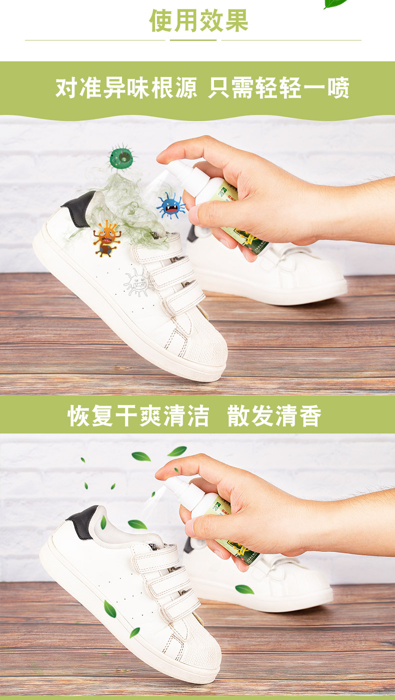 告别鞋袜臭,一喷不尴尬, 清新去味,草本护理,不伤鞋袜, 不伤皮肤,不含有害物质, 鞋柜、鞋袜喷一喷统统有效。