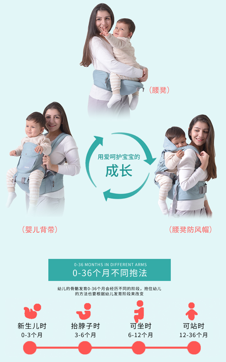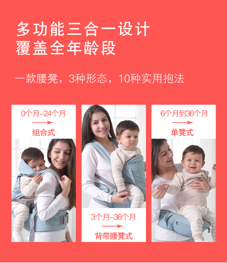 四季通用抱娃神器,一套顶三套,婴儿背带+腰凳+腰凳防风帽,前抱式婴儿背带,储物空间大,可放纸尿裤、奶瓶等,可折头设计,轻便省力,预防O型腿,多种背法,满足宝宝不同阶段的需求!