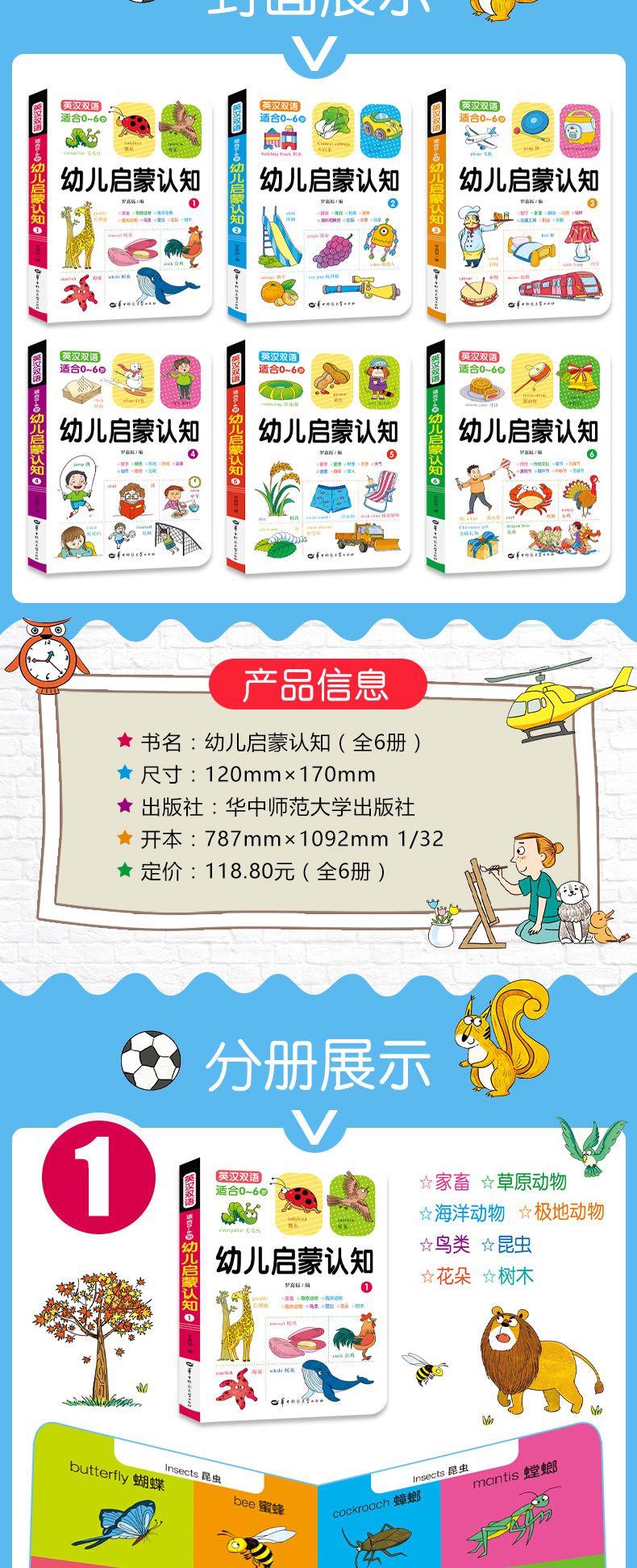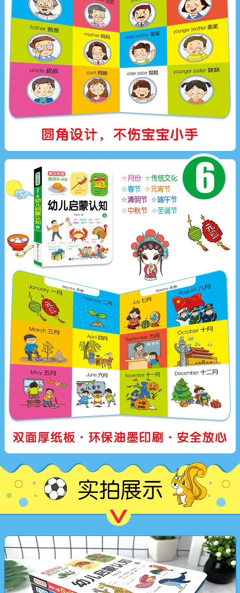 适合0-6岁幼儿启蒙认知,贴心开本,方便宝宝小手抓握,圆角设计,不伤宝宝小手,环保油墨印刷,中英双语,可以亲子共读的书