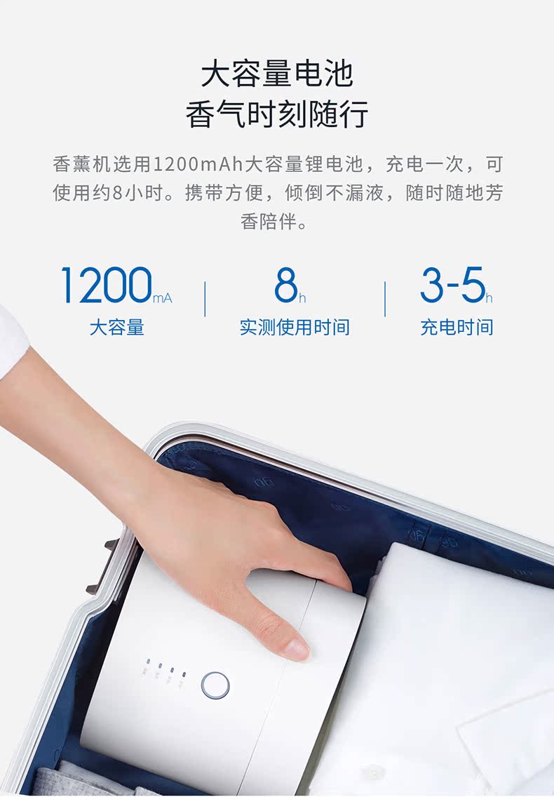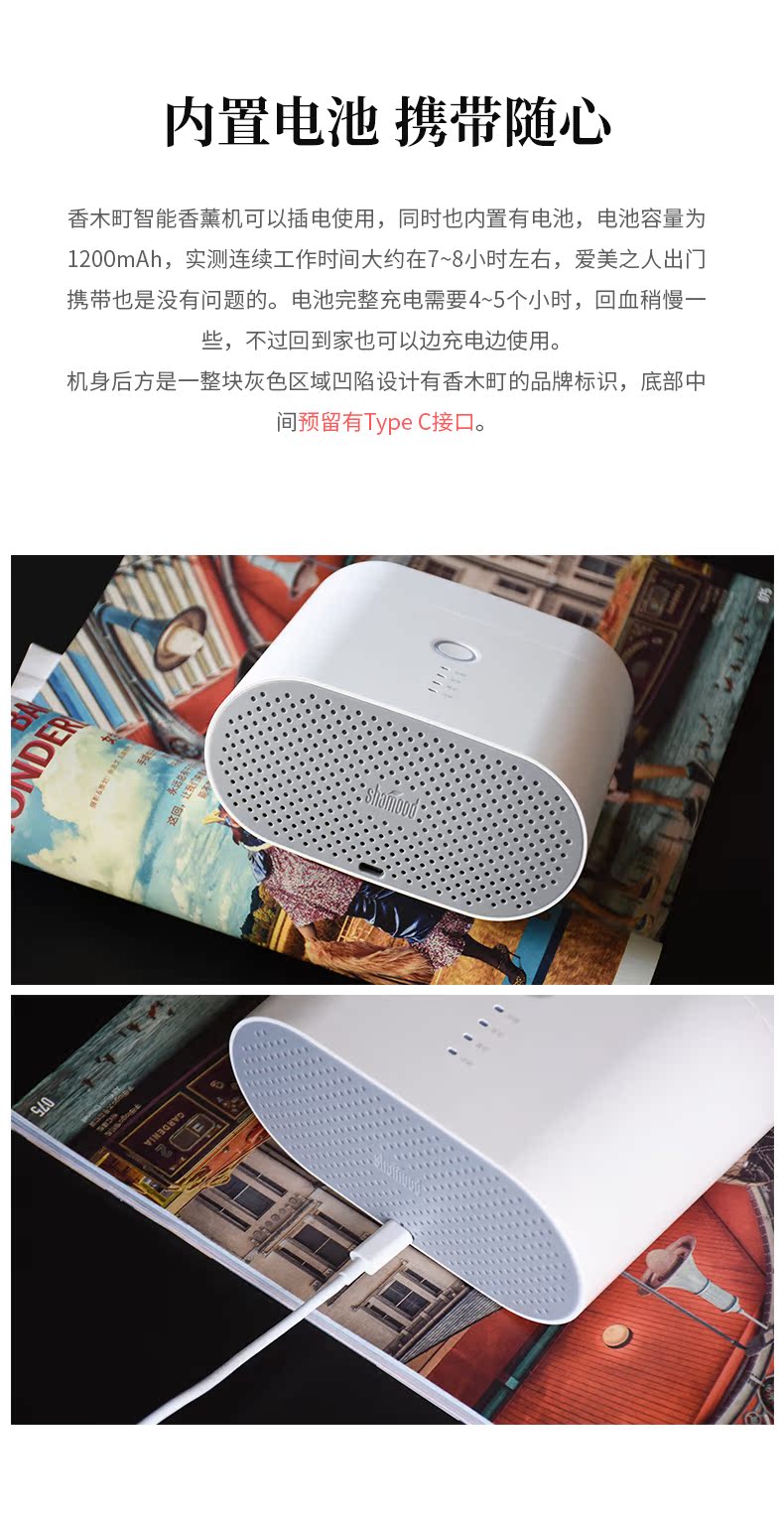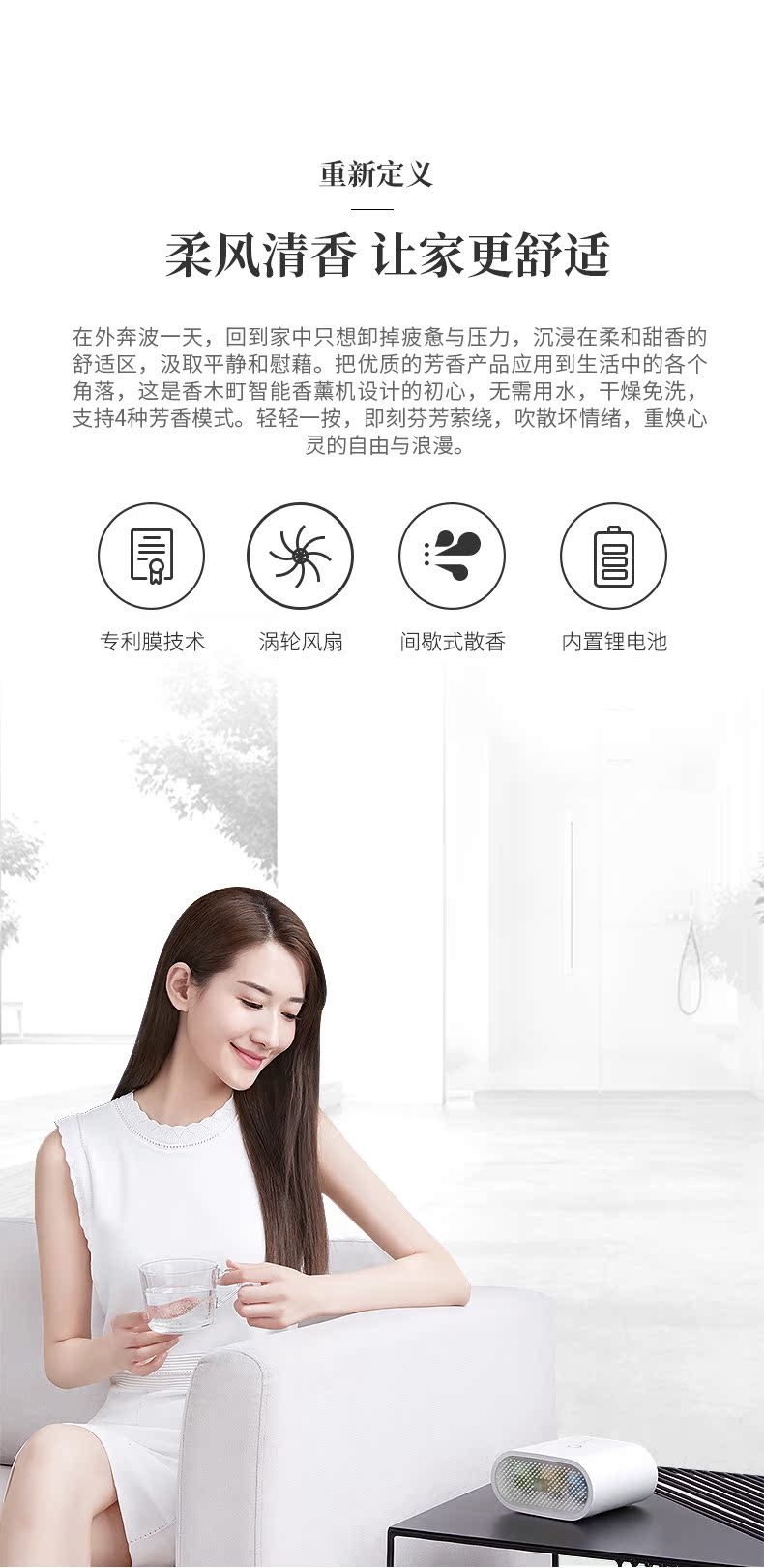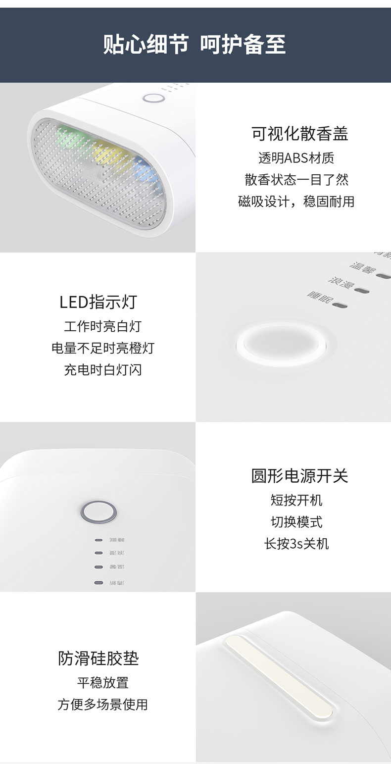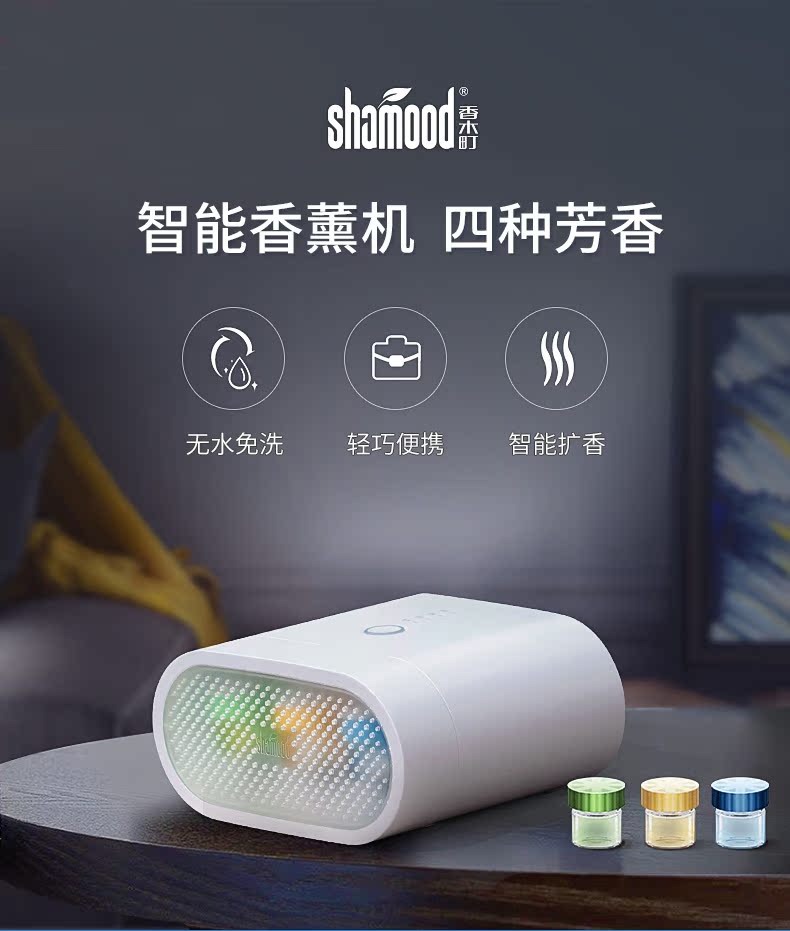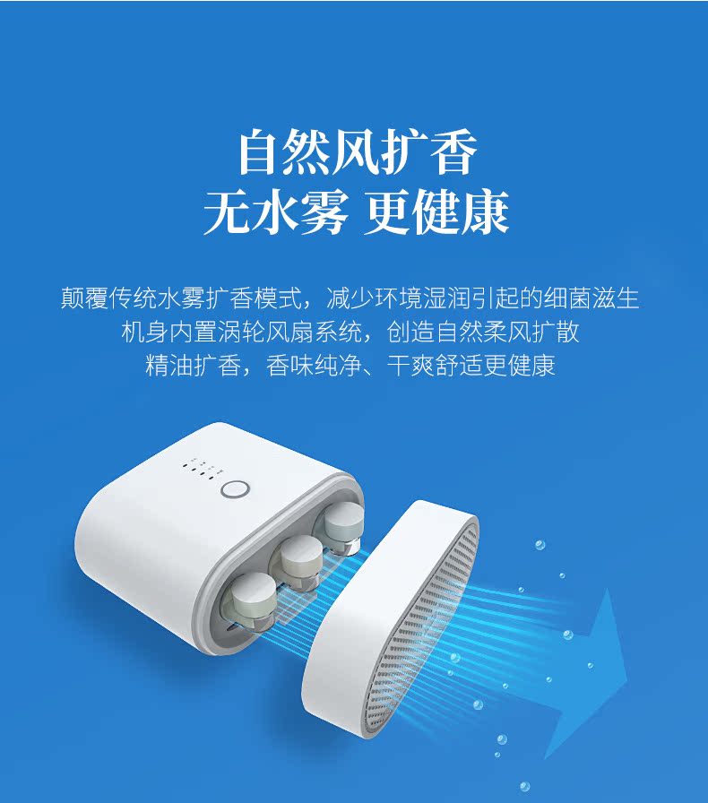 轻巧便携,无水免洗,智能扩香,一键切换,四种芳香,柔风清香,吹出幸福感,无水雾,更健康,大容量电池,随取随用,香气时刻随行!