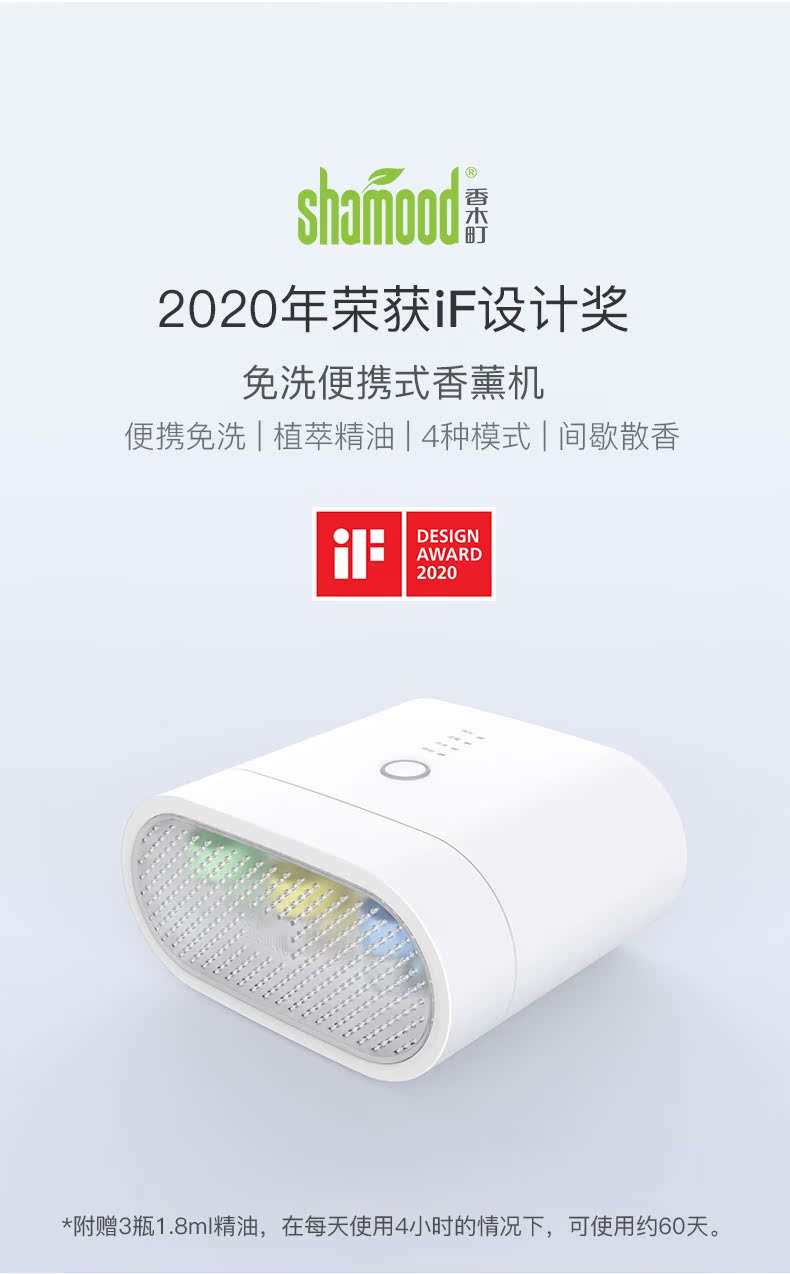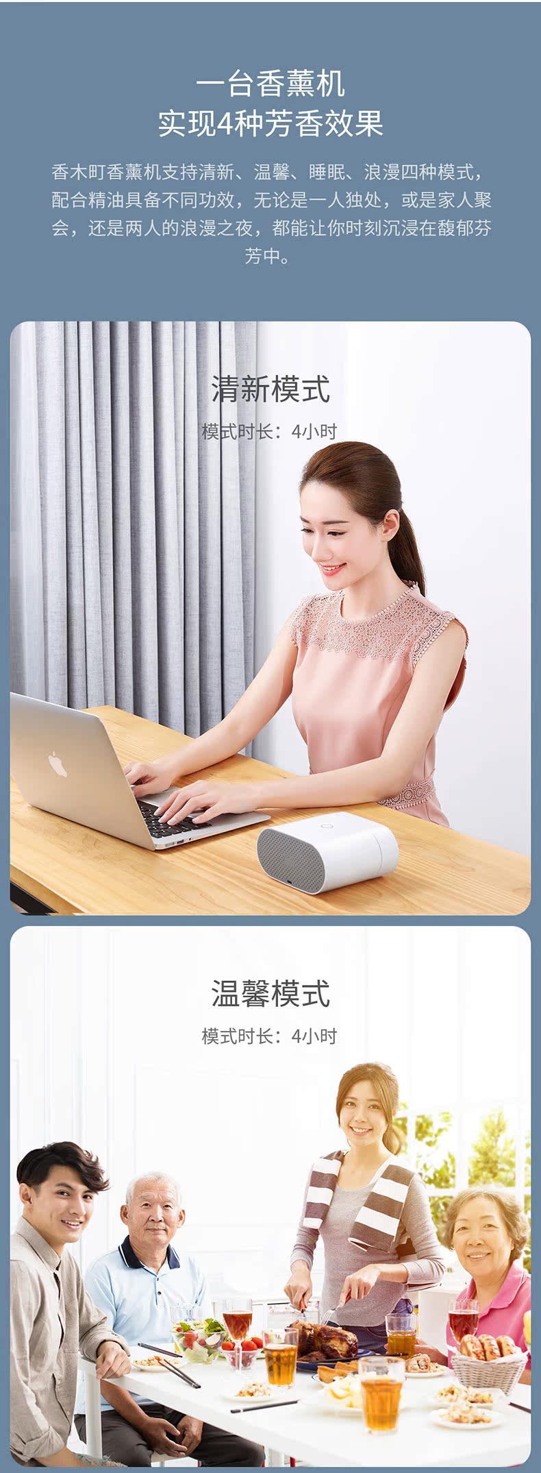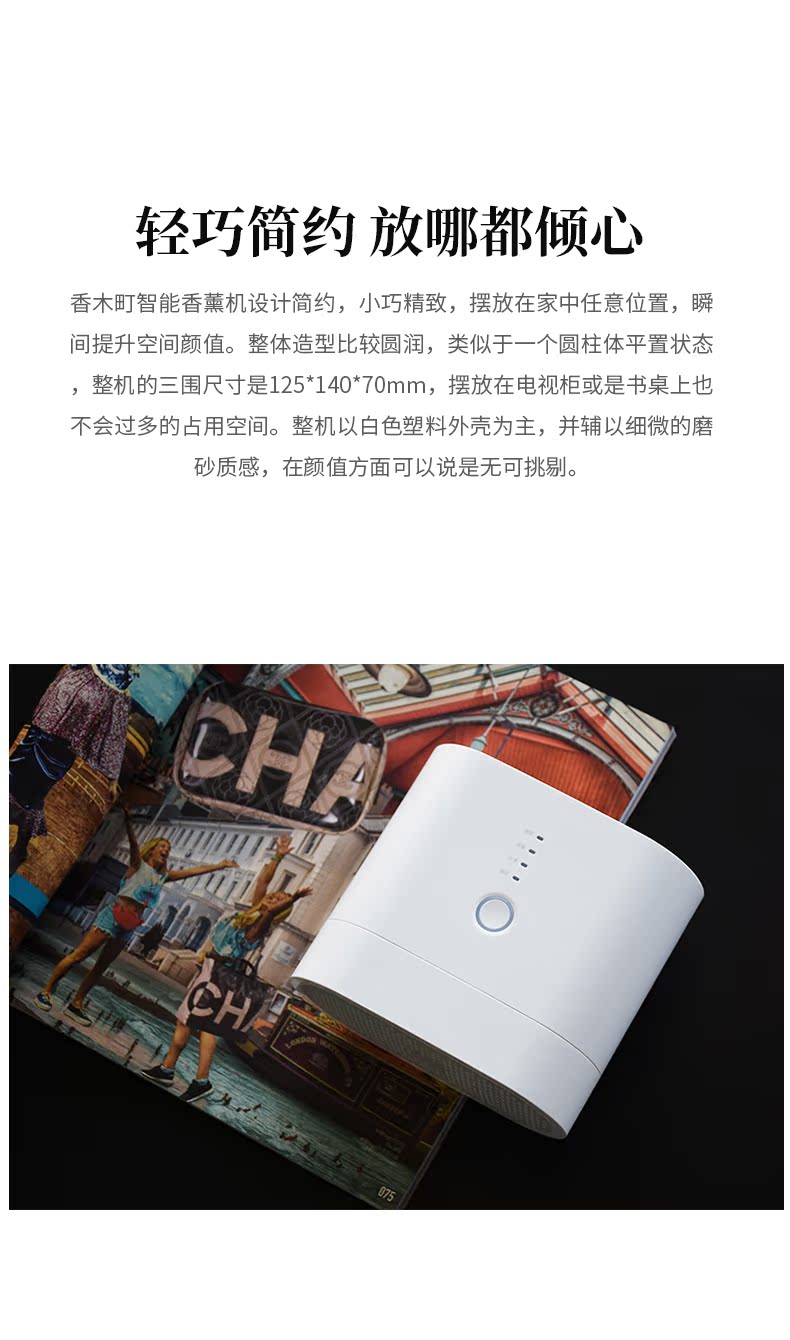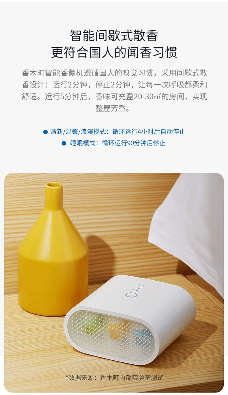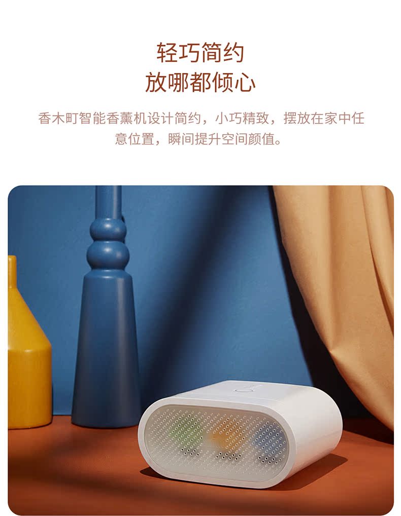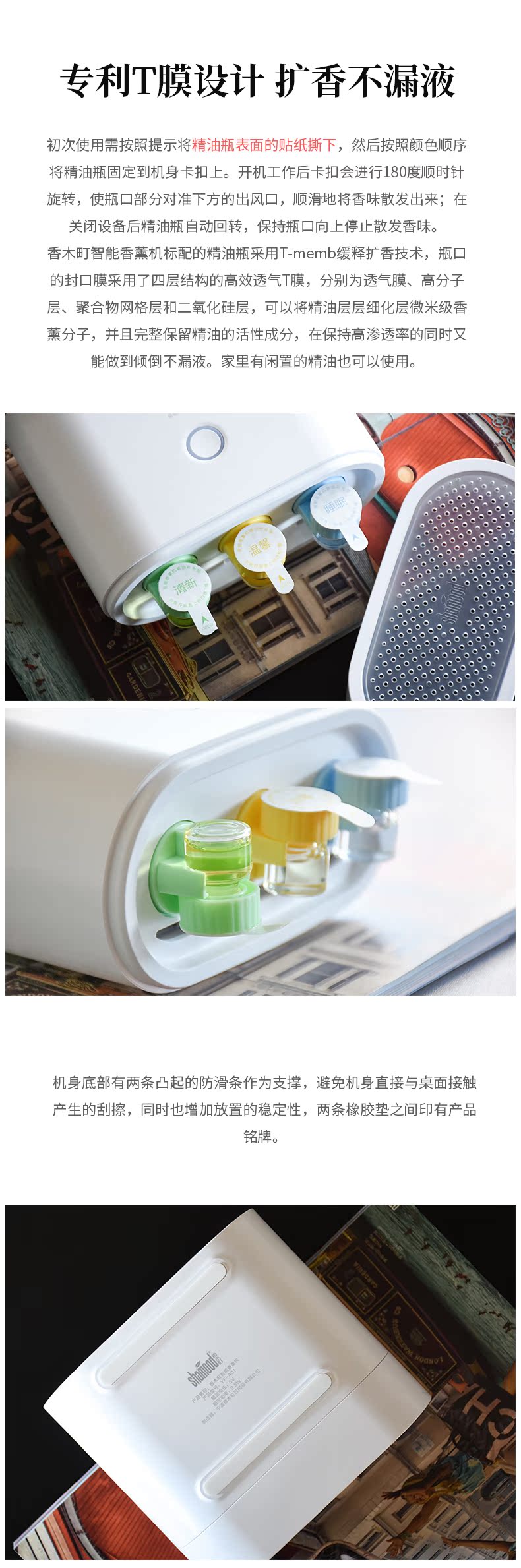 轻巧便携,无水免洗,智能扩香,一键切换,四种芳香,柔风清香,吹出幸福感,无水雾,更健康,大容量电池,随取随用,香气时刻随行!