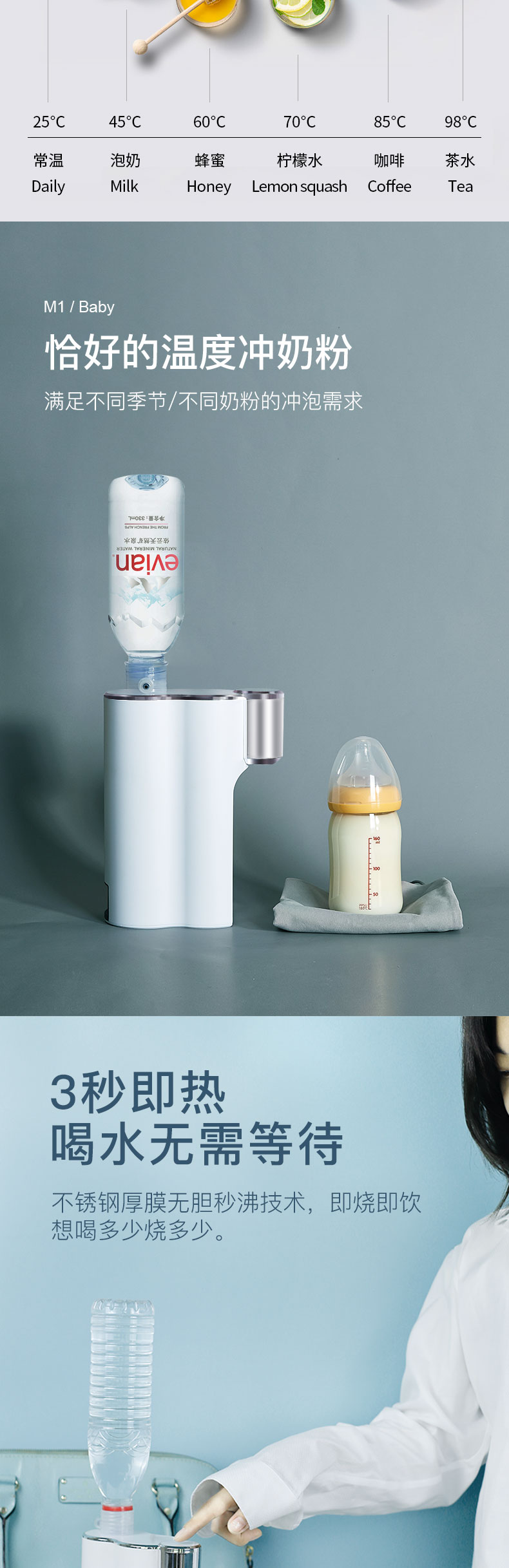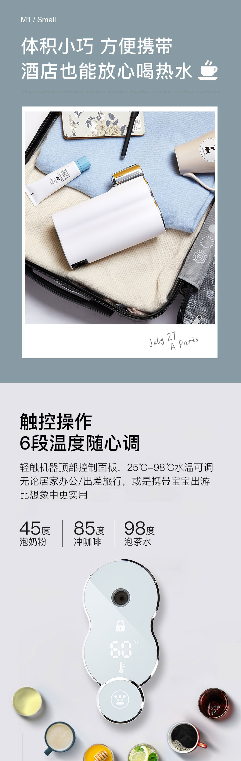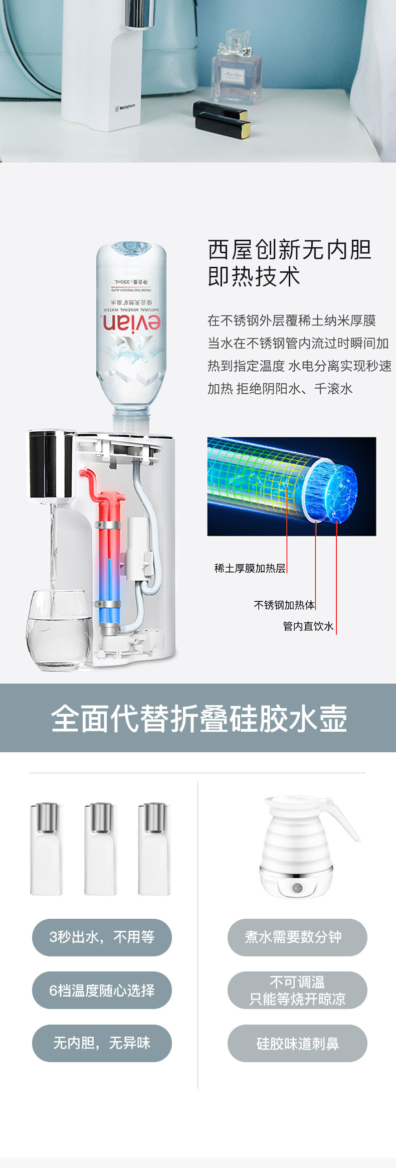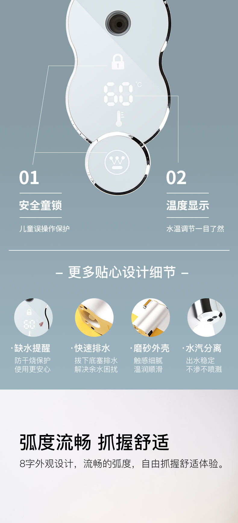 3秒即热,拒绝千滚水,旅行方便携带,随心所欲,6档调节温度,精准控温,缺水保护,安全童锁。