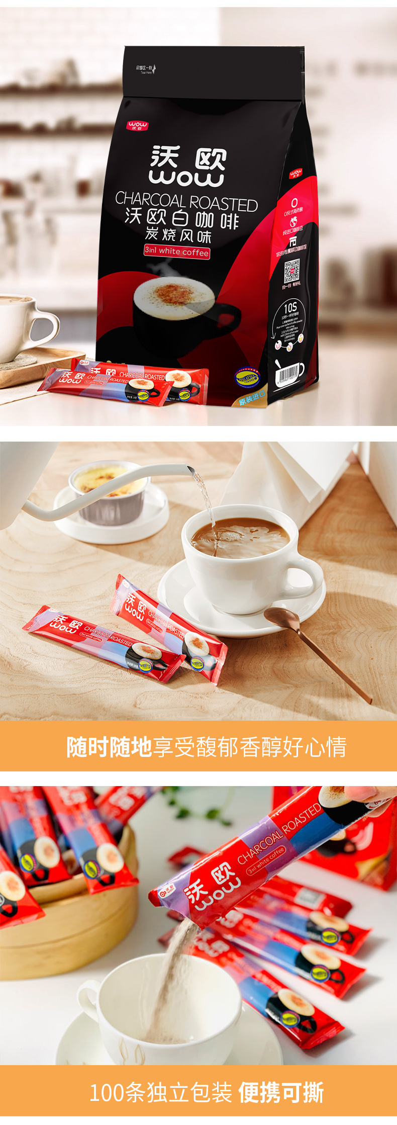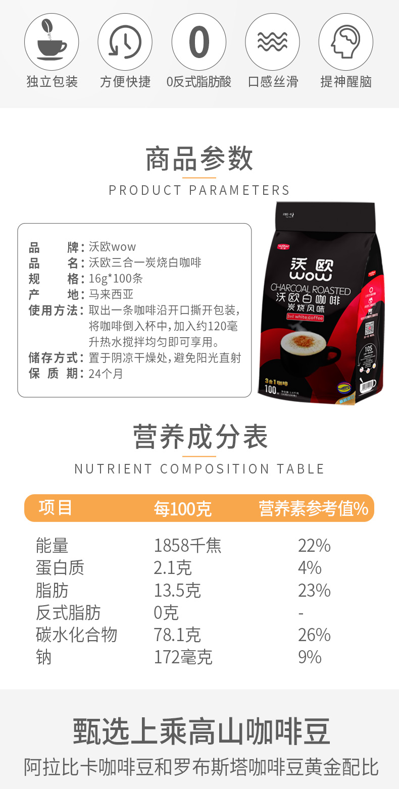 WOW马来西亚进口白咖啡 沃欧炭烧三合一速溶咖啡粉 16g*100条特浓