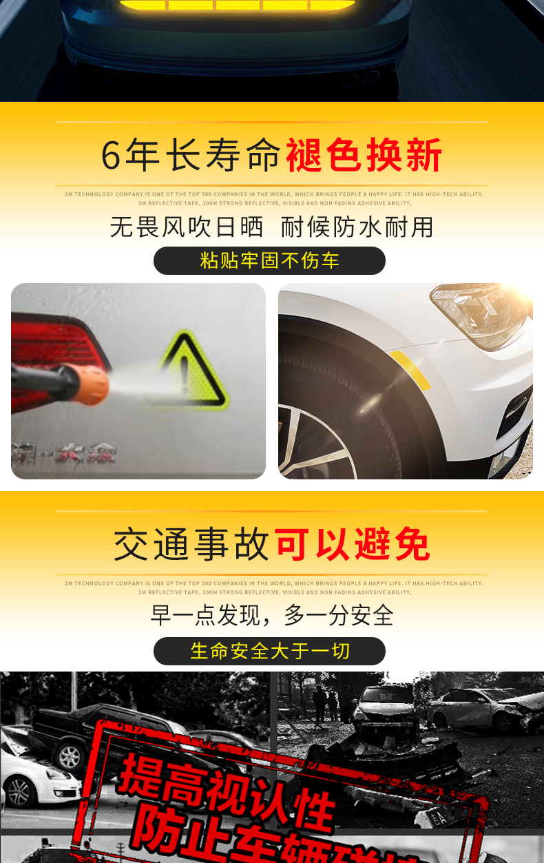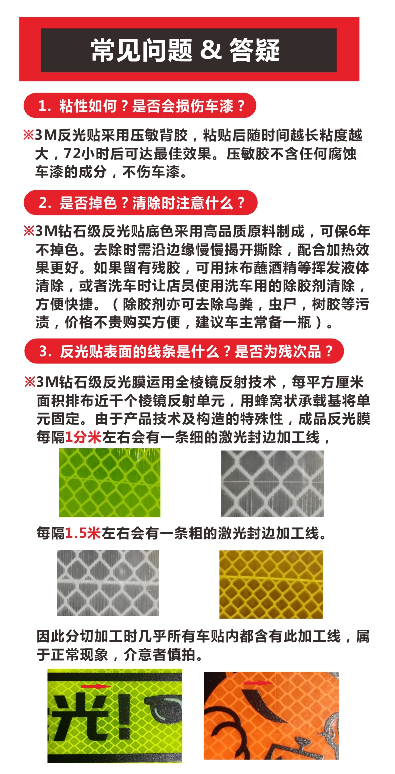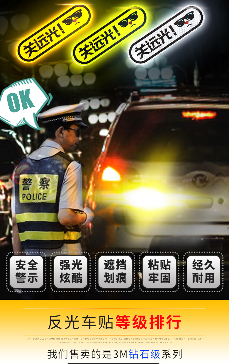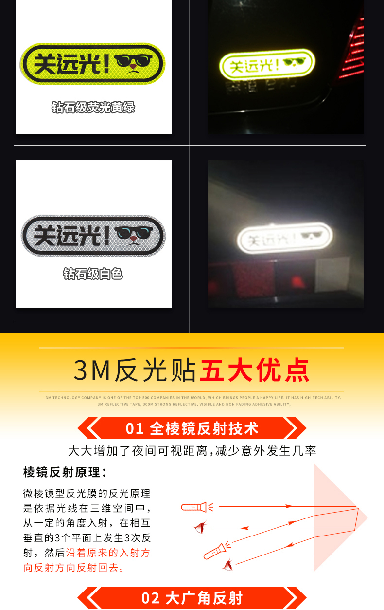 【拍一发三】采用3M.DG3钻石级反光膜制作,自带背胶,即贴即用,操作简单。广角度反光警示,超强反光,专治远光狗,保障夜晚行车安全。