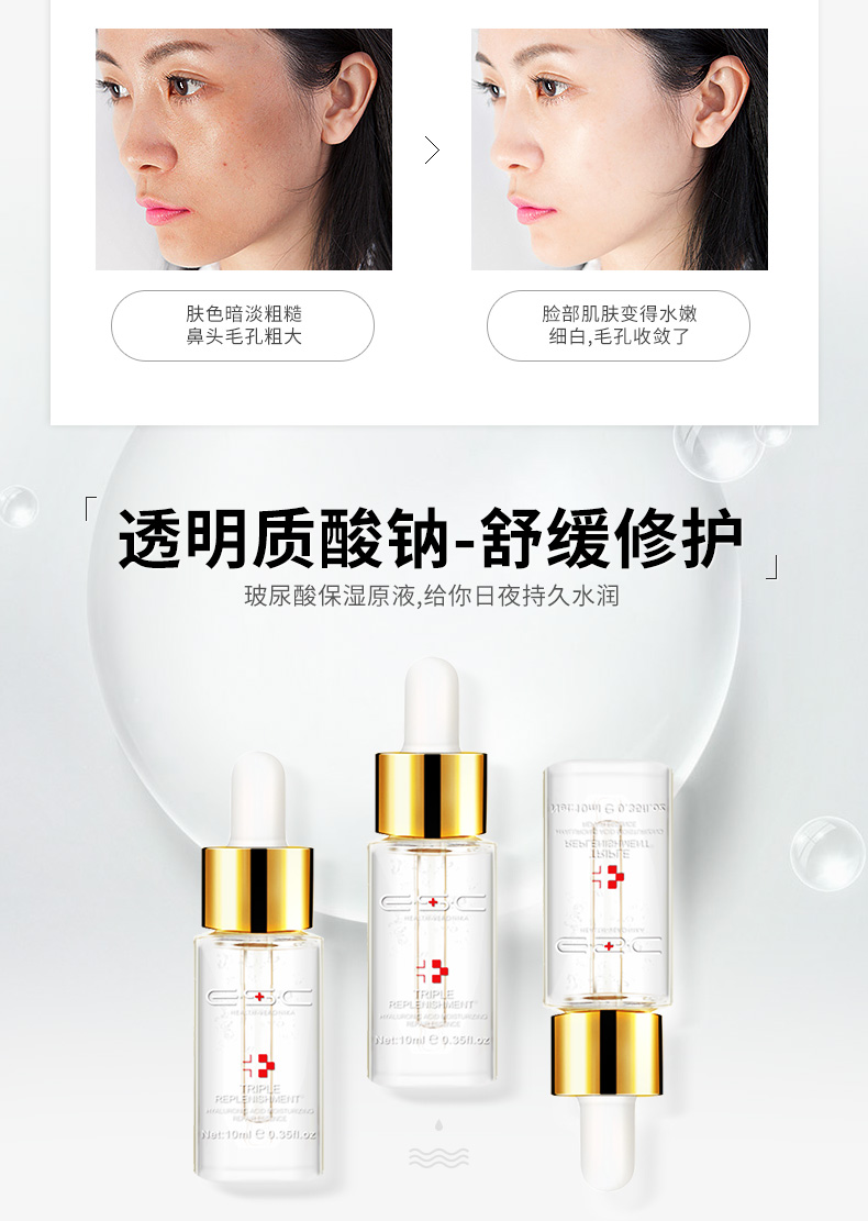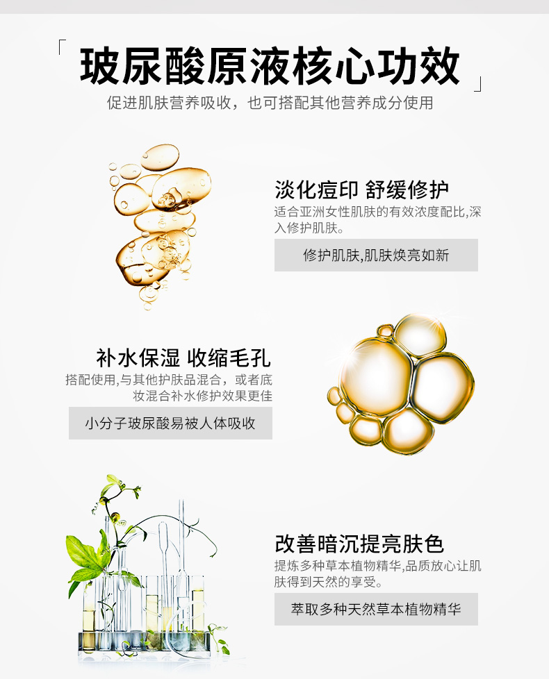 玻尿酸保湿精华原液,提拉紧致,收缩毛孔,抗皱精华,改善暗沉,保湿补水,清新控油,给肌肤持久的水润,让亲的肌肤犹如婴儿般柔嫩,您值得拥有~