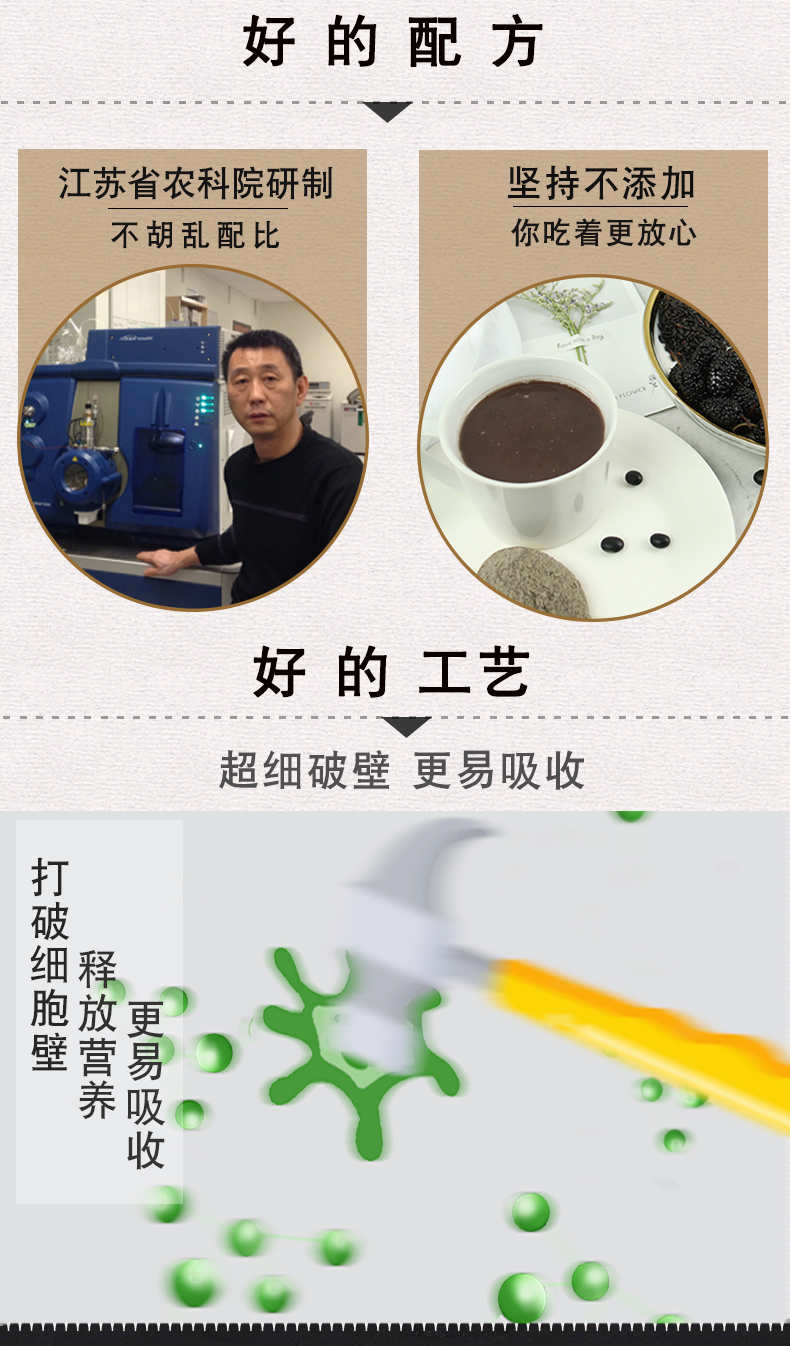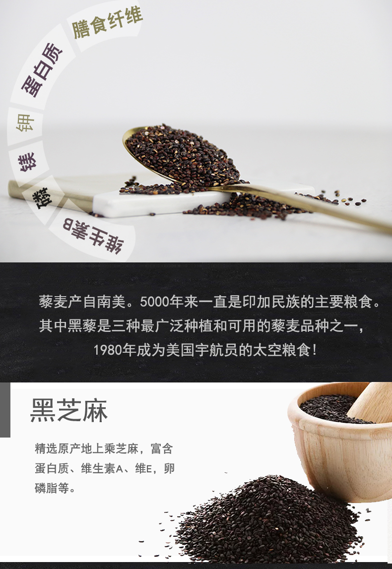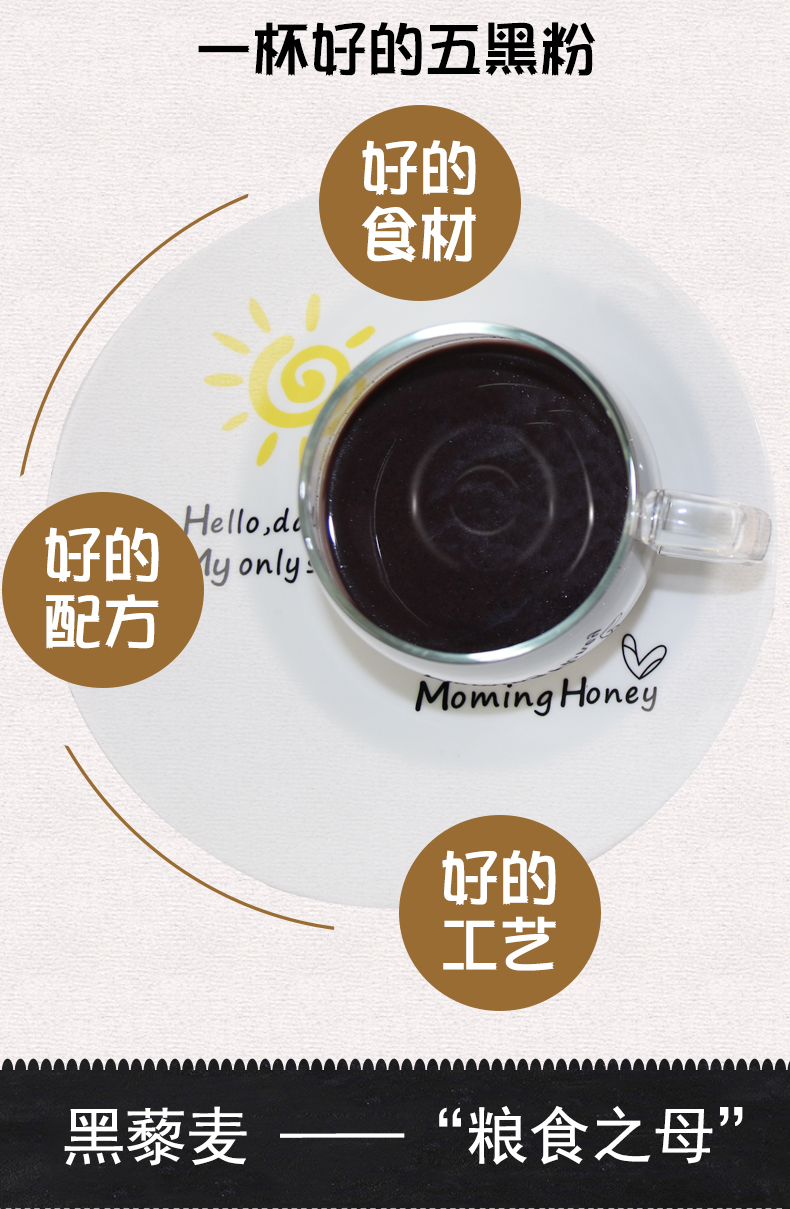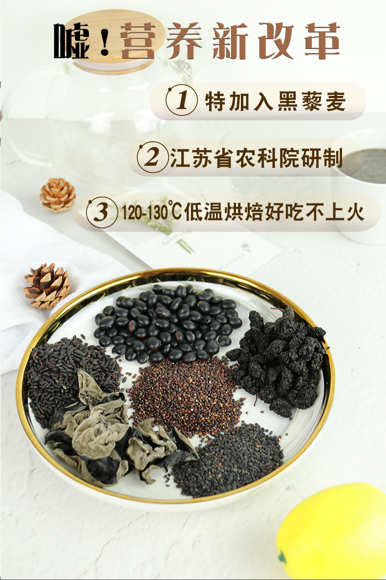 五黑代餐粉,精选黑芝麻、黑豆、黑木耳、黑桑葚、黑藜麦天然食材,配方升级,五谷颗粒饱满,富含多种蛋白质和维生素,无添加,口感香甜,美味可口,持久饱腹,营养代餐,男女老少皆宜。