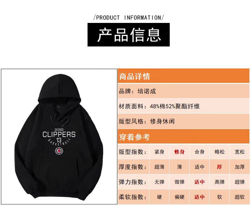 洛杉矶快船伦纳德保罗乔治篮球训练运动连帽卫衣加绒加厚长袖上衣
