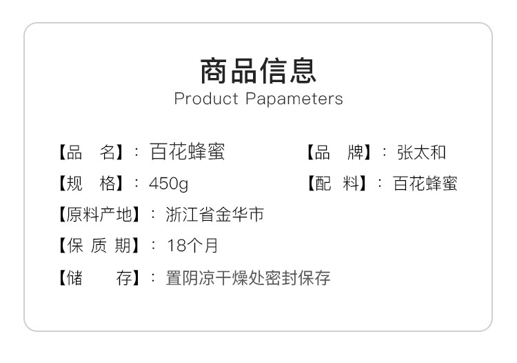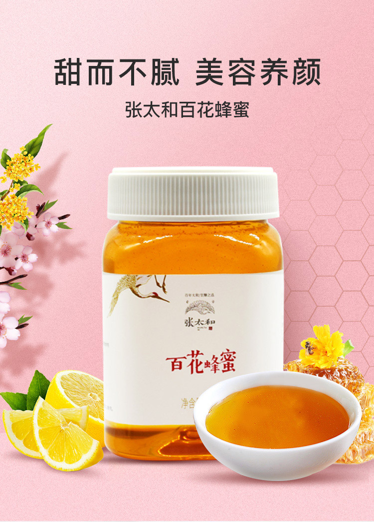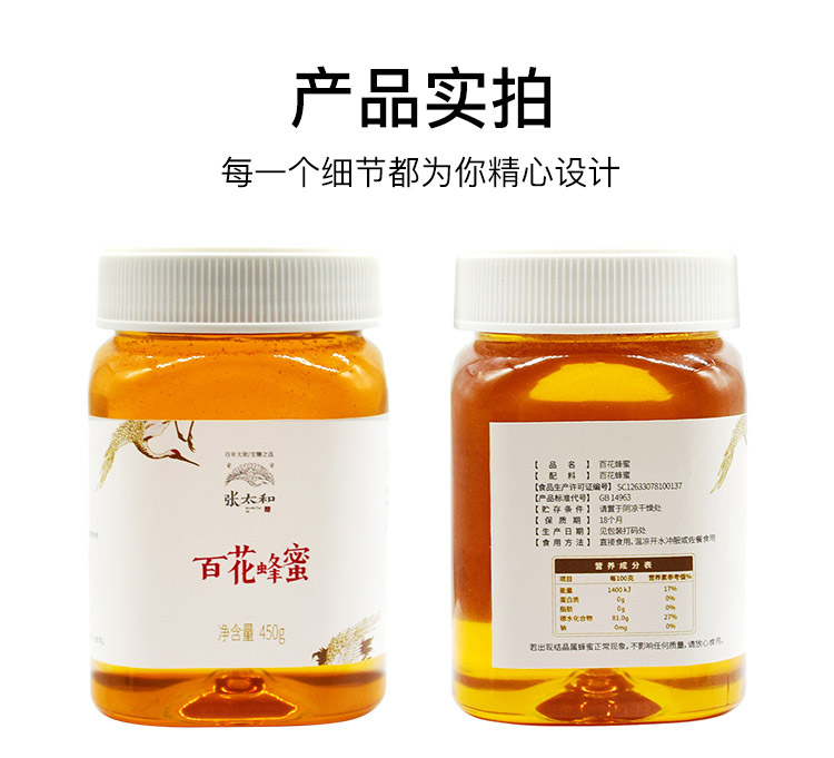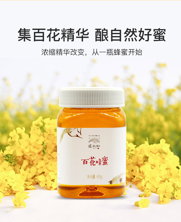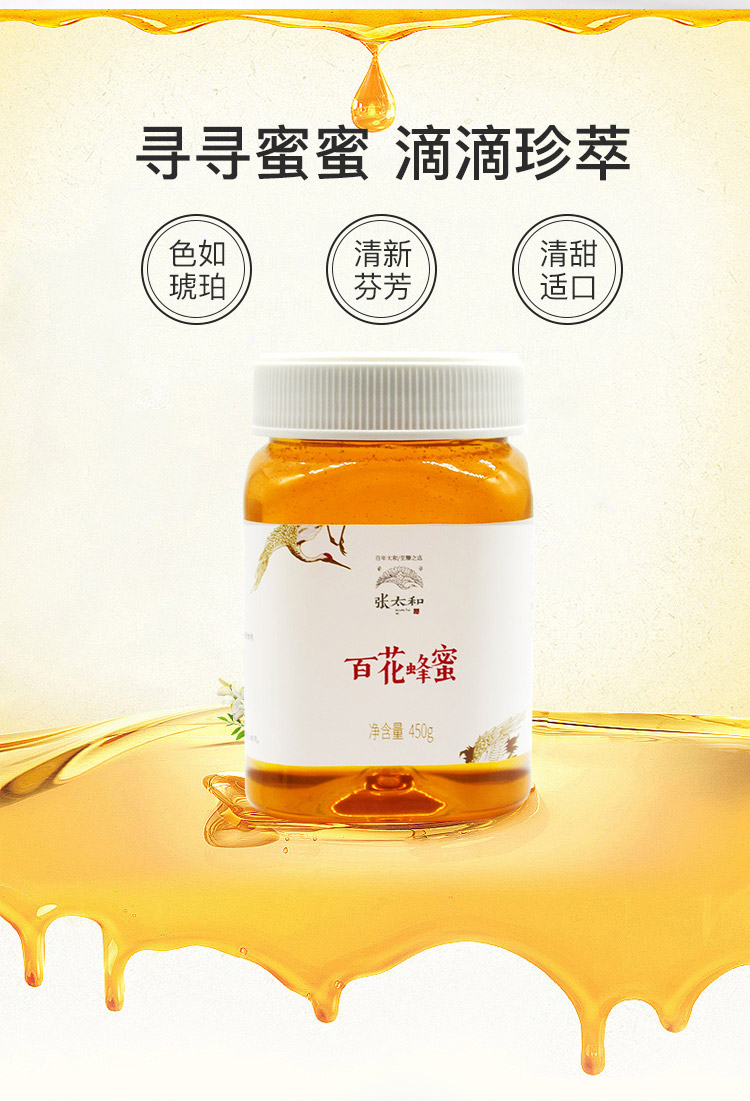 张太和百花蜂蜜450g,纯正百花蜜!无添加无污染,浓纯口感,舒顺肠道,滋养肌肤,气味清香,口感甜润,质地浓稠,自然醇香,口感清甜,营养丰富!