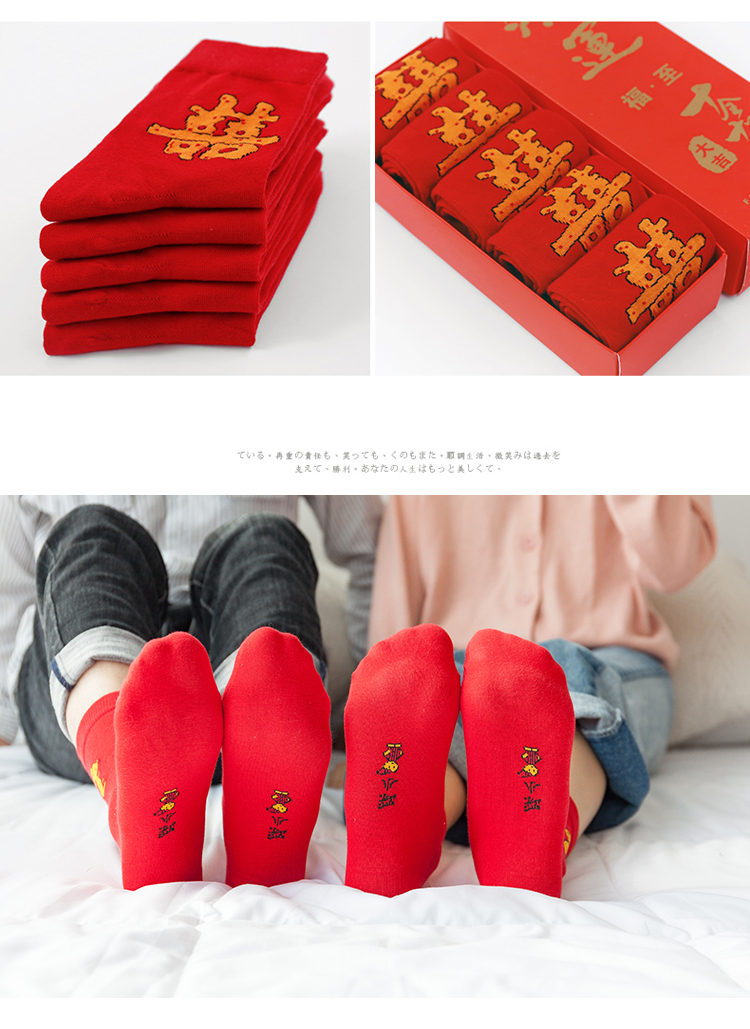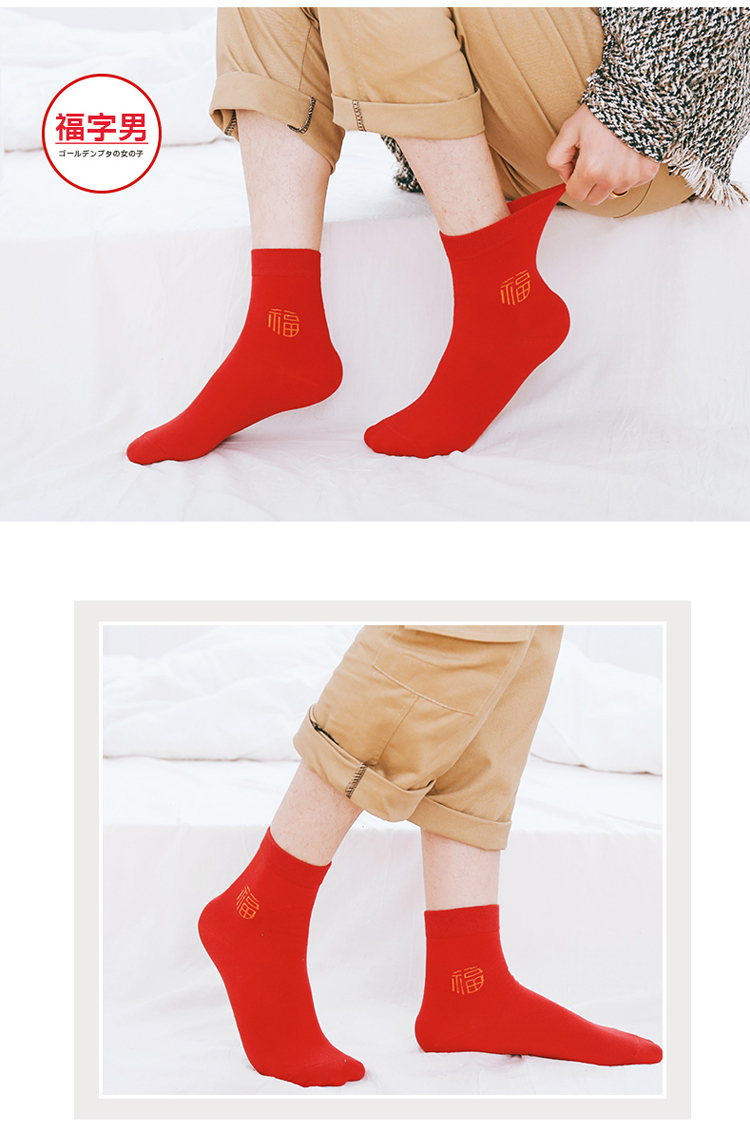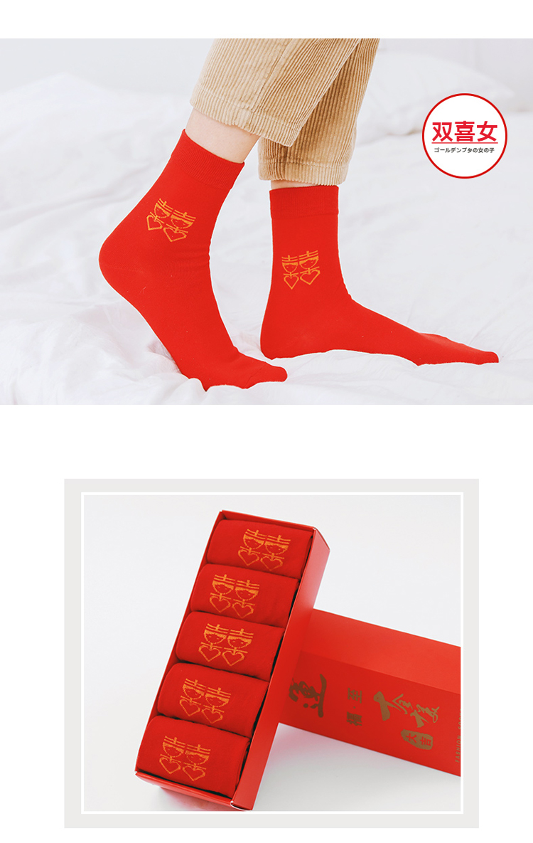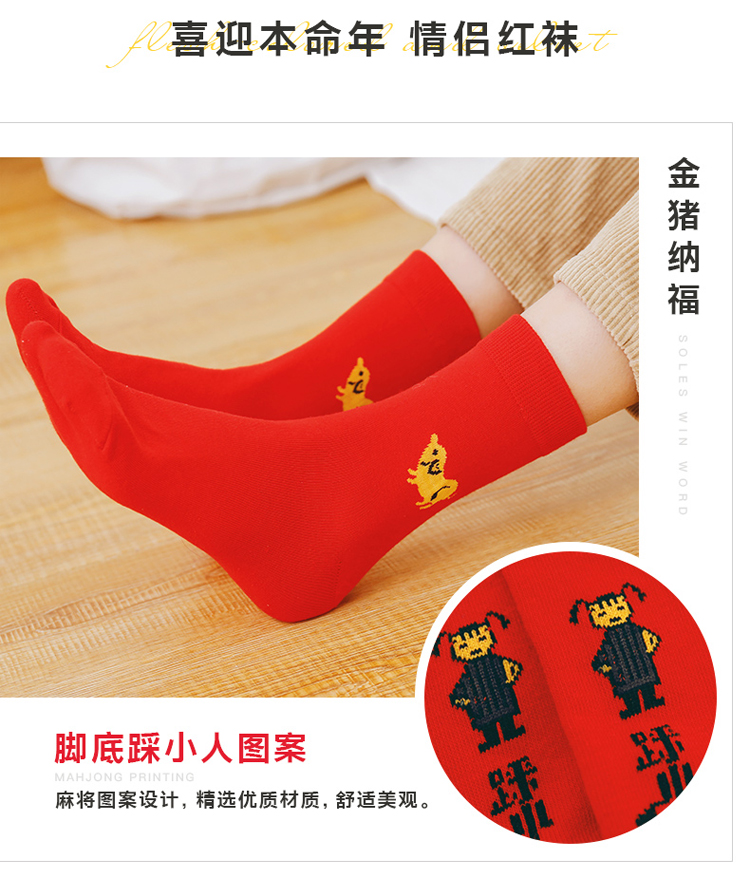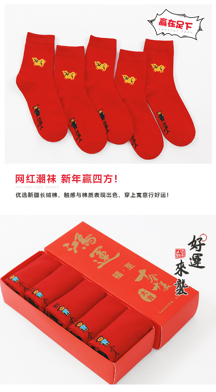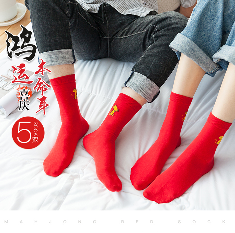 袜子2019新年红袜本命年中筒男女短袜踩小人袜5双礼盒装袋装全棉
