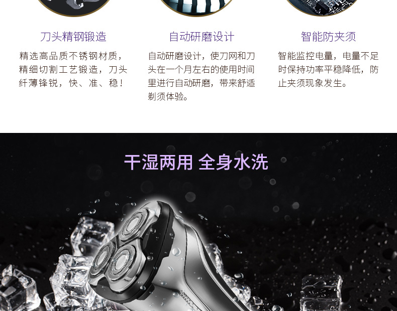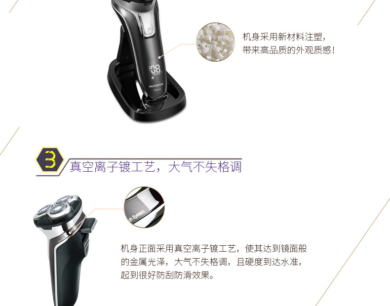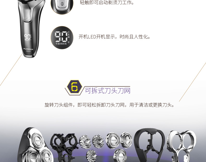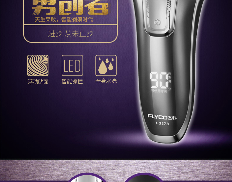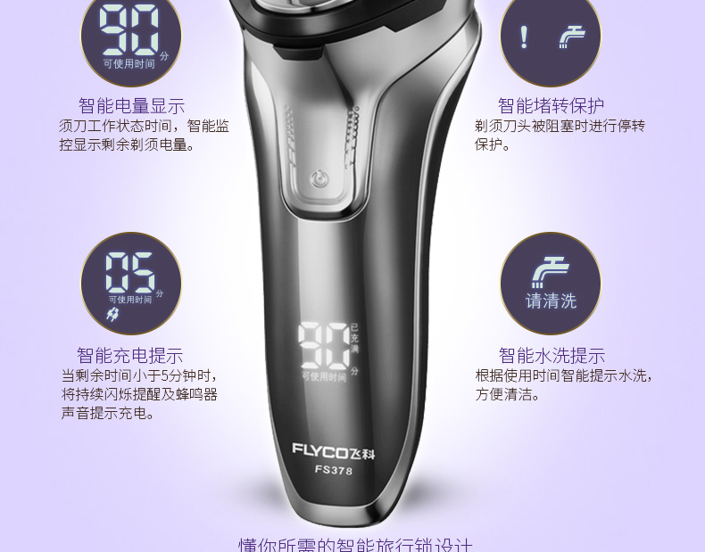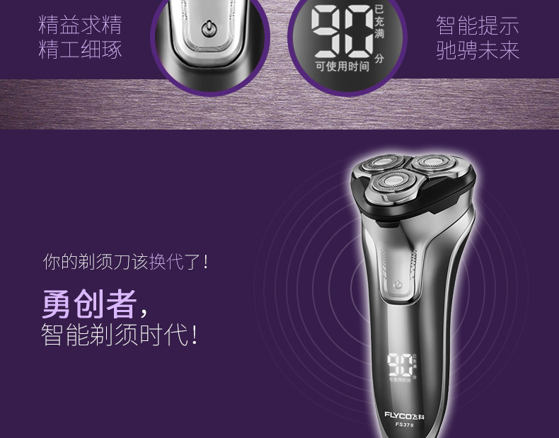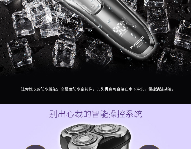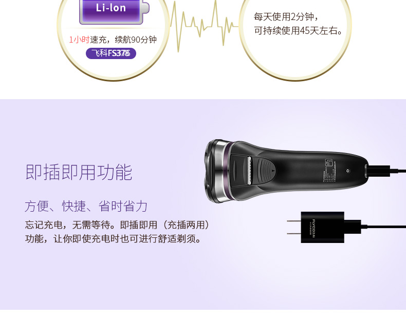 全身水洗,可车载USB充电,1小时快充,三头浮动贴面剃须,智能电量显示,智能防夹须,全国联保2年,90天有问题包换,飞科品牌值得信赖