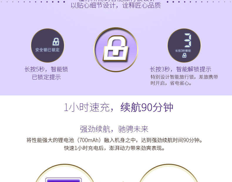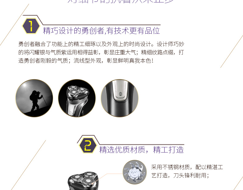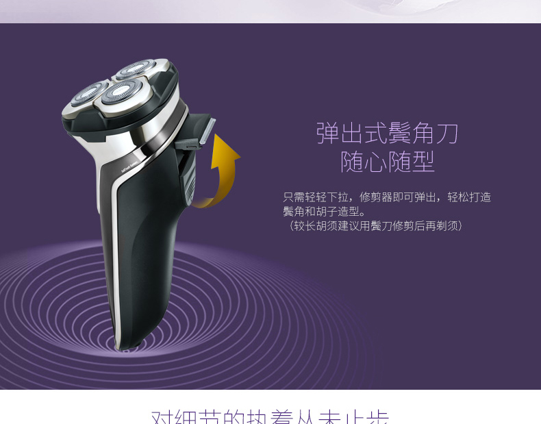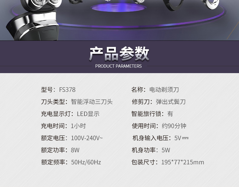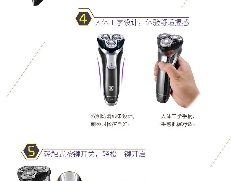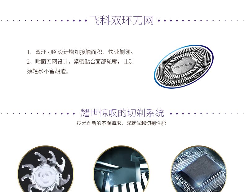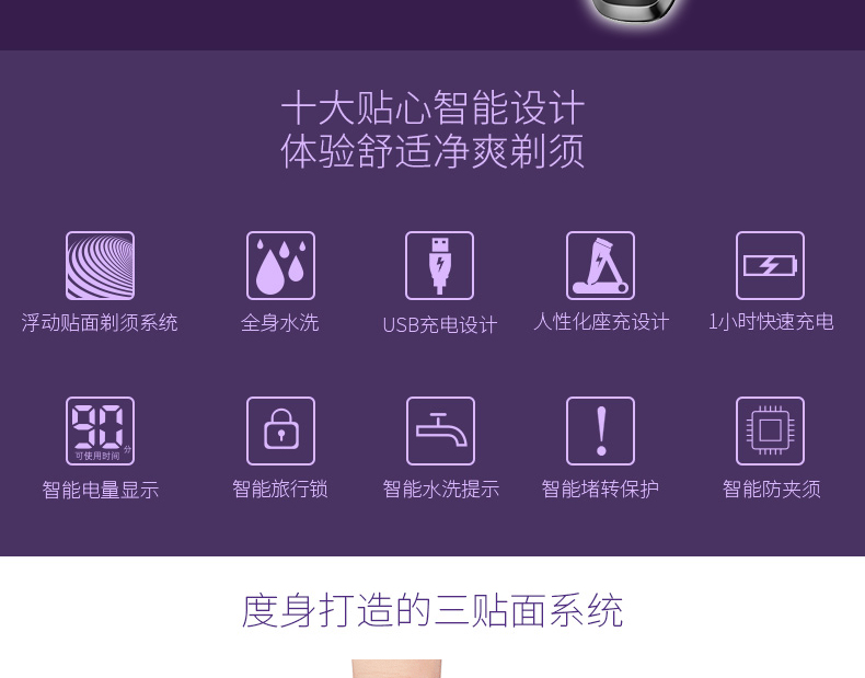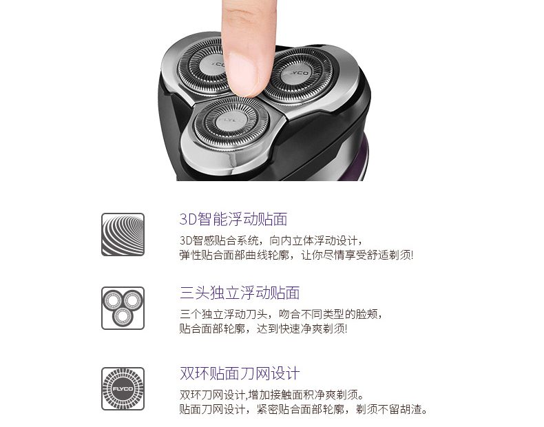 全身水洗,可车载USB充电,1小时快充,三头浮动贴面剃须,智能电量显示,智能防夹须,全国联保2年,90天有问题包换,飞科品牌值得信赖