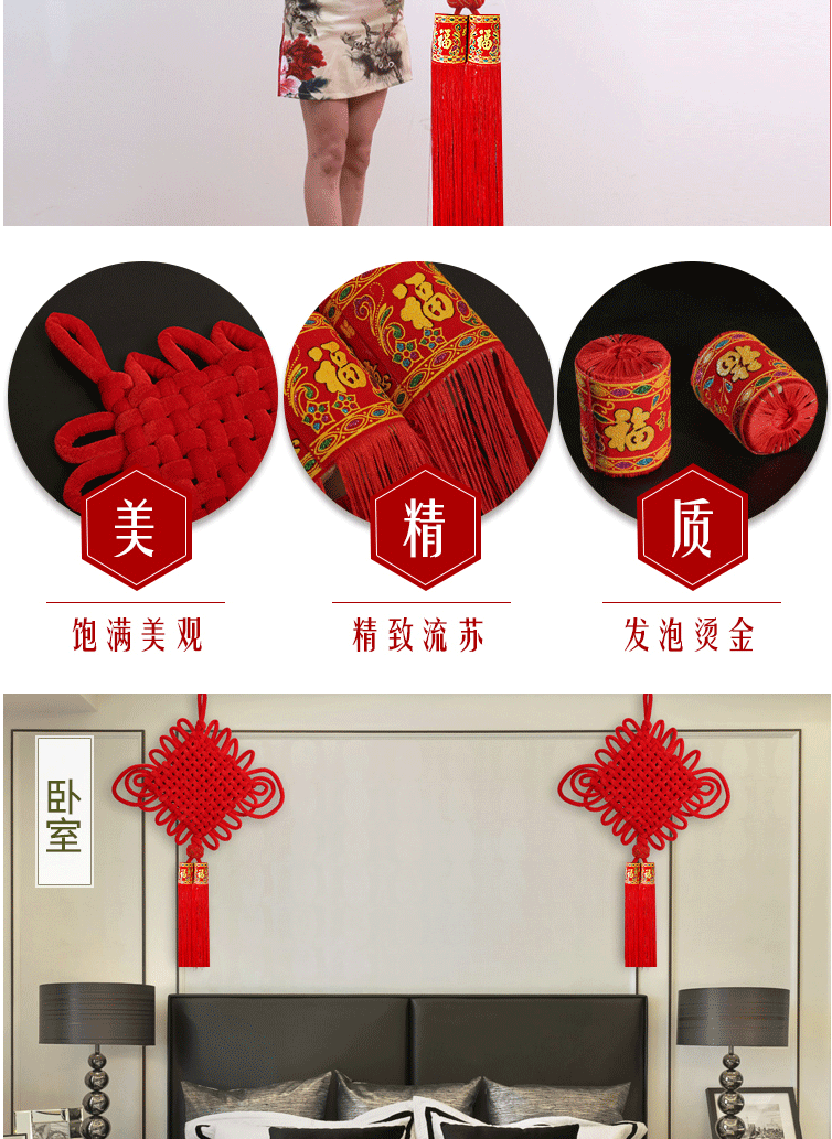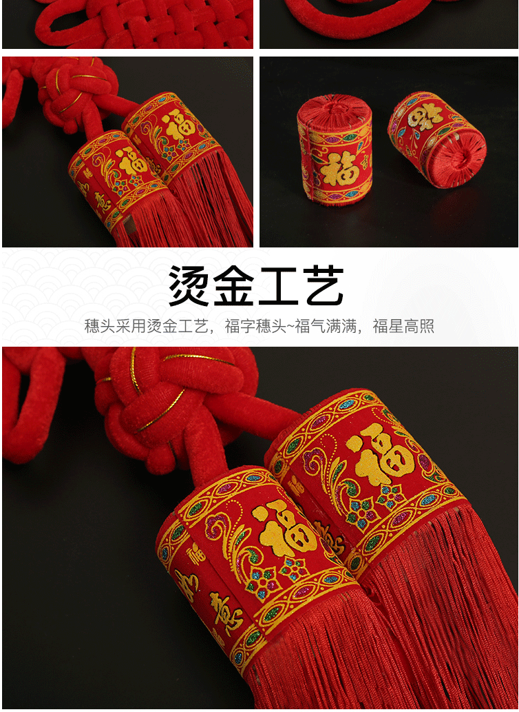 每家每户都少不了的吉祥物,纯手工编织,精制流苏,发泡烫金工艺,福气满满!福星高照!颜色亮丽鲜艳,浓郁的中国风,让家时刻充满喜庆气息!