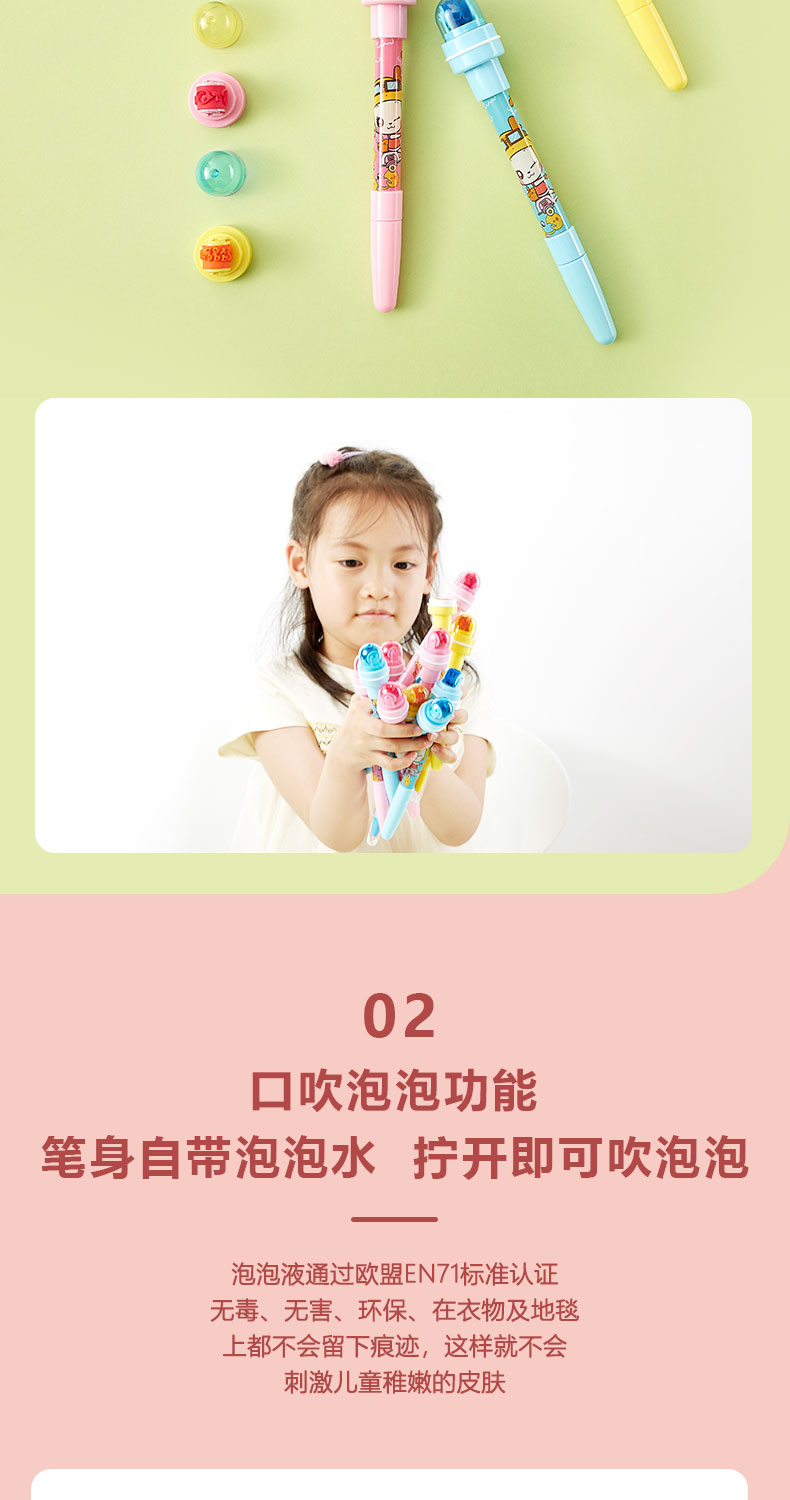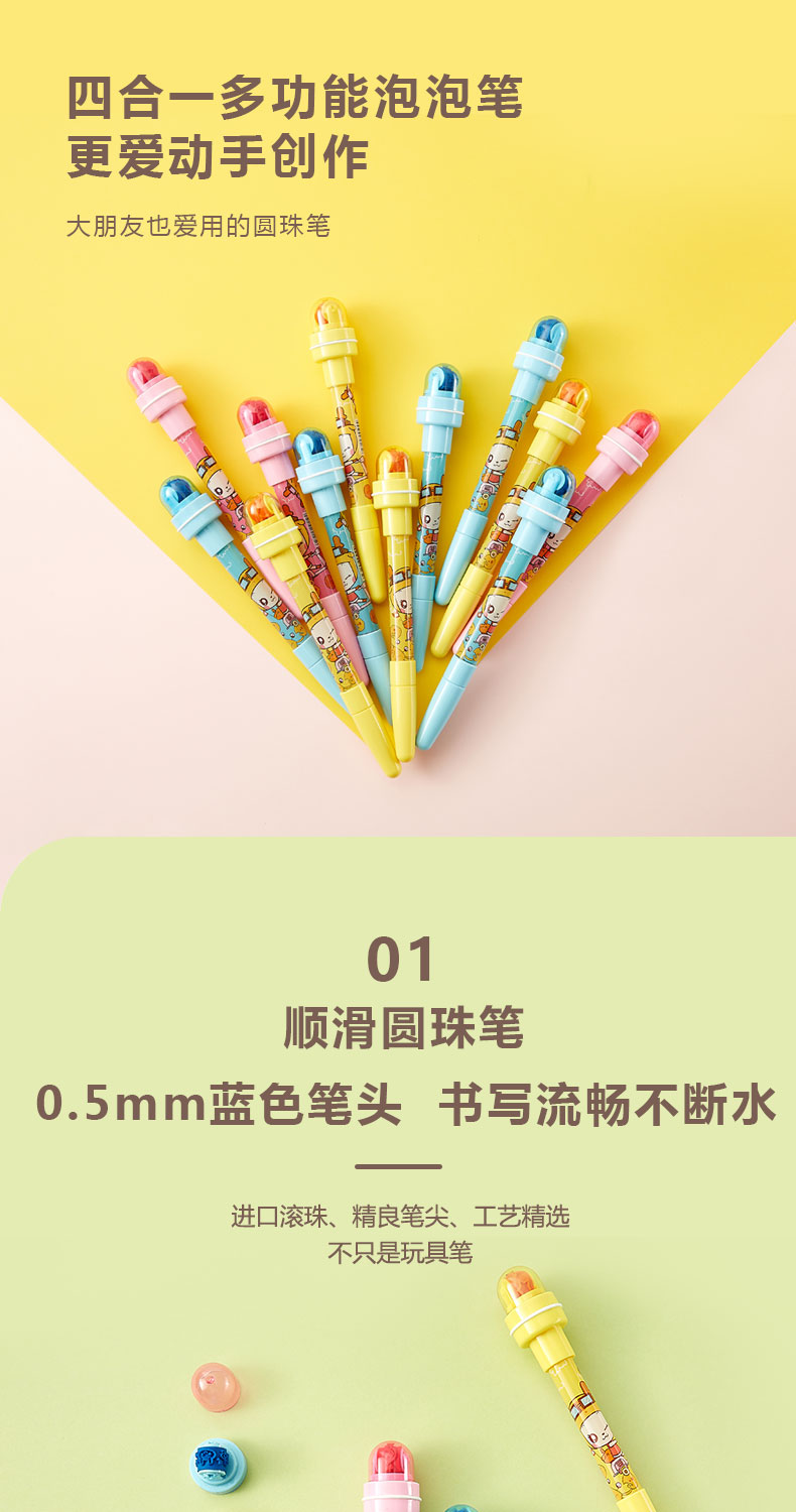 四合一多功能泡泡笔,更爱动手创作,顺滑圆珠笔,0.5mm蓝色笔头,书写流畅不断水,进口滚珠,精良笔尖,工艺精选,不只是玩具笔。