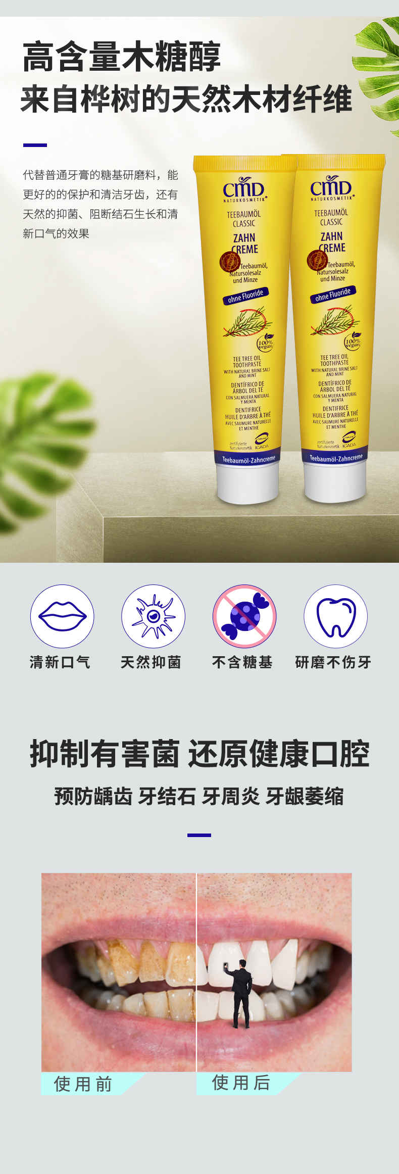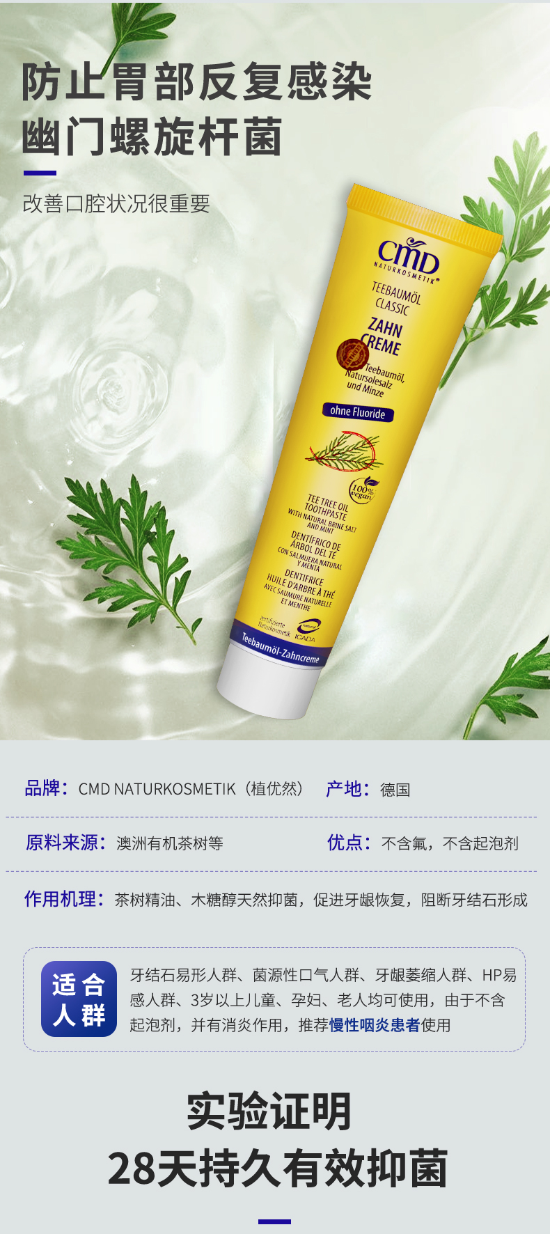 德国进口CMD植优然有机天然茶树油牙膏净化口腔,亮白牙齿,高效,快捷,安全,纯天然植物甙,持久清新,美白牙齿不费力,清新口气,幸福微笑!