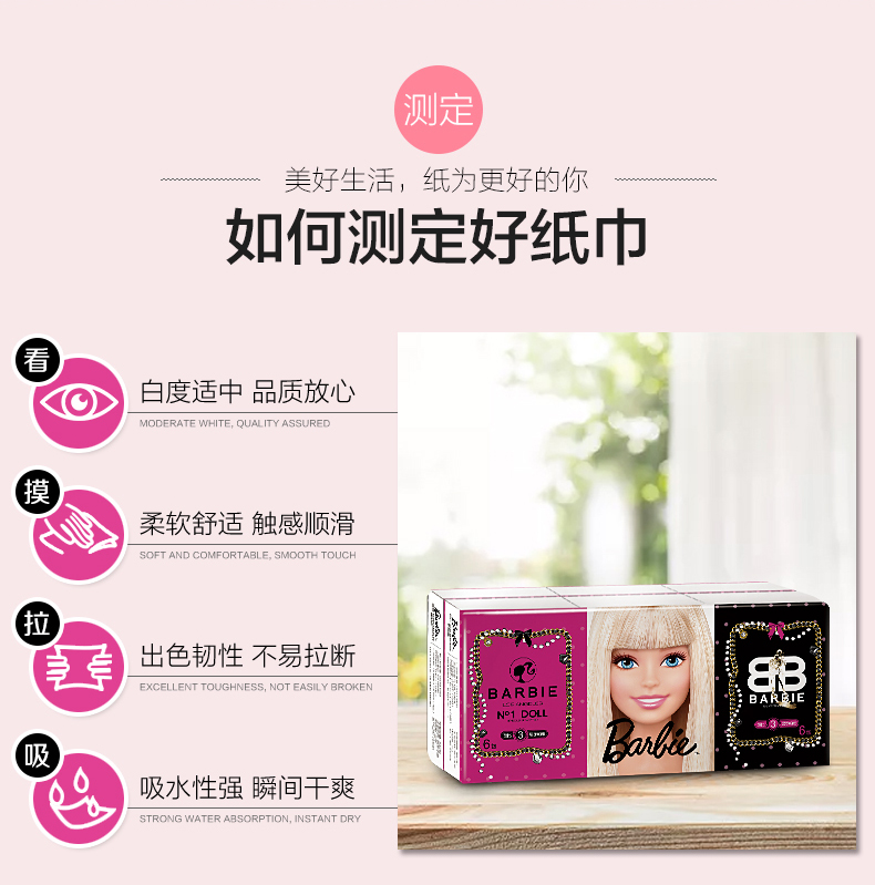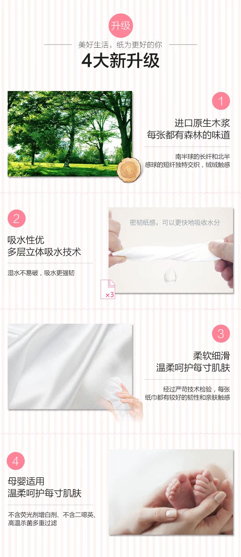 进口木浆,细致绵柔,不含荧光剂,柔软细滑,多层立体吸水技术,湿水不易破,专业检测,食品级安全标准,母婴适用。