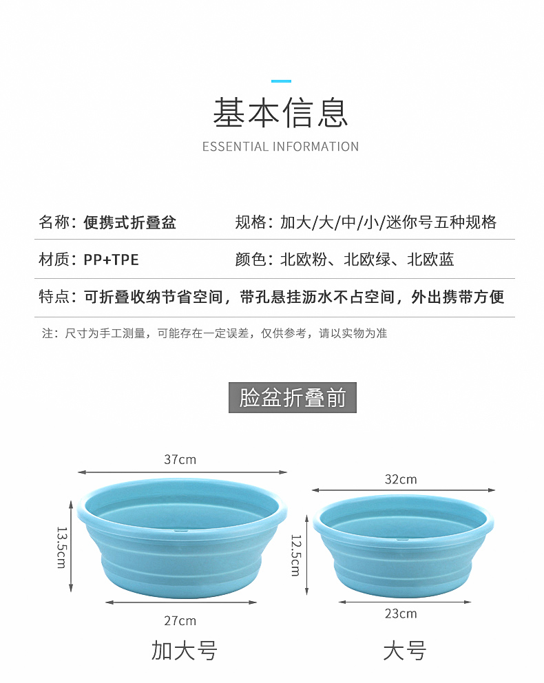 【下单送挂钩】抖音爆款,出口欧洲折叠脸盆,一体成型无缝隙,做工精致,实用安全,收纳方便,易于携带,洗脸、洗衣服、洗蔬菜,户外、旅行必备,再也不用担心宾馆的洗脸盆脏了