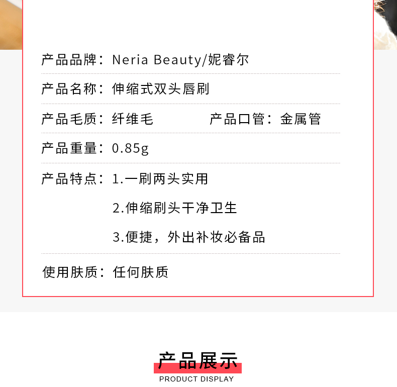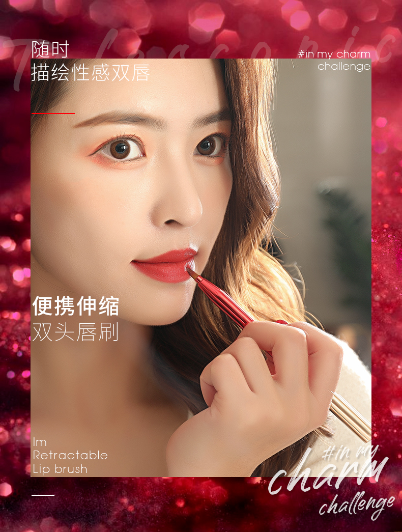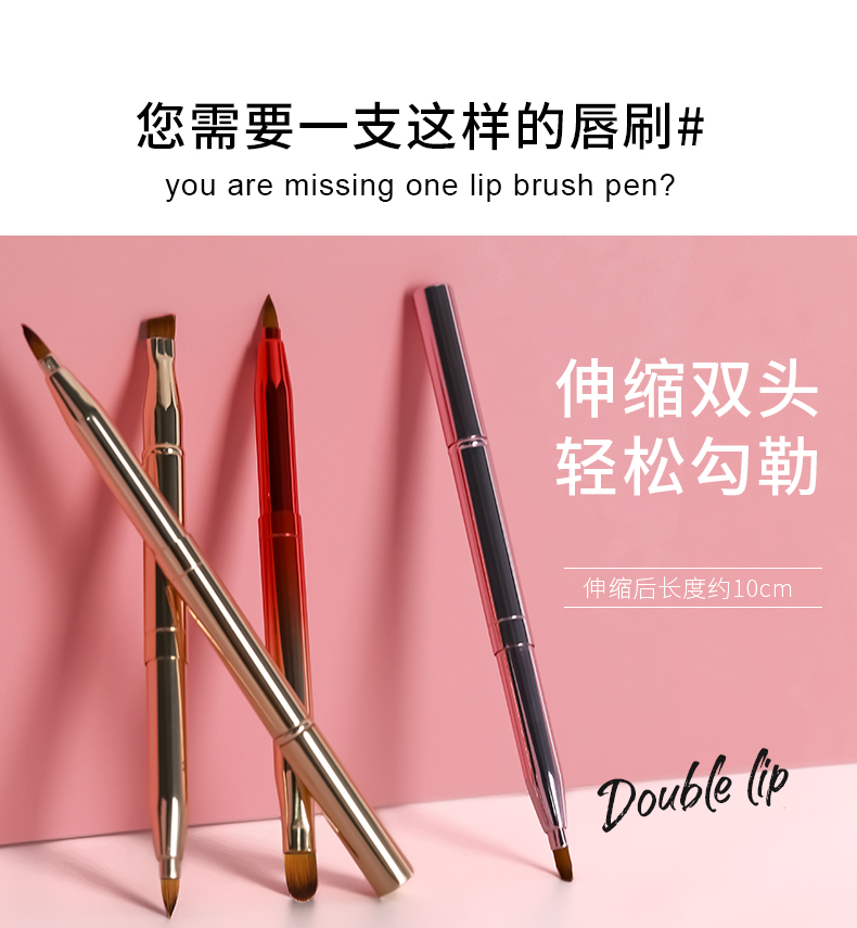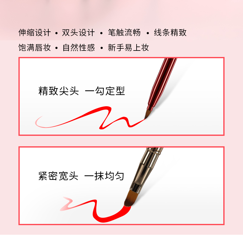 【女神必备单品】双头唇刷,扁平刷头自然贴合唇形,纤维刷毛,细腻柔软,自动封口,伸缩便捷,一笔多用,可做唇刷,眼影刷,眼线笔,遮瑕刷等,小巧便携,优雅随行,多款颜色可选。