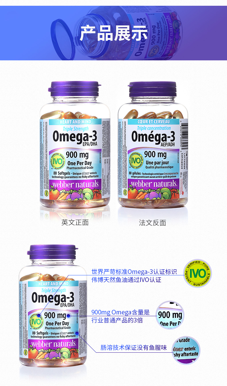 WN伟博天然浓缩Omega-3深海鱼油健脑调节血脂血压1425mg*80粒*2瓶