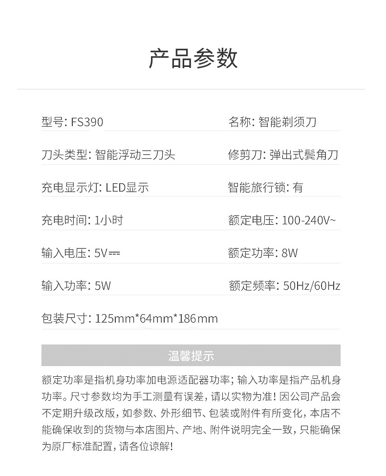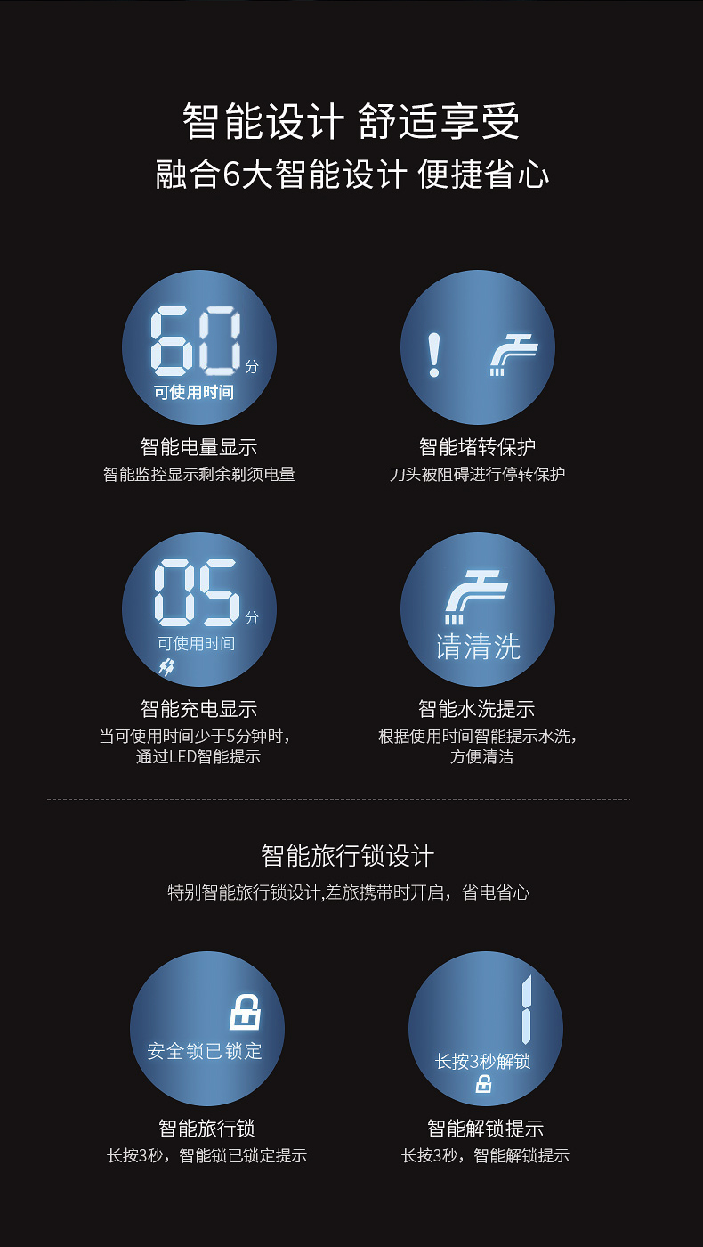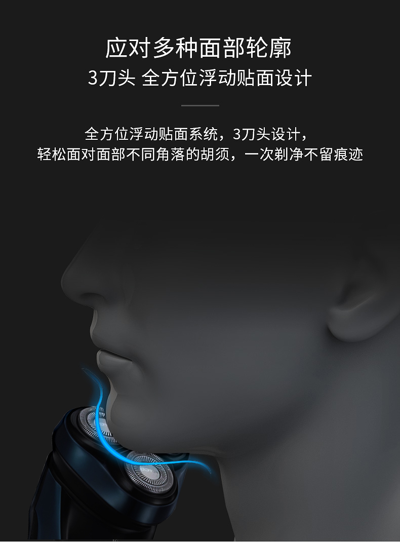 3D智感浮动,双环贴面刀网,智能显屏,全身水洗,1小时快充智能操控系统。电动充电式刮胡刀,全国联保