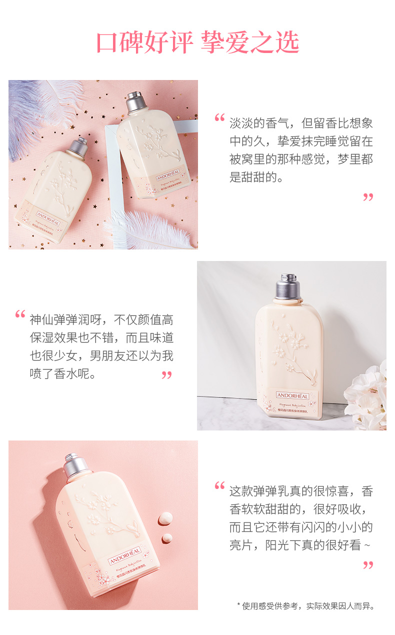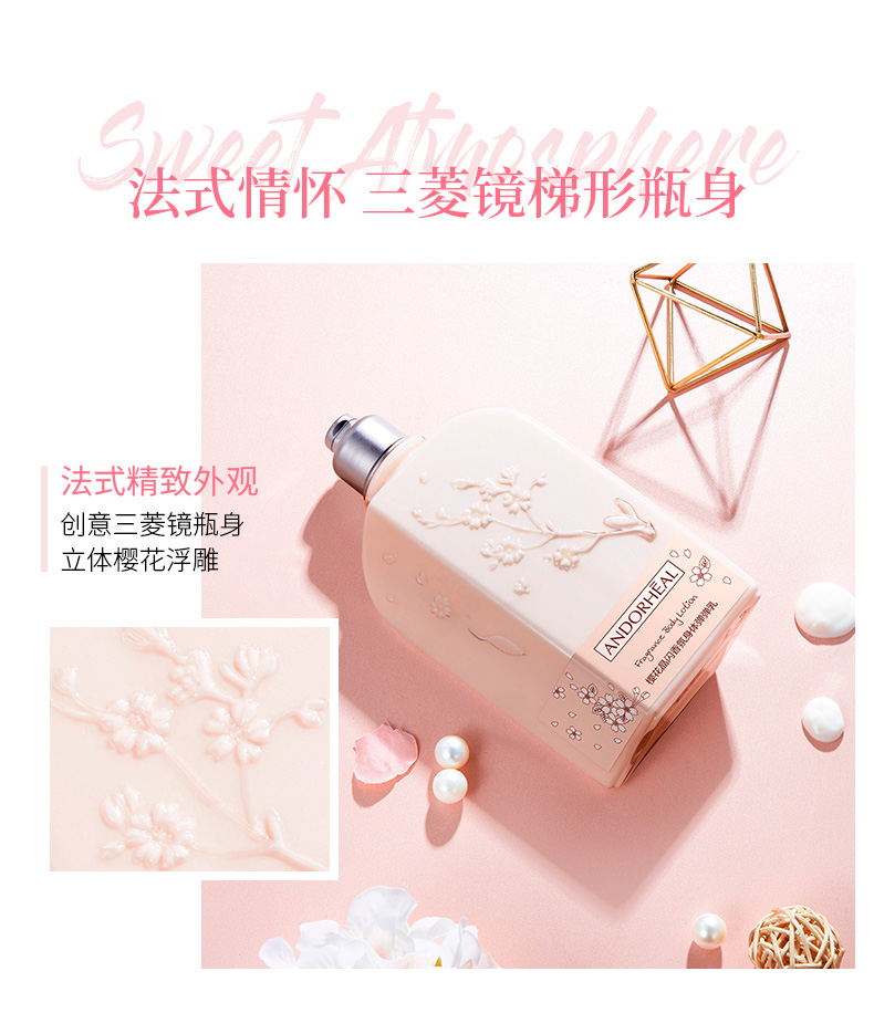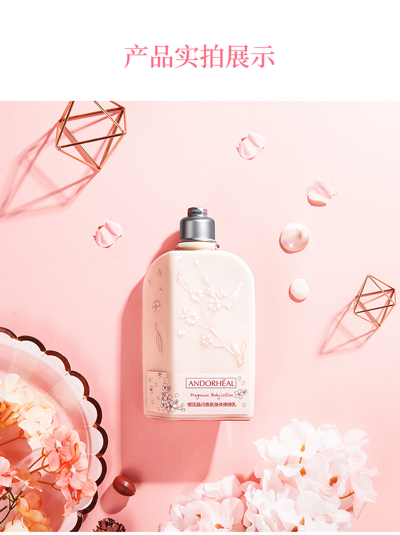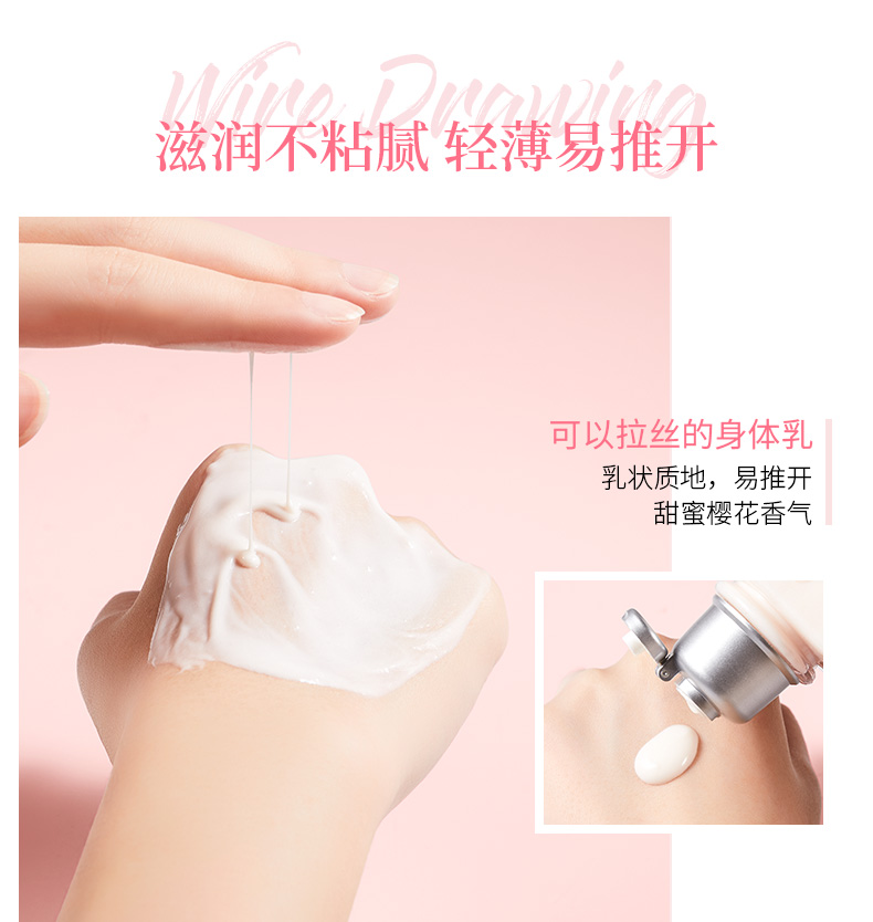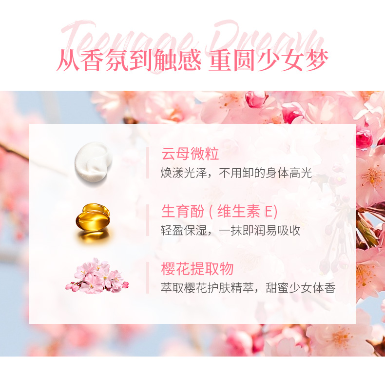天然云母微粒,自带细微金闪,涂抹后就像给身体打了高光一样,含有维生素E、胶原蛋白成分滋润每一寸肌肤,拉丝弹力质地,法式樱花香氛,让你拥有初恋般的少女神味道~