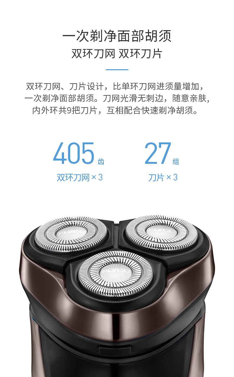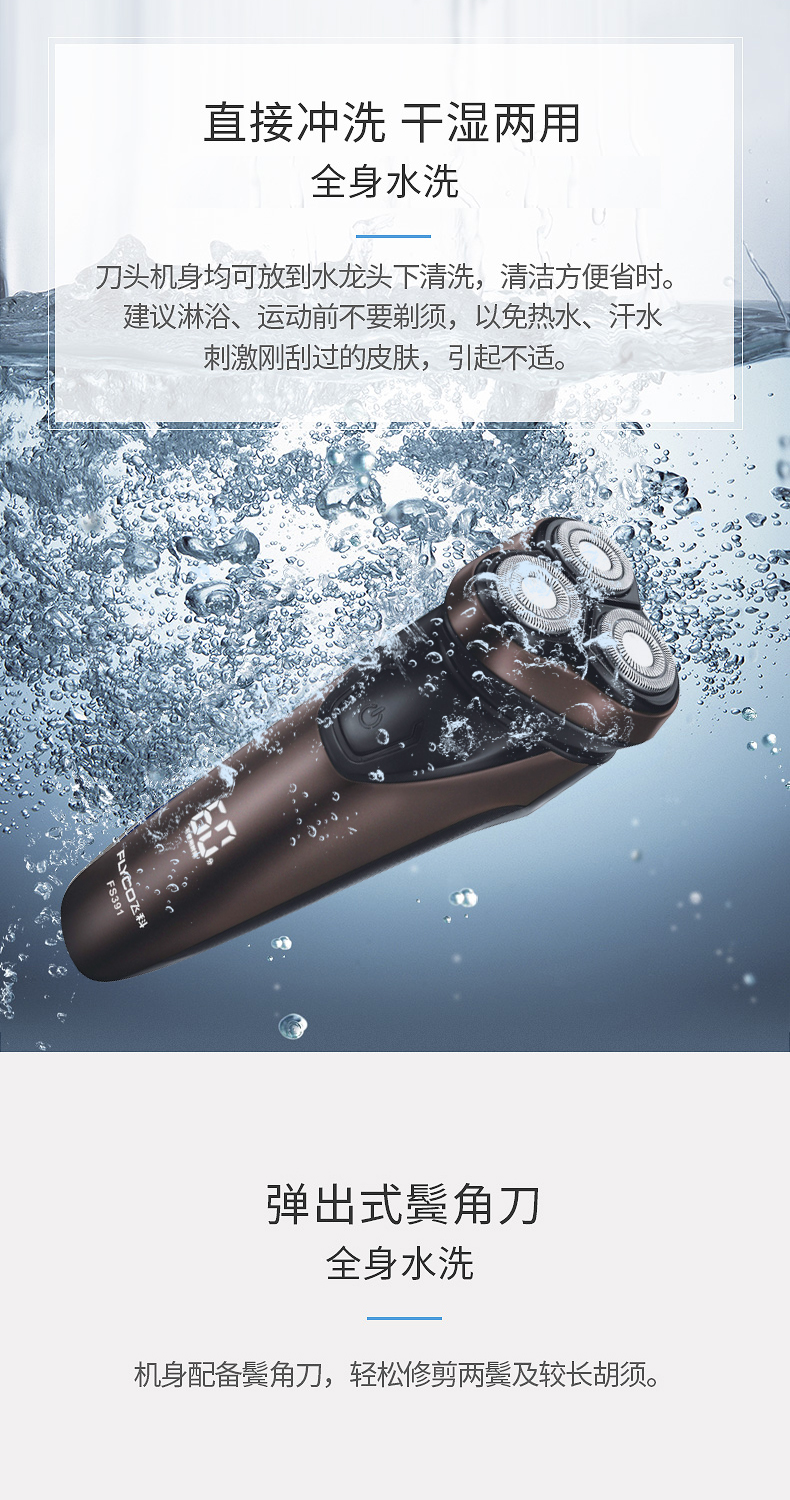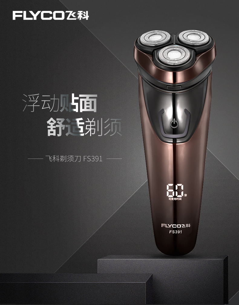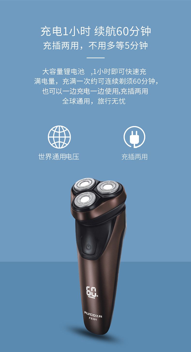 新品上市,1小时快充,IPX7防水,智能电量显示,全身水洗,三头浮动贴面剃须,智能防夹须,自动研磨刀头,弹出式修剪鬓刀,超长待机,两年保修,飞科品牌值得信赖。